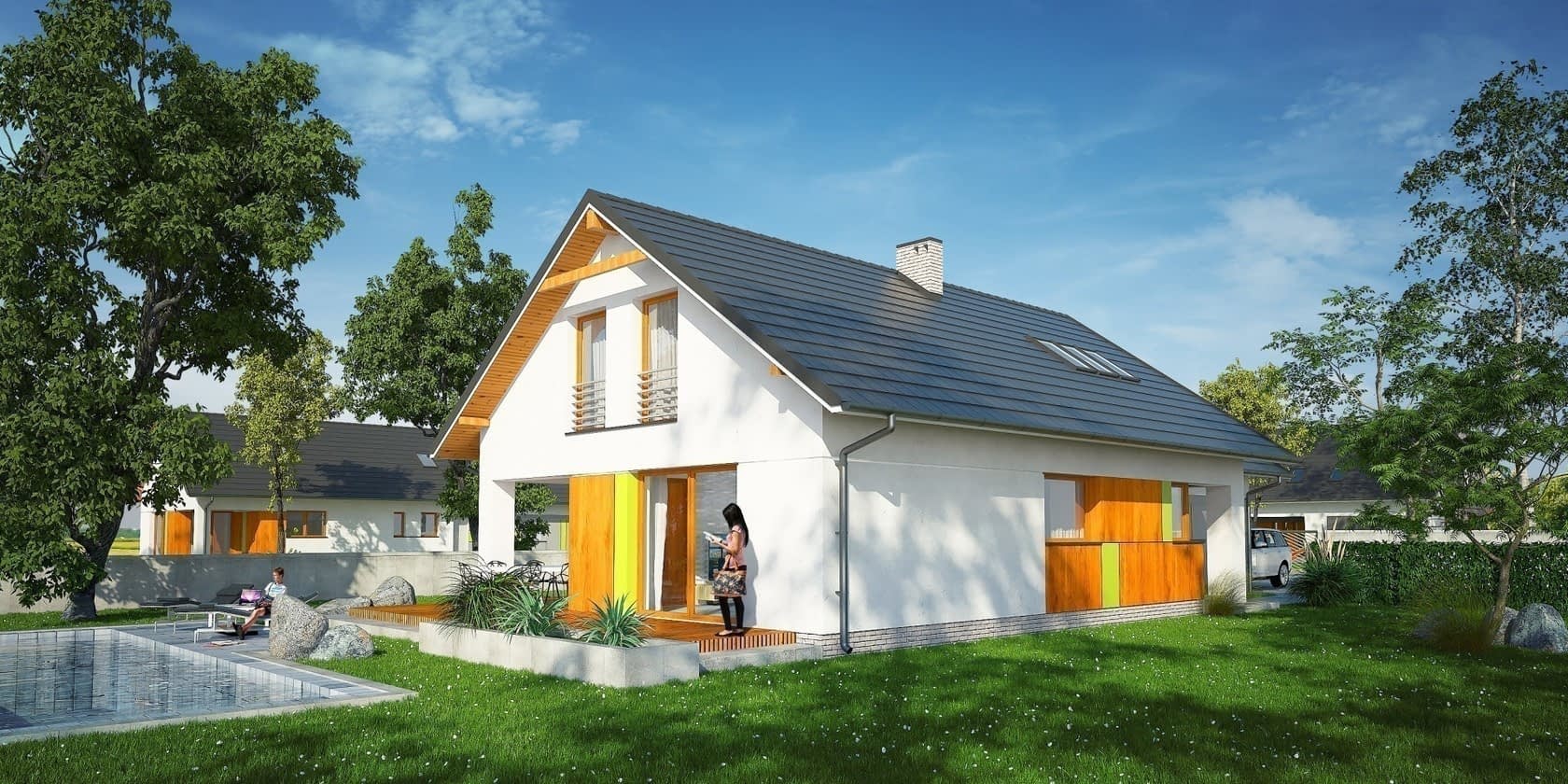 Dom jednorodzinny, wolnostojący, niepodpiwniczony z poddaszem użytkowym i garażem dwustanowiskowym. Idealny na wąskie działki. Gabinet na parterze może być również wykorzystany jako pokój dla gości.