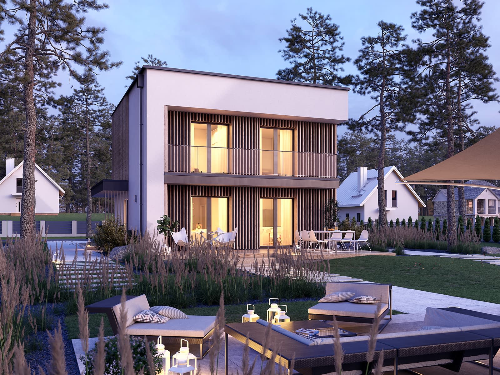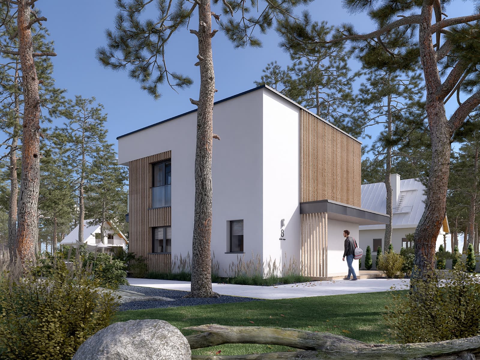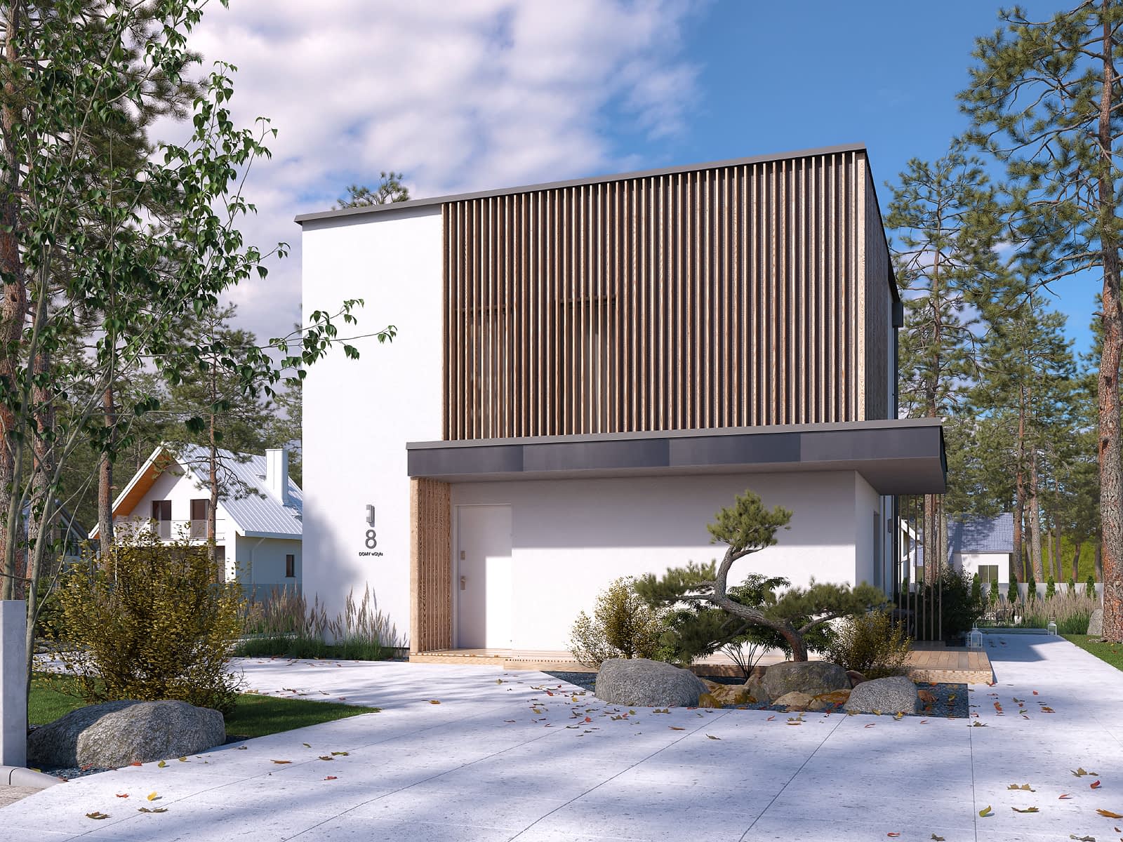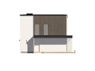 Lopra 3 to nowoczesny projekt piętrowego domu, którego nieduża powierzchnia zabudowy poniżej 70 m2, umożliwia jego realizację bez pozwolenia na budowę. Prosta bryła budynku z płaskim dachem zyskuje na atrakcyjności, dzięki zastosowaniu różnorodności materiałów wykończeniowych. Układ funkcjonalny w projekcie został podzielony pomiędzy dwie kondygnacje. Strefa dzienna została zaprojektowana na parterze i składa się z salonu, jadalni oraz kuchni. Wysokie przeszklenia w części dziennej dobrze doświetlają wnętrze oraz łączą je ze strefą wypoczynkową na tarasie. W kuchni zaprojektowano długi blat roboczy oraz półwysep z barkiem śniadaniowym. Strefa nocna na piętrze składa się z dwóch sypialni oraz łazienki. Obie sypialnie mają dostęp do wspólnego balkonu od strony ogrodu, który stanowi jednocześnie zadaszenie tarasu na parterze.Konstrukcja