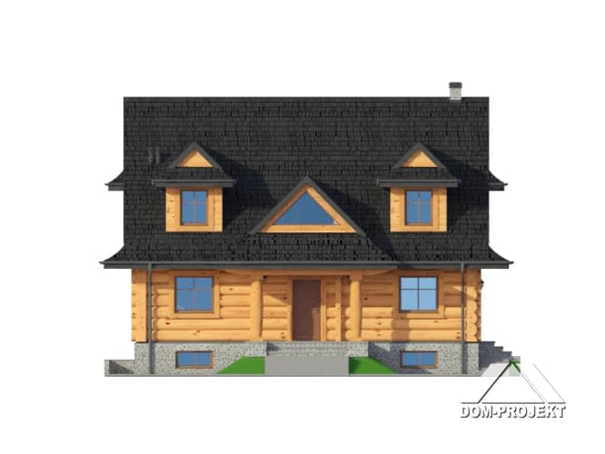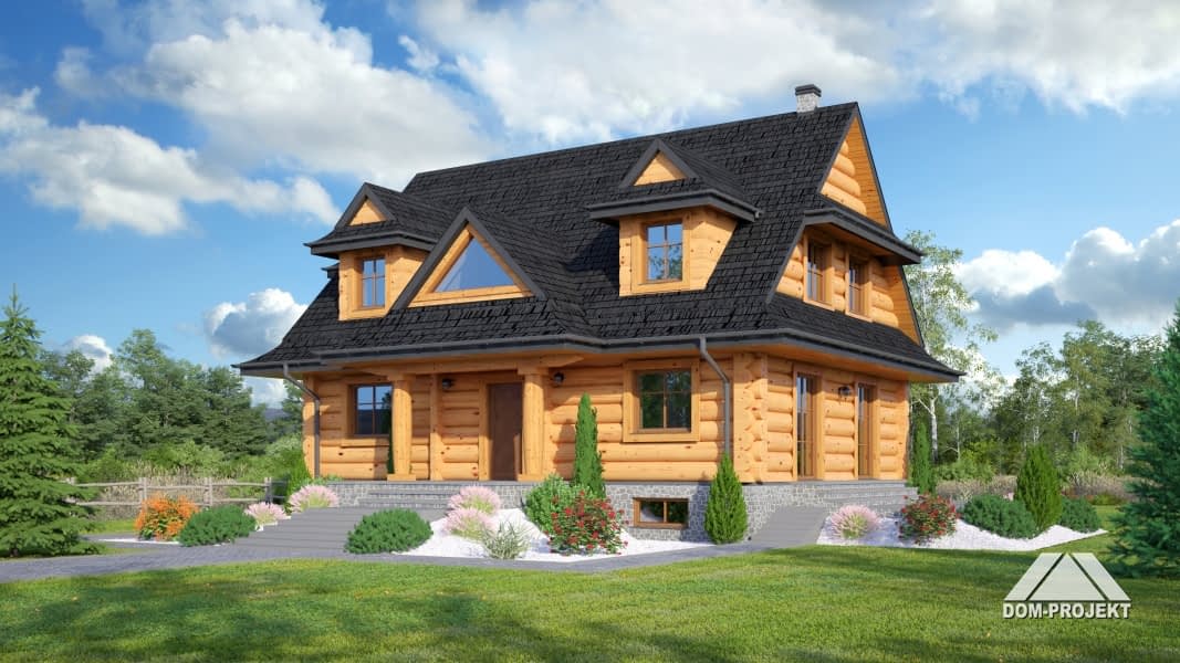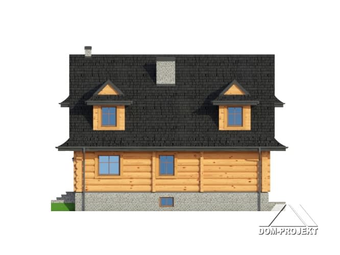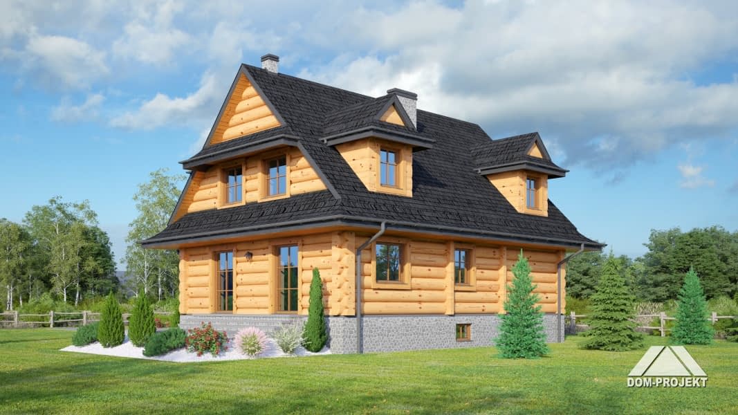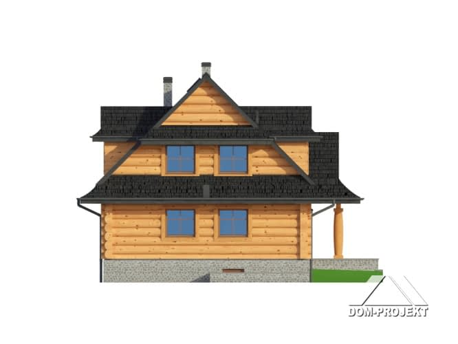 Dom z bali drewnianych. Architektura domu nawiązuje do tradycji podhalańskich. Duży salon z kominkiem i wyjściem na taras. Kuchnia, pokój, łazienka i komunikacja. Na poddaszu cztery pokoje, łazienka i komunikacja. W piwnicach kotłownia, skład opału, pralnia, sauna, garderoba i komunikacja. Zwarta bryła budynku.Rzuty