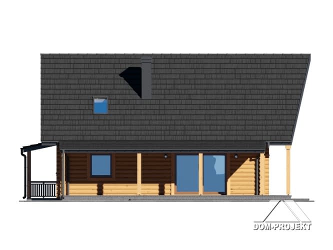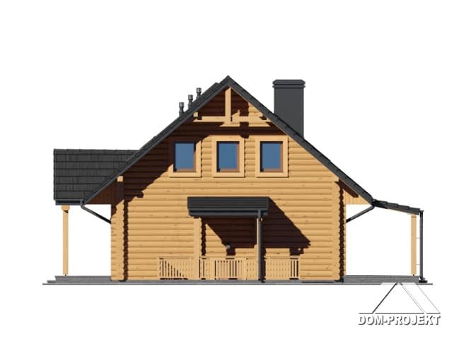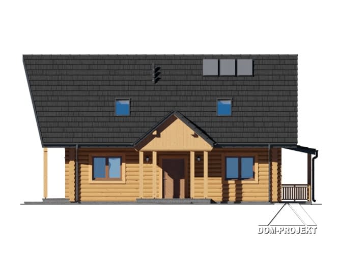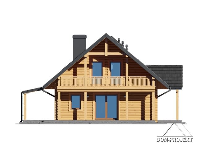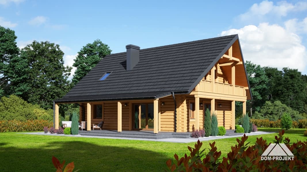 Dom z bali. Duży salon z aneksem kuchennym, kominkiem i wyjściem na zadaszony taras. Pokój, łazienka, komunikacja, garderoba i wiatrołap. Na poddaszu dwa pokoje, łazienka, garderoba, komunikacja i balkon. W piwnicach pralnia, pomieszczenie rekreacyjne i pomieszczenia gospodarcze. Antresola. Instalacja solarna. Zwarta bryła budynku i dach dwuspadowy sprzyjają szybkiej i taniej budowie i niskim kosztom eksploatacji.Rzuty