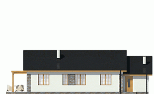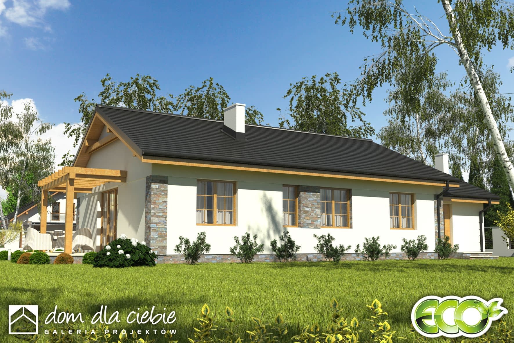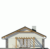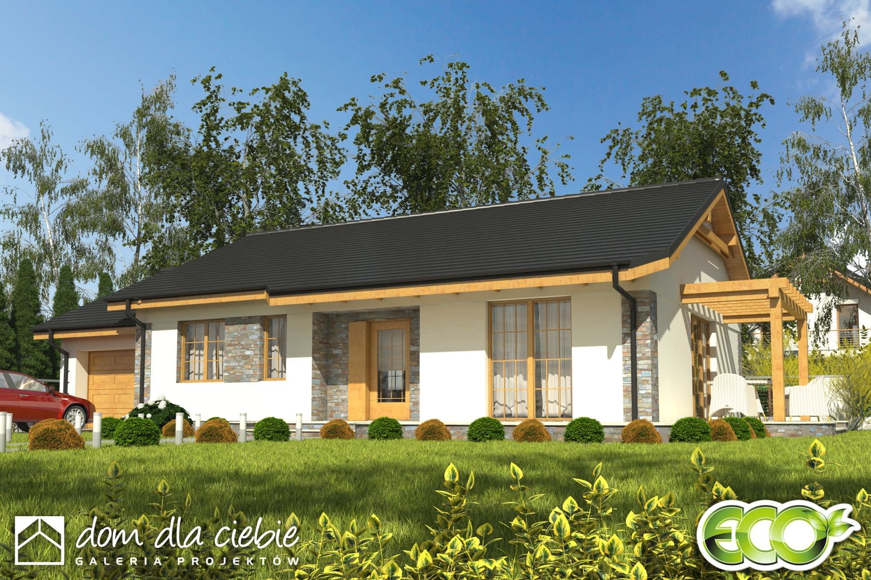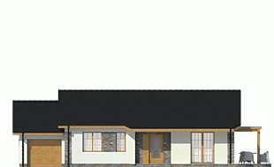 Projekt Lucynka to wygodny dom przeznaczony dla 4-osobowej rodziny. Dedykowany jest na działki z wjazdem od południa. Ekonomiczny - prosty konstrukcyjnie, z dwuspadowym dachem, kotłownią na paliwo stałe zlokalizowaną za garażem, z wyjściem na zewnątrz. Funkcjonalnie podzielony na dwie strefy: dzienną i nocną. Salon połączony jest z kuchnią ze spiżarnią i posiada dwa wyjścia na taras. Część tarasu zadaszono przedłużając dach, część zacieniono pergolą. Dom połączony jest z garażem przez praktyczny schowek.