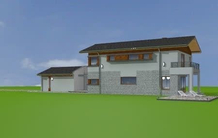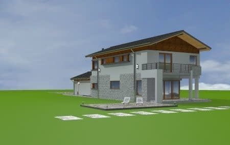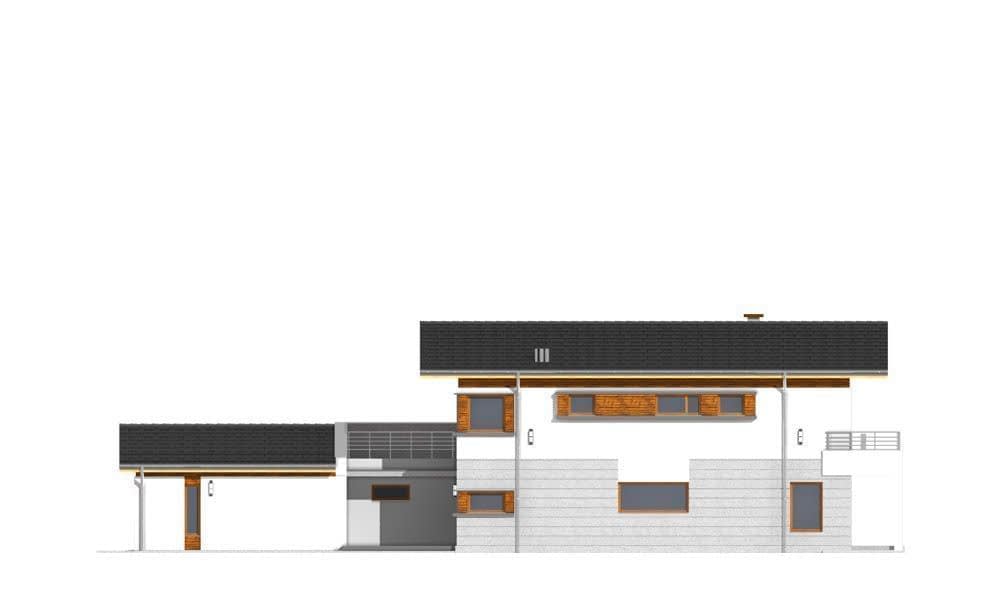 Projekt domu Lugano to willa jednorodzinna dla rodziny cztero-pięcioosobowej. Piętrowy budynek przykryty został dwuspadowym symetrycznym dachem z dachówki ceramicznej. Dom ma nowoczesny charakter, zaprojektowany został z przeznaczeniem dla wąskich działek, na których budynek musi mieć formę długiego wąskiego prostopadłościanu. Część garażowa parterowa została wyciągnięta przed główną bryłę budynku, urozmaicając w ten sposób część frontową. Od strony ogrodu bryłę domu ozdabia narożne okno salonu, podcień i taras piętra na bocznych słupach. Dwuspadowy łagodny dach z dużymi okapami dodaje całemu budynkowi dynamiki. Wnętrze projektu domu Lugano podzielono na jednoprzestrzenną część dzienną na parterze, z ciekawymi, jednobiegowymi schodami, stanowiącymi niewątpliwą ozdobę salonu, oraz część nocną piętra z czterema sypialniami i dużą rodzinną łazienką. Domek pomimo niewielkiej powierzchni jest zaprojektowany funkcjonalnie, a same pomieszczenia są słusznej wielkości. Na parterze obok salonu swoje miejsce znalazł dodatkowy pokój - gabinet lub sypialnia gościnna. Garaż połączono z resztą domu przez duże pomieszczenie techniczne. Z pokoju dziennego można podziwiać ogród przez duże przeszklone otwarcie, połączone z podcieniem z kominkiem zewnętrznym i tarasem. Projekt domu Lugano dostępny jest również w wersji odbicia lustrzanego.