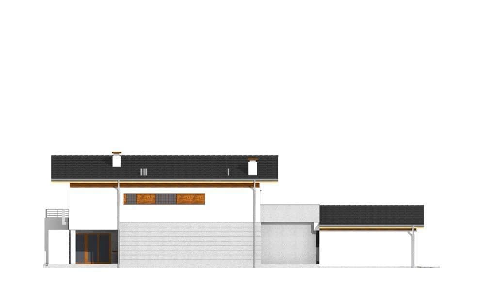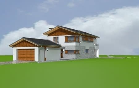 Wariant projektu przystosowany do działki ze spadkiem, przesunięcie garażu odsłaniając drzwi wejściowe.