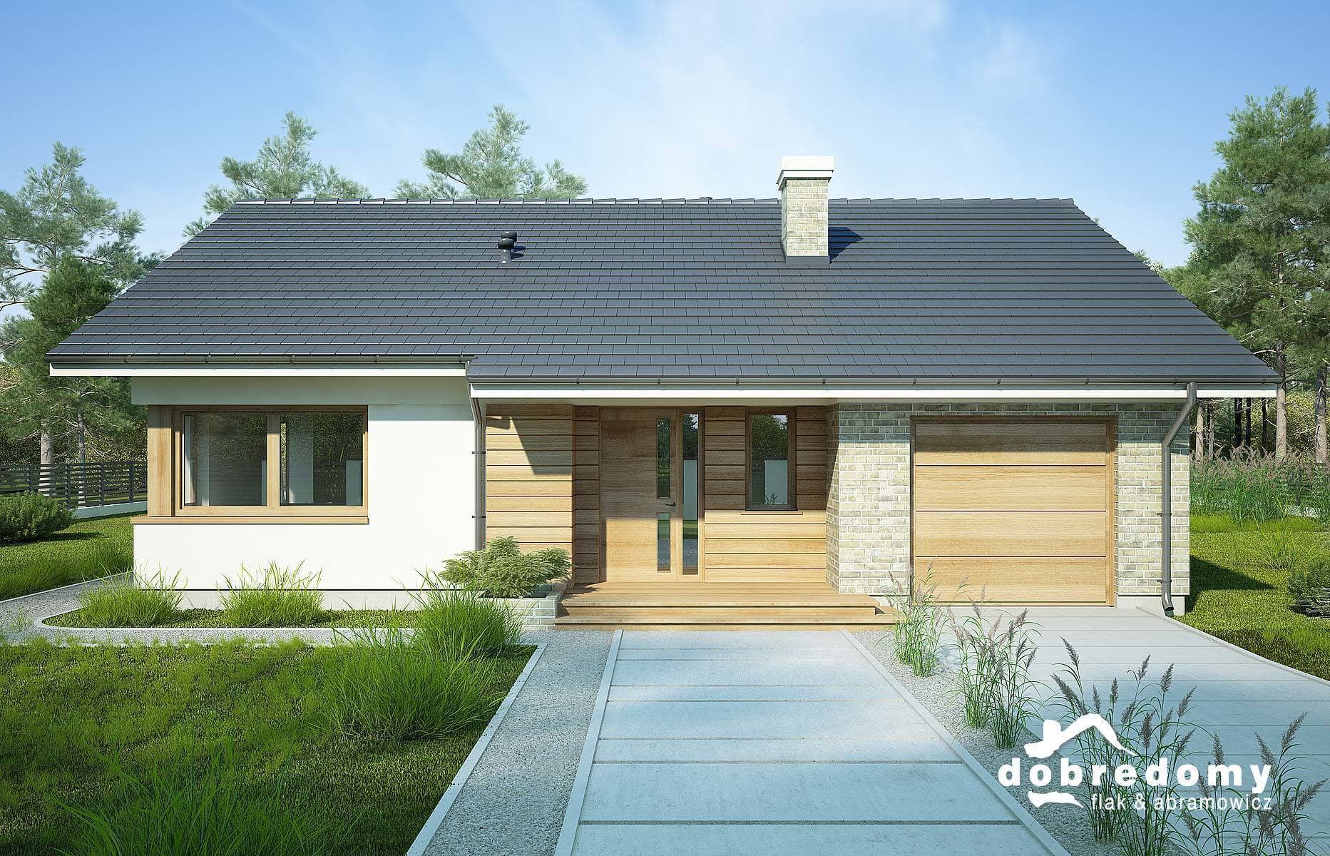 Nieduży dom parterowy dla 3-4-osobowej rodziny. Na parterze znajdują się spory pokój dzienny z jadalnią, kuchnia ze spiżarnią, dwie sypialnie, łazienka, wc, pom. gosp. oraz jednostanowiskowy garaż. Projekt dostępny w wersji z lekko innym układem pomieszczeń i zmienioną elewacją - Lukrecja.