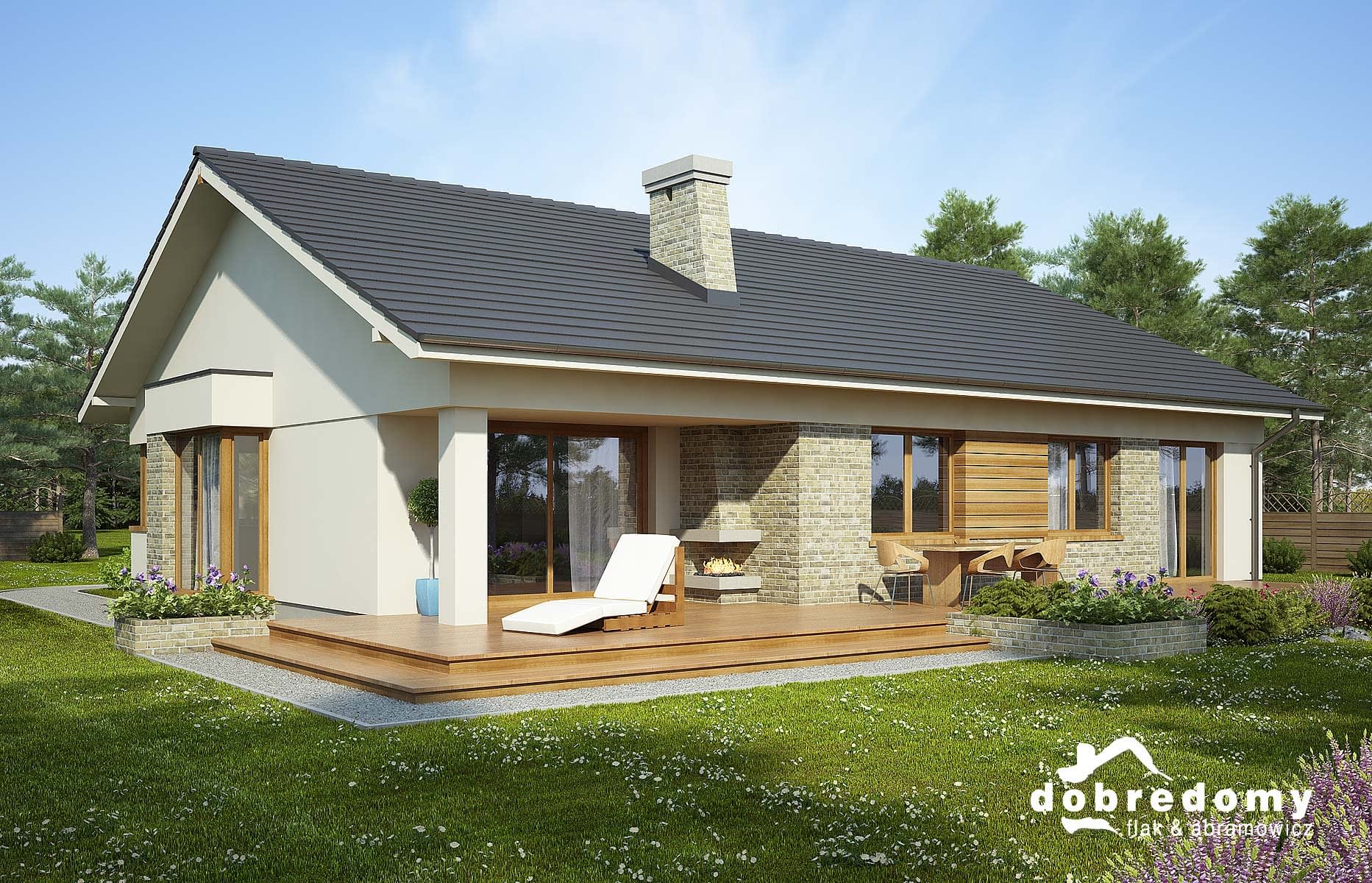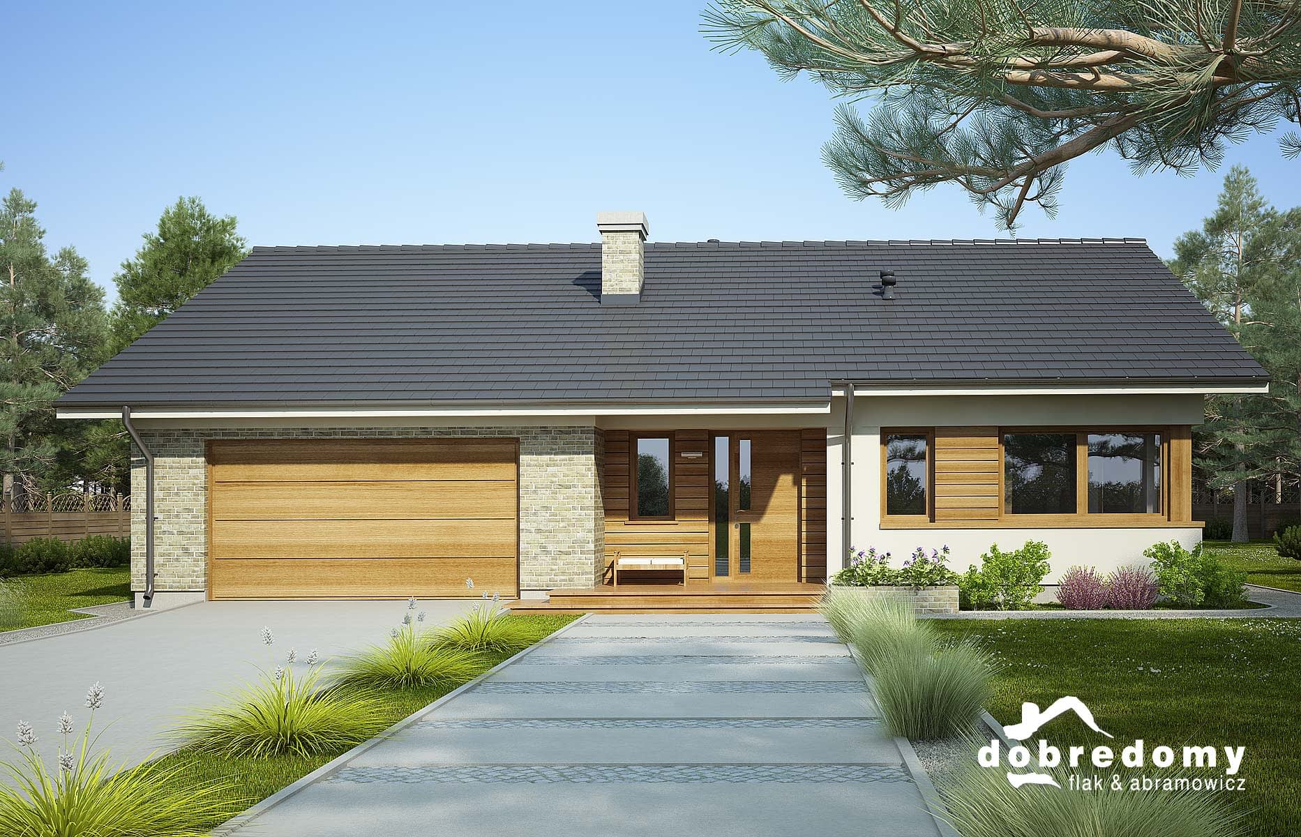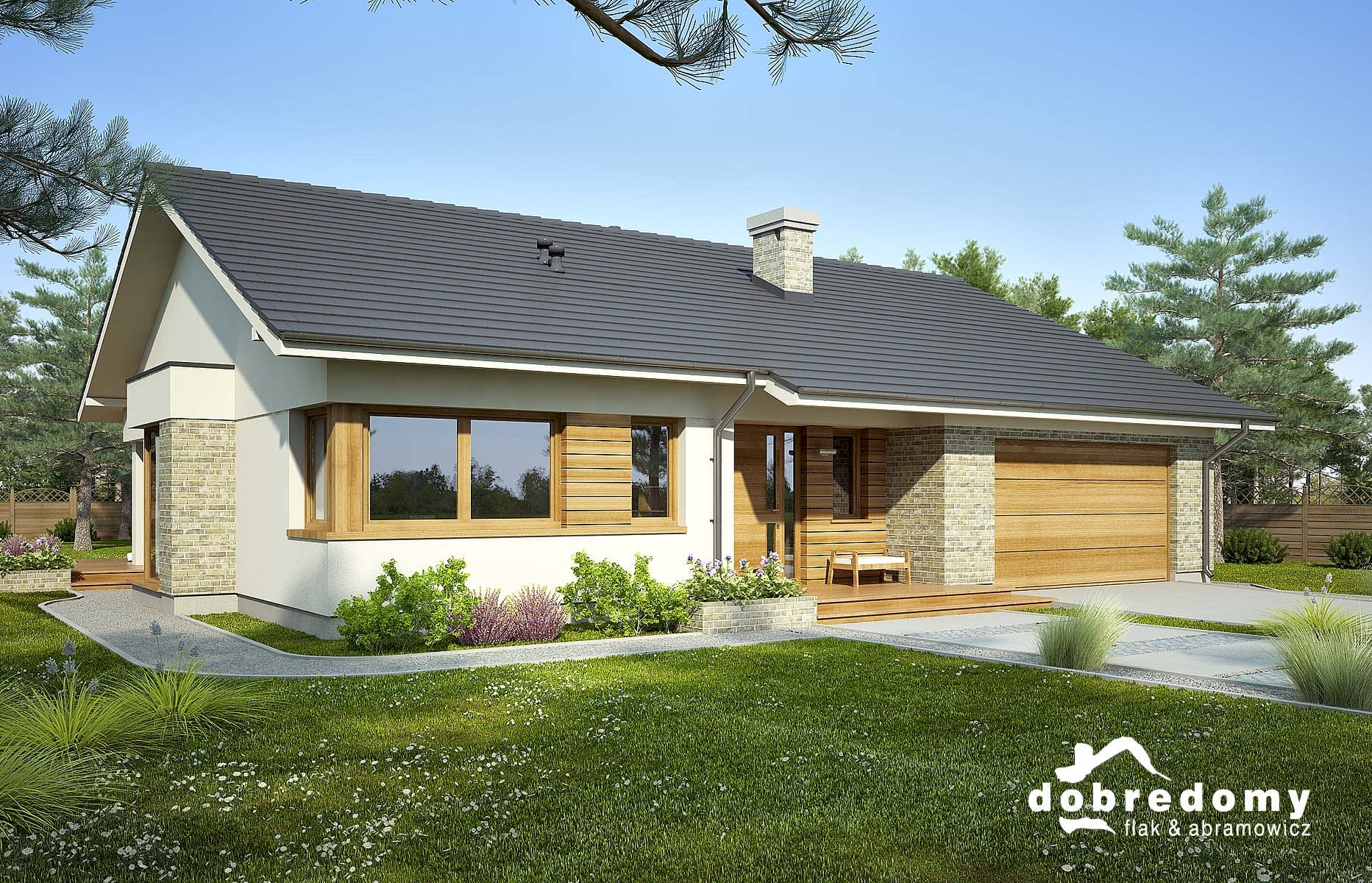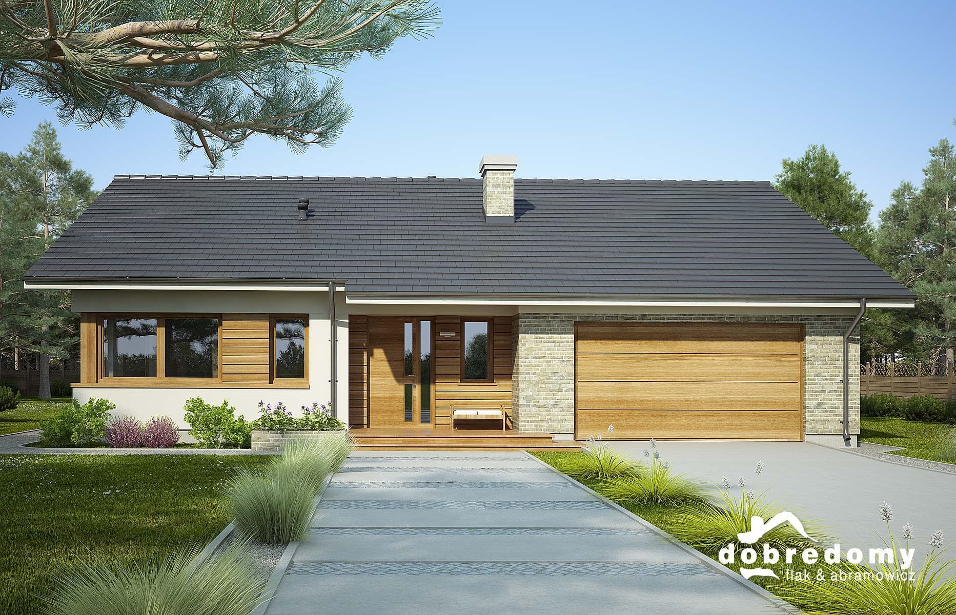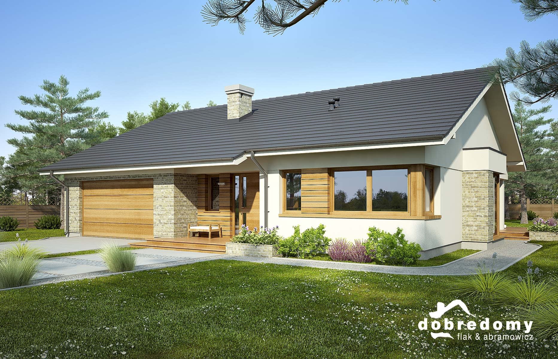 Elewacje pokryte tynkiem strukturalnym w systemie ociepleń Termo Organika oraz okładziną klinkierową i drewnianą. Pokrycie dachu - dachówka ceramiczna lub cementowa CREATON.