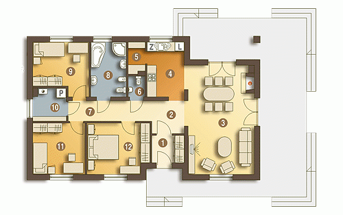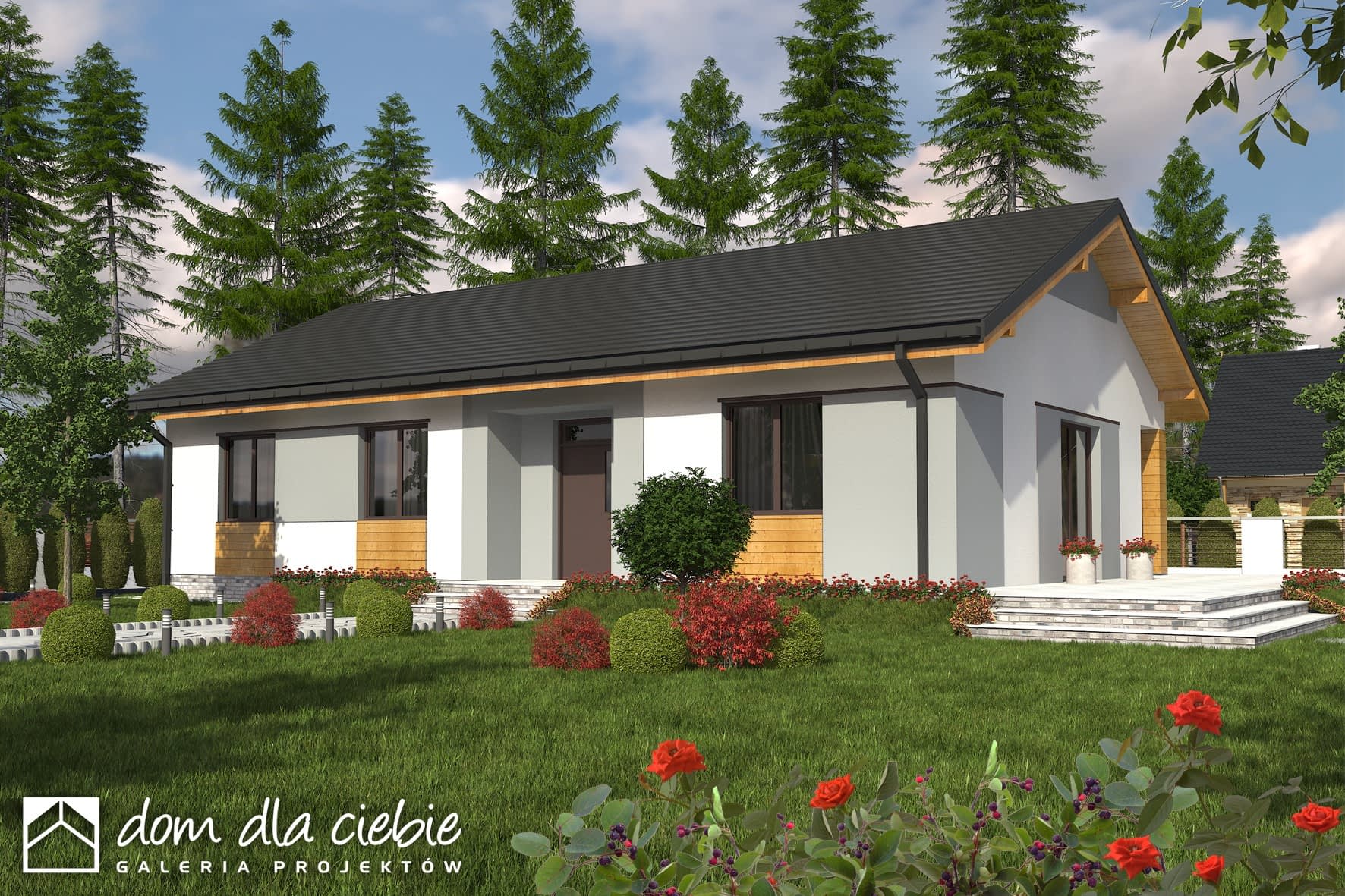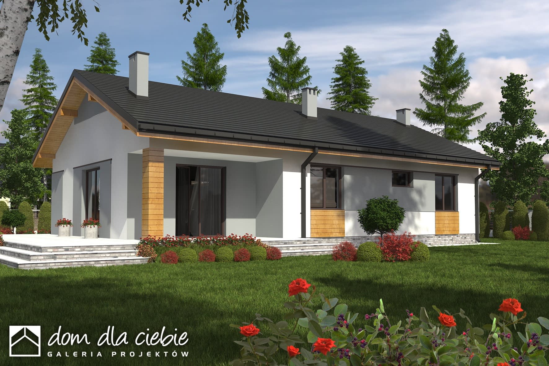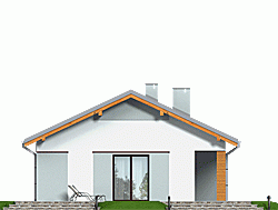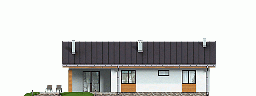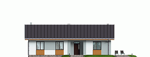Klasyczny dom parterowy z prostym, dwuspadowym dachem dla 4-osobowej rodziny. Duży salon doświetlony z trzech stron daje możliwość otwarcia na różne strony świata – w zależności od układu działki. Częściowo zadaszony taras umożliwia jego wykorzystanie także w czasie deszczu. Podział funkcjonalny wnętrza rozdziela strefę ogólnodostępną (salon, kuchnia ze spiżarnią i WC) oraz prywatną (sypialnie i łazienka). Elewacje utrzymane w ciekawej, nowoczesnej kolorystyce. Polecamy!