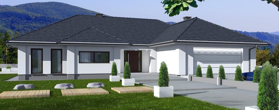 Projekt domu Madera to wygodny parterowy dom z garażem dwustanowiskowym. Charakteryzuje się przemyślanym i ciekawym układem wnętrza. Z wiatrołapu wchodzimy prosto do salonu połączonego z jadalnią będącego „sercem” całego domu i wspólną strefą domowników. Salon wraz z jadalnią są dobrze doświetlone dzięki dwóm potrójnym oknom tarasowym, z których możemy wyjść na ogród i częściowo zadaszony taras. W centralnej części salonu zaprojektowano kominek, którego ciepło w zimie łatwo ogrzeje cały dom i umili zimowy wieczór. Pokoje rozplanowano po dwóch stronach budynku. Po prawej stronie przewidziano 3 ustawne pokoje ( z których dwie zawierają własne garderoby ) i łazienkę. W tej części domu przewidziano także małą toaletę dla gości oraz osobną pralnie. W części przeciwległej wydzielono sypialnię rodziców oraz funkcjonalną łazienkę oraz gabinet, który może także pełnić funkcje pokoju gościnnego. Biały, surowy tynk doskonale kontrastuje się z drewnopodobną stolarką okienną oraz grafitowym dachem, dzięki czemu bryła domu prezentuje się bardzo elegancko. Na bazie projektu Madera powstał projekt Madera 2 w którym przewidziano użytkowe poddasze.