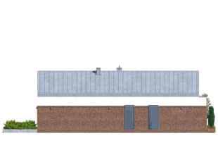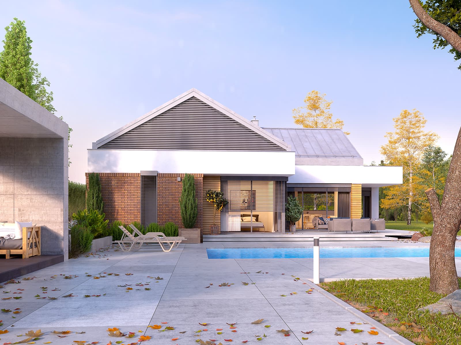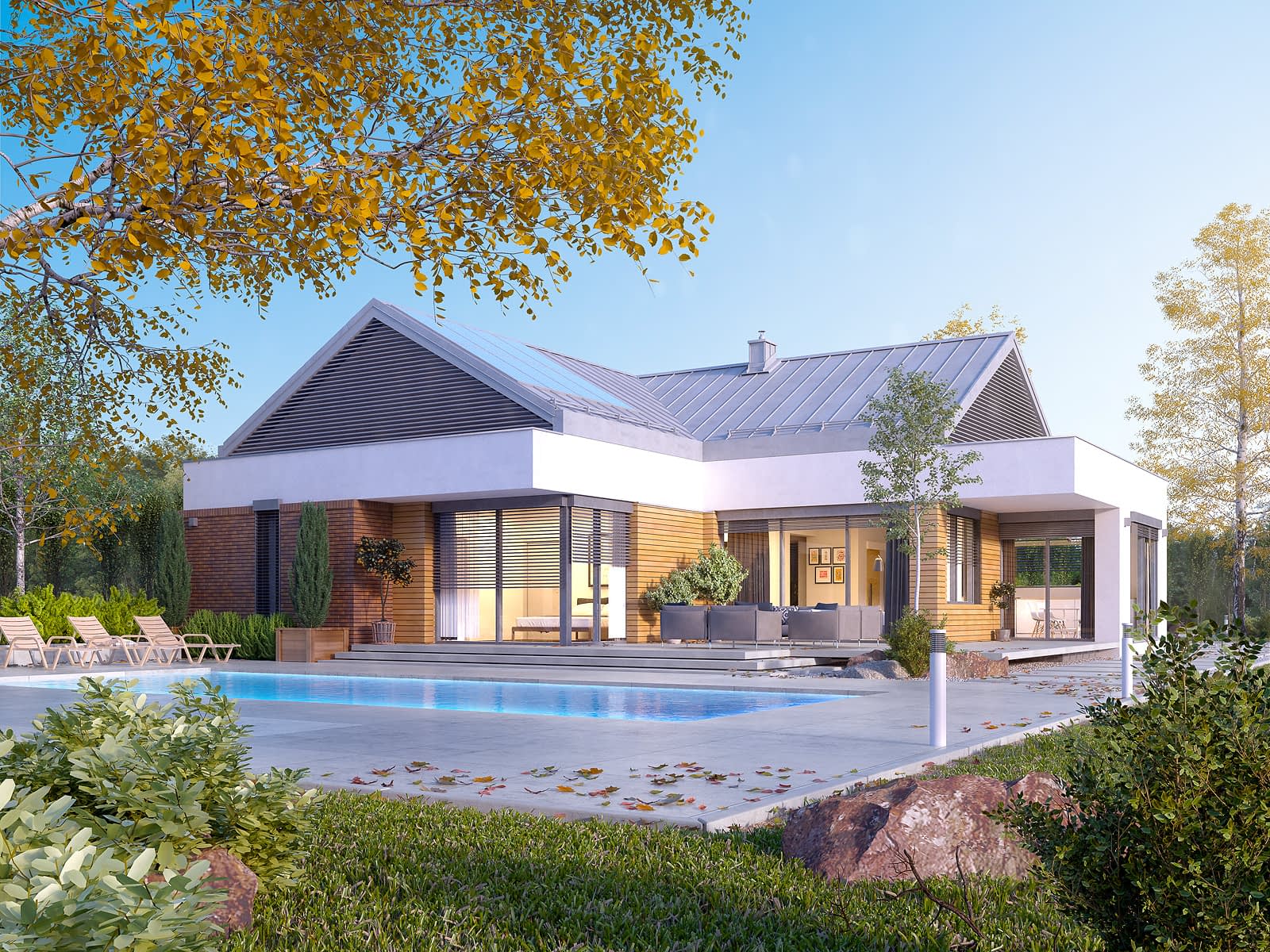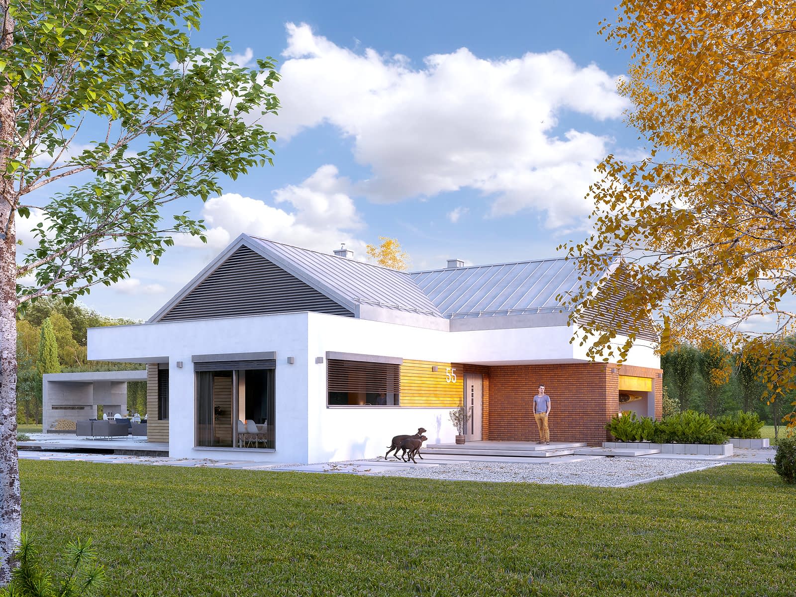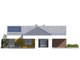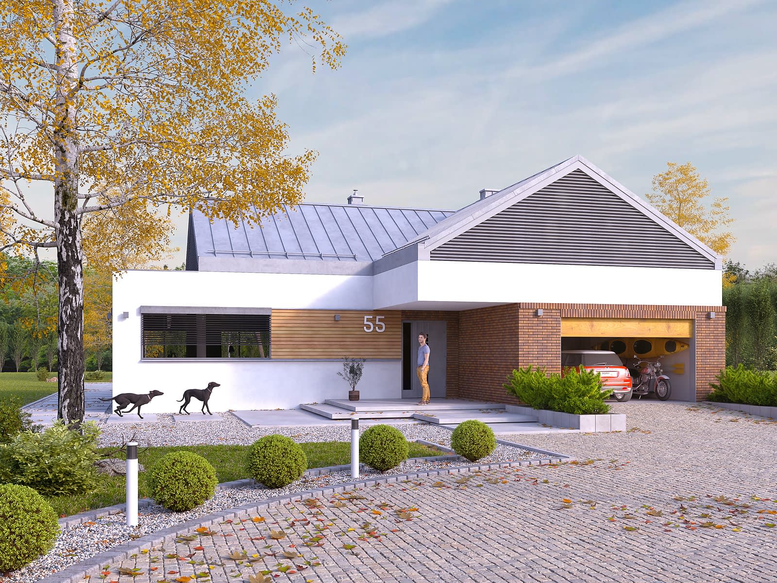 Parterowy projekt domu. Oryginalny wygląd zachwyca od pierwszego spojrzenia. Jasny tynk i naturalna okładzina efektownie ze sobą kontrastuje jednocześnie współgrając z otoczeniem. Duże przeszklenia pięknie doświetlają wnętrze każdego pomieszczenia. Strefa dzienna parteru składa się z kuchni i delikatnie wydzielonej jadalni wydzieloną spiżarnią. Na uwagę zasługuje przestronny salon z dużymi przeszkleniami zadaszony taras oraz ukryty w ścianie kominek. W strefie nocnej zaprojektowano trzy obszerne sypialnie, w sypialni podwójnej zaprojektowano dodatkowo garderobę i łazienkę. Sypialnia podwójna posiada własne wyjście na taras ogrodowy. Warto zauważyć, iż w projekcie przewidziano oddzielne pomieszczenie przeznaczone na pralnie i kotłownie. Garaż służy nie tylko parkowaniu samochodu ale poprzez delikatne powiększenie znajdziemy tam miejsca na rowery inny sprzęt rekreacyjny lub urządzenia potrzebne do obsługi ogrodu.Konstrukcja