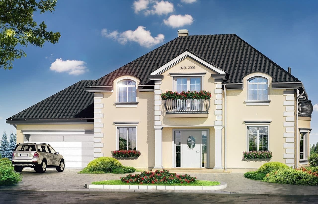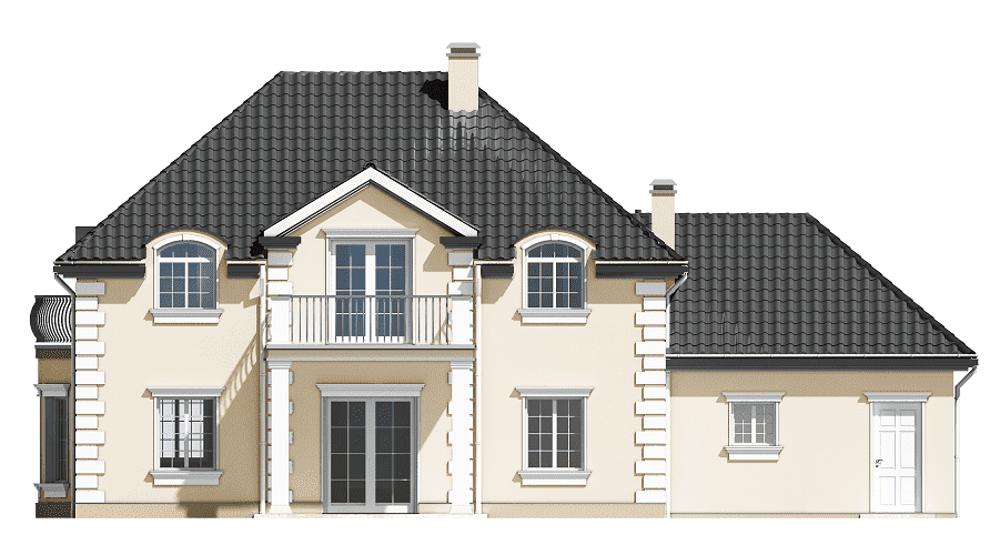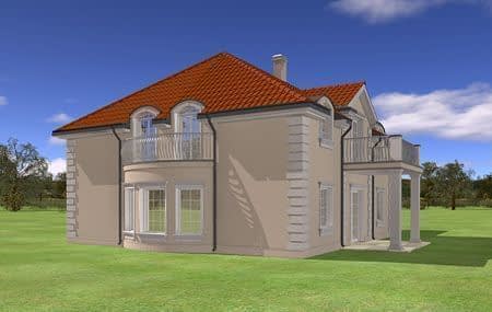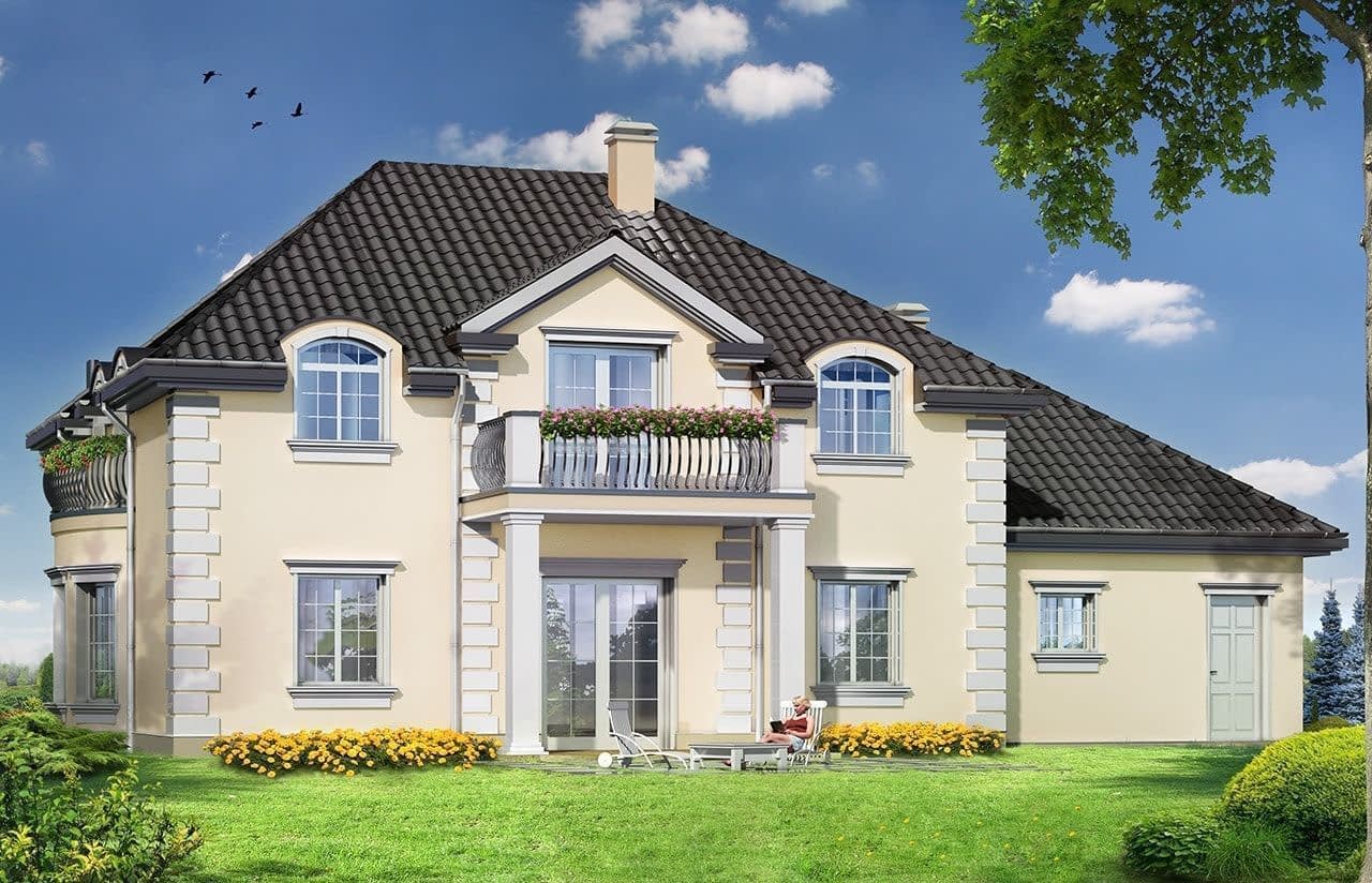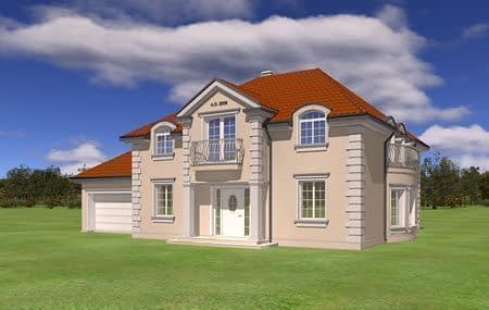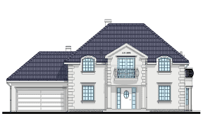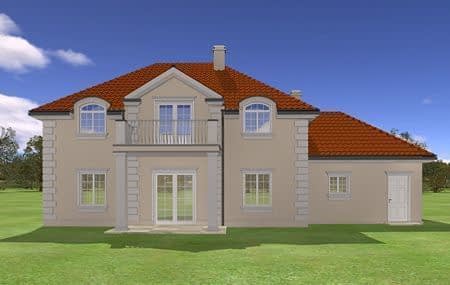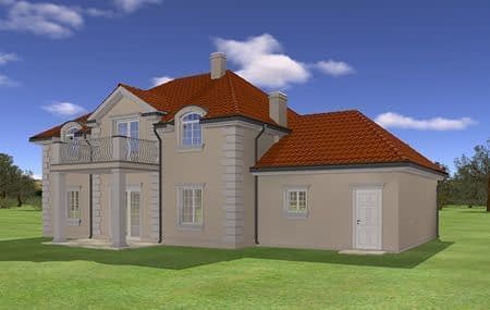 Projekt domu Magnat to reprezentacyjna stylowa willa, nawiązująca do stylistyki dworków i willi międzywojennych. Projekt domu Magnat swój ponadczasowy styl łączy z nowocześnie i funkcjonalnie zaprojektowanym wnętrzem. Dom jest prostokątną, parterową bryłą z poddaszem użytkowym oraz dobudowaną częścią garażową. Budynek został przekryty czterospadowym dachem. Na elewacji frontowej i ogrodowej zaprojektowano dwukondygnacyjne portale, podparte kolumnami, zakończone dwuspadowymi zdobionymi frontonami. Pomimo tego, że główna bryła budynku jest parterowa, poddasze ma bardzo wysoką ścianę kolankową, także prawie cała powierzchnia podłogi górnej kondygnacji jest użytkowa - powyżej wysokości stania człowieka. Wnętrze domu Magnat zaprojektowano wydzielając na parterze dużą przestrzeń dzienną: salonu, jadalni, holu i częściowo otwartej kuchni. Salon z jadalnią mają obniżoną o dwa stopnie podłogę, przez co pomieszczenia te zyskują na wysokości. Piękne reprezentacyjne schody w holu widoczne są również z pokoju dziennego i jadalni. Na parterze mieści się też gabinet - biblioteka (można go zaadaptować na dodatkowy pokój z wejściem z holu) i dodatkowy pokój - na przykład sypialnia. W część gospodarczej mieści się wygodny garaż i duża kotłownia. Na poddaszu przewidziano cztery sypialnie, z apartamentem rodziców, posiadającym własną łazienkę i garderobę, oraz wyjście na taras ogrodowy na piętrze. Pracownia posiada też wersję w standardzie NF40 oraz wersję odbicia lustrzanego projektu Magnat. Zapraszamy do zapoznania się z pełną ofertą pracowni MG Projekt tej serii: projekt domu Magnat 2, projekt domu Magnat 3, projekt domu Magnat 4.