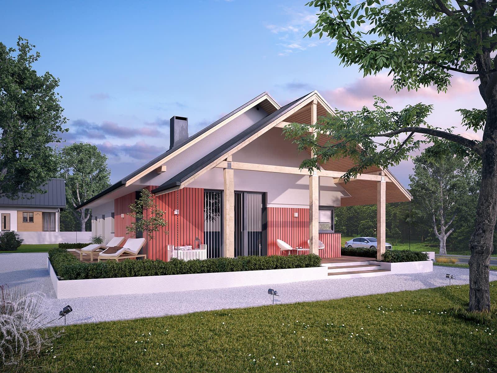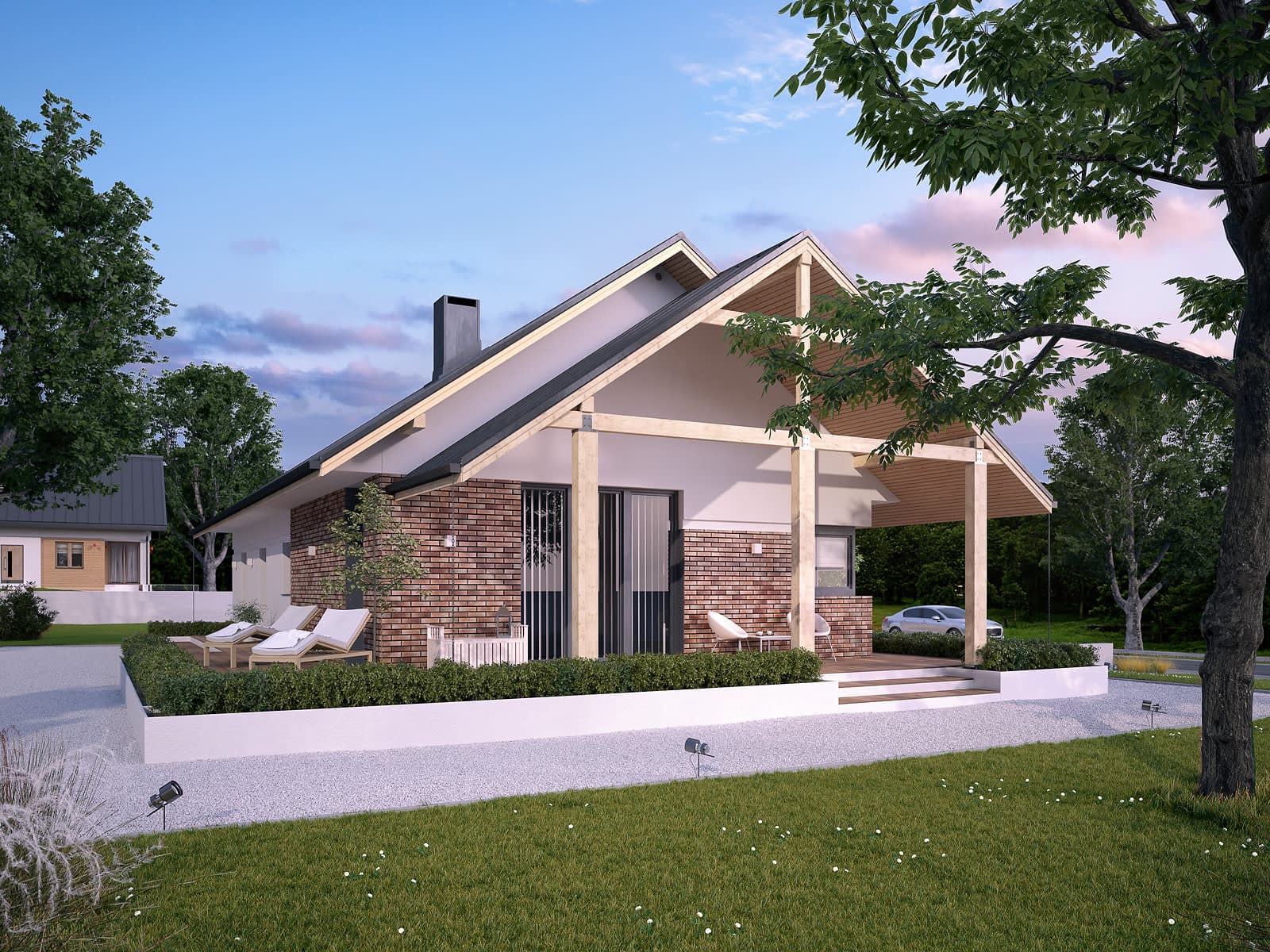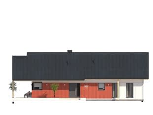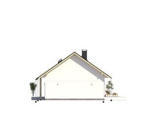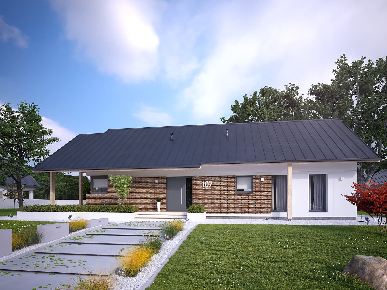 Parterowy budynek mieszkalny jednorodzinny o zwartej bryle, przykryty dachem dwuspadowym. Układ funkcjonalny z wyraźnym podziałem na część dzienną i nocną. Salon posiada wysoki sufit i duże przeszklenie stanowiące wyjście na zadaszony taras. W domu znajduje się kuchnia z jadalną połączona z salonem, sypialnia, dwa pokoje, dwie łazienki, garderoba oraz kotłownia na ogrzewanie gazowe z możliwością adaptacji na paliwo stałe. Dom został zaprojektowany w nowoczesnym stylu. Prezentowany projekt po zbliźniaczeniu będzie się idealnie nadawał do zabudowy szeregowej.Konstrukcja