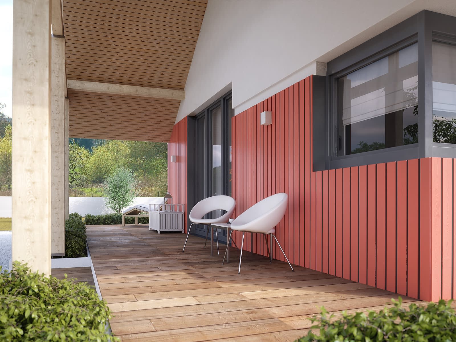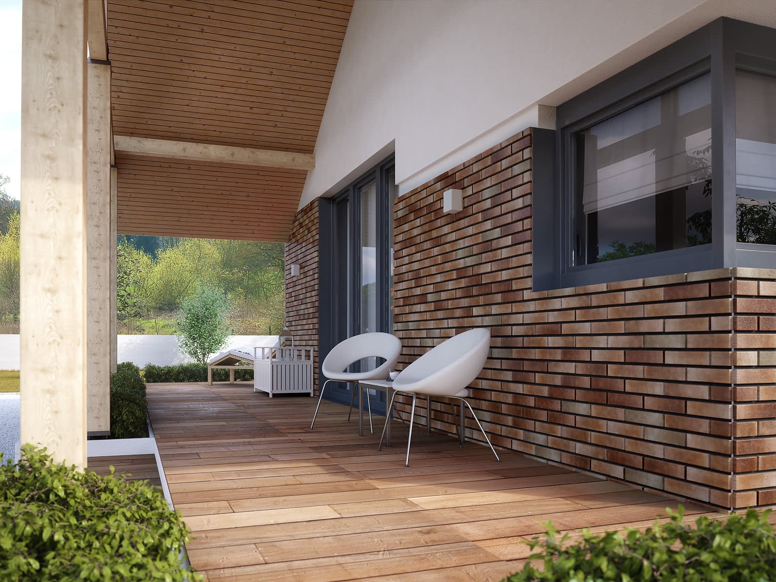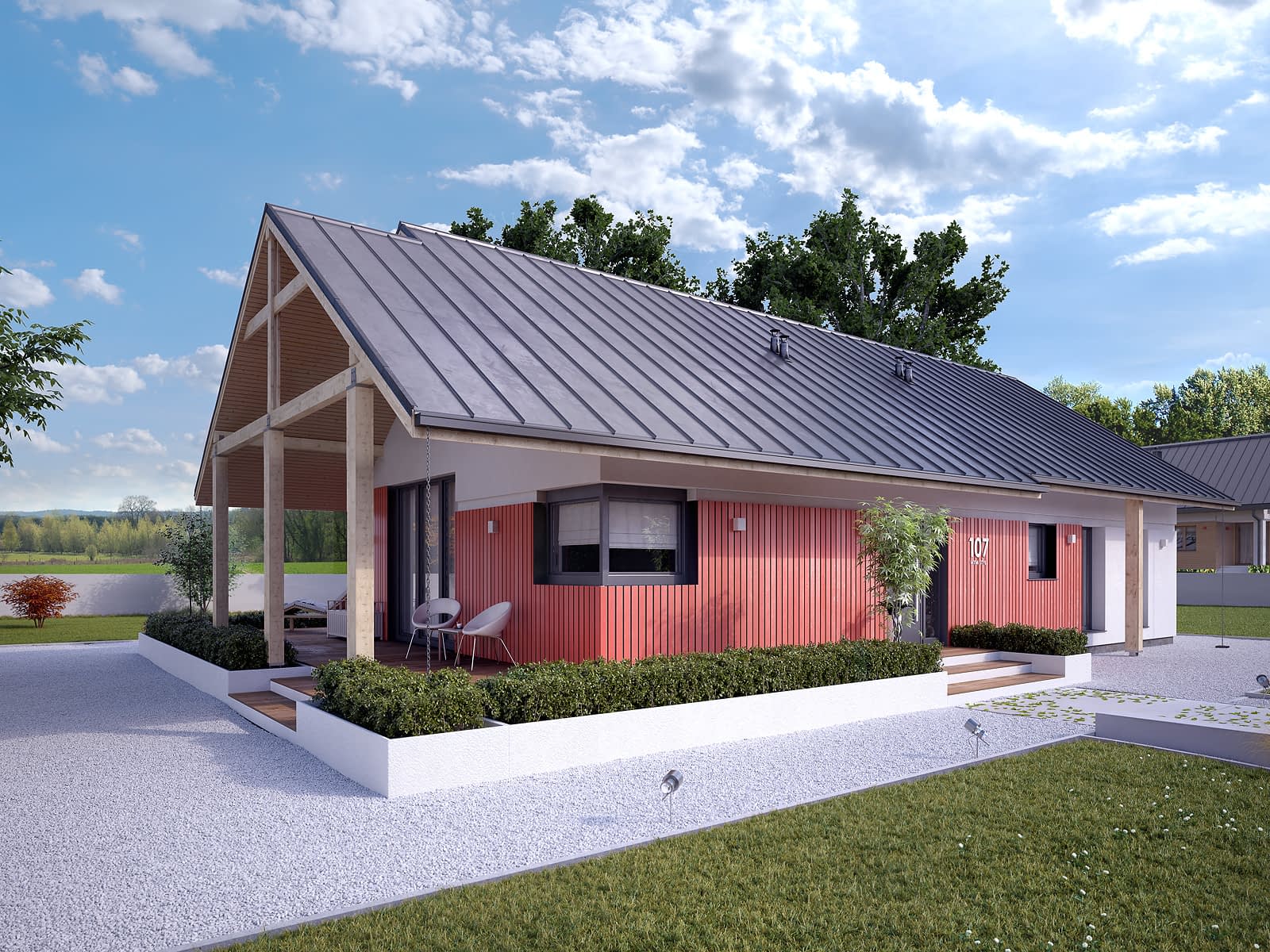 Parterowy budynek mieszkalny jednorodzinny o zwartej bryle, przykryty dachem dwuspadowym. Układ funkcjonalny z wyraźnym podziałem na część dzienną i nocną. Salon posiada wysoki sufit i duże przeszklenie stanowiące wyjście na zadaszony taras. W domu znajduje się kuchnia z jadalną połączona z salonem, sypialnia, dwa pokoje, dwie łazienki, garderoba oraz kotłownia na ogrzewanie gazowe z możliwością adaptacji na paliwo stałe. Dom został zaprojektowany w nowoczesnym stylu. Prezentowany projekt po zbliźniaczeniu będzie się idealnie nadawał do zabudowy szeregowej.Konstrukcja