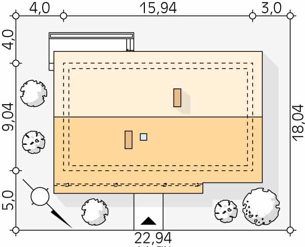 Ściany: 2-warstwowe - beton komórkowy + styropian Termo Organika, Stropy: żelbetowe, wylewane, Dach: blacha na rąbek stojący Ruukki Classic,Rzuty
