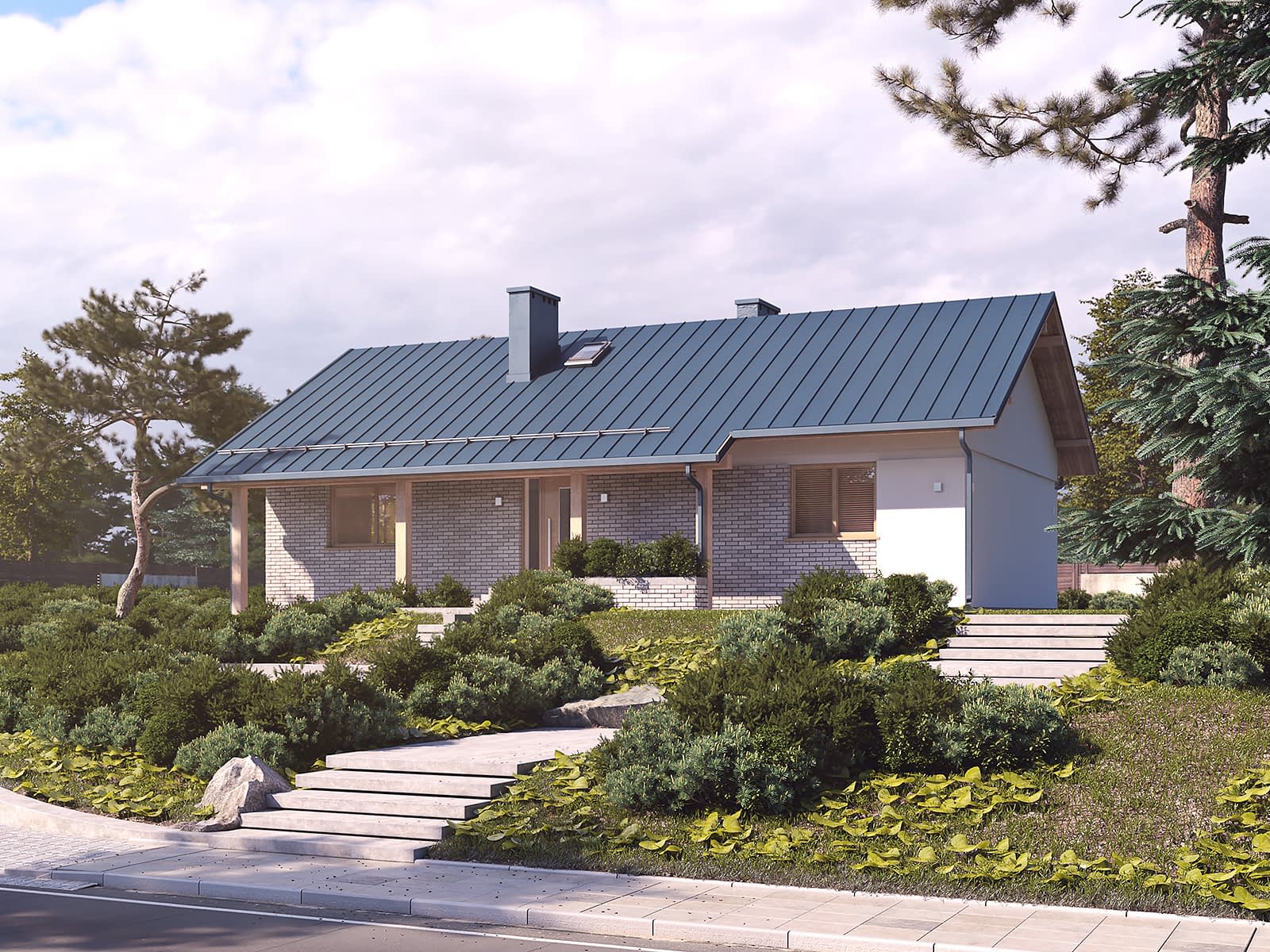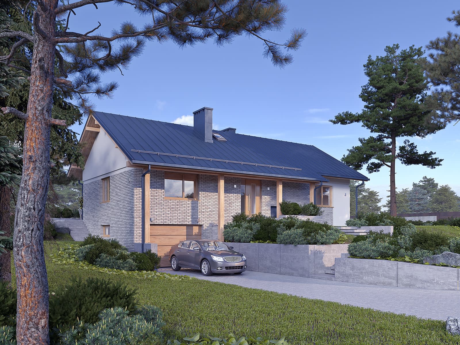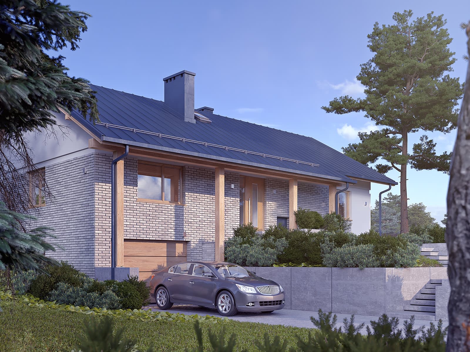 MAHOŃ to projekt domu parterowego podpiwniczonego o powierzchni 112m2. Bryła budynku została rozplanowana na planie prostokąta i przykryta dachem dwuspadowym. Minimalistyczna elewacja o jasnych kolorach składa się z białego tynku i cegły klinkierowej o szarym odcieniu. Drewniane elementy wykończeniowe oraz stolarka okienna i drzwiowa kontrastują z ciemnym dachem wykończonym blachą. Dostęp do garażu odbywa się za pomocą piwnicy połączonej schodami z resztą domu. Na parterze znajdują się trzy pokoje, łazienka z wanną oraz prysznicem i kuchnia połączona z jadalnią oraz salonem. Bezpośredni dostęp na strych zapewniają schody.Konstrukcja