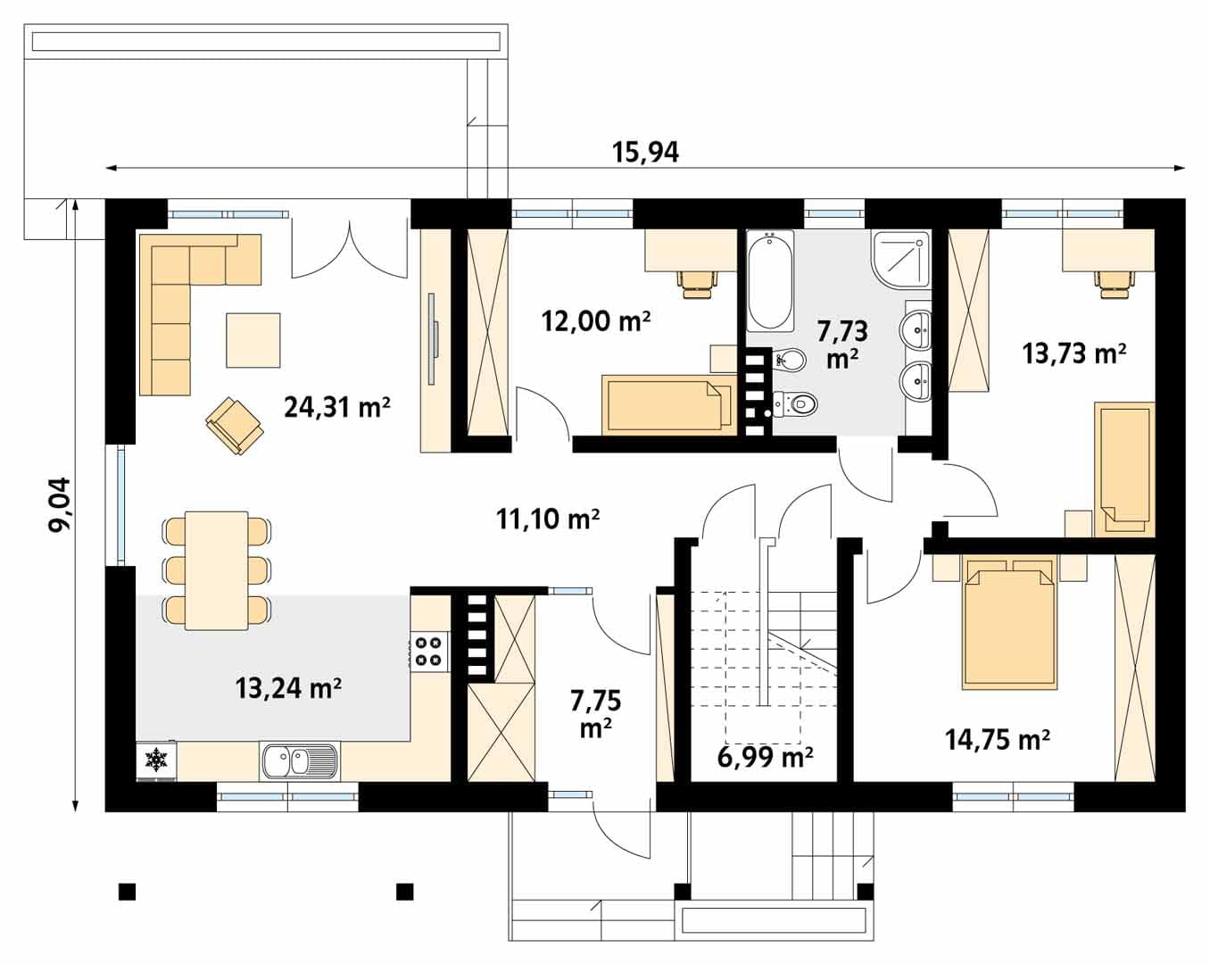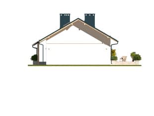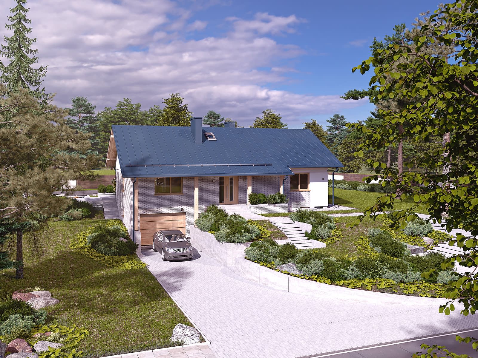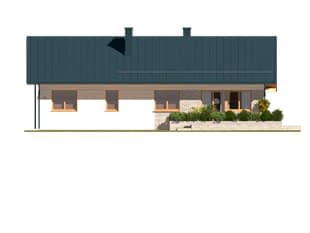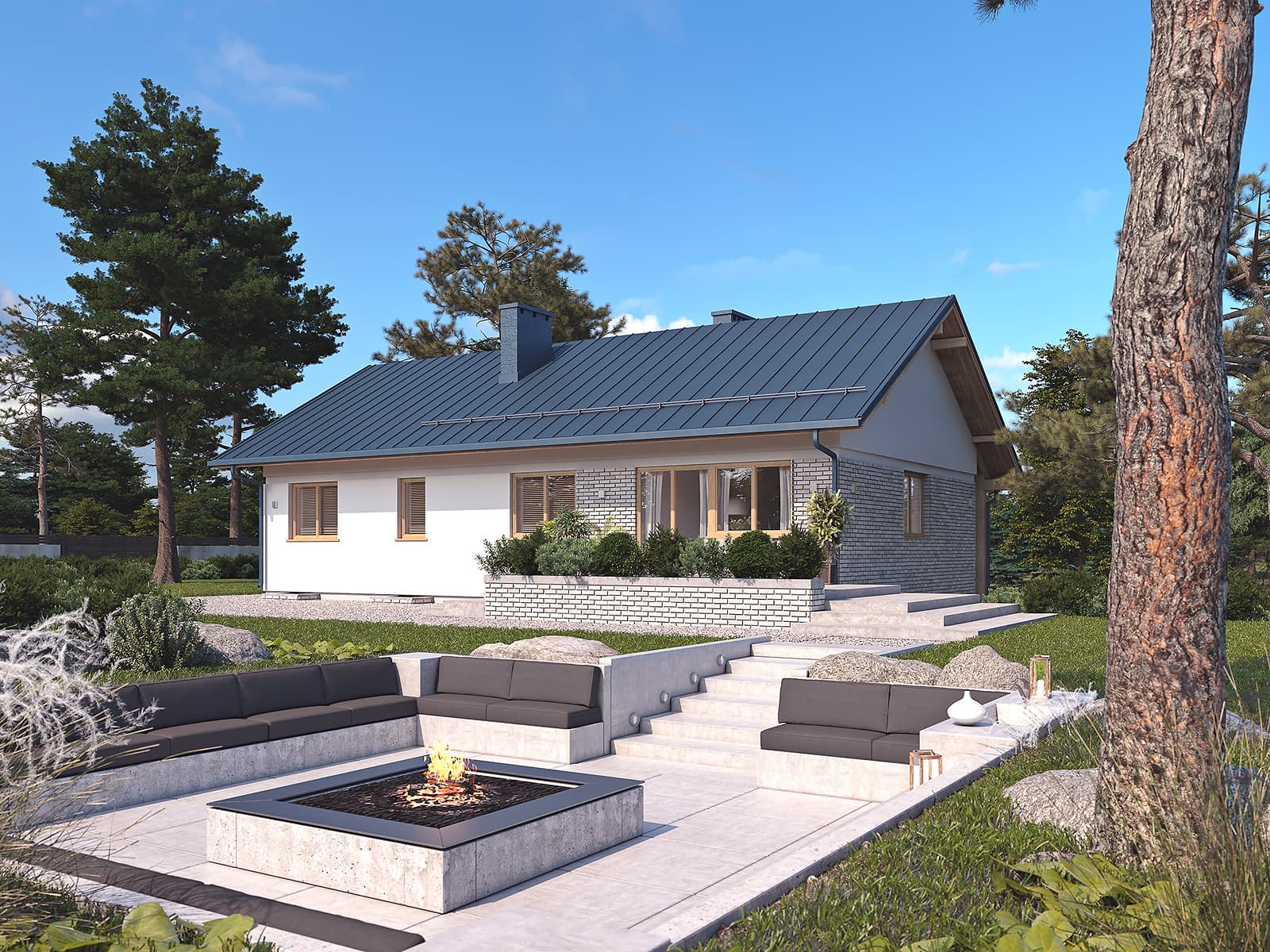 MAHOŃ to projekt domu parterowego podpiwniczonego o powierzchni 112m2. Bryła budynku została rozplanowana na planie prostokąta i przykryta dachem dwuspadowym. Minimalistyczna elewacja o jasnych kolorach składa się z białego tynku i cegły klinkierowej o szarym odcieniu. Drewniane elementy wykończeniowe oraz stolarka okienna i drzwiowa kontrastują z ciemnym dachem wykończonym blachą. Dostęp do garażu odbywa się za pomocą piwnicy połączonej schodami z resztą domu. Na parterze znajdują się trzy pokoje, łazienka z wanną oraz prysznicem i kuchnia połączona z jadalnią oraz salonem. Bezpośredni dostęp na strych zapewniają schody.Konstrukcja