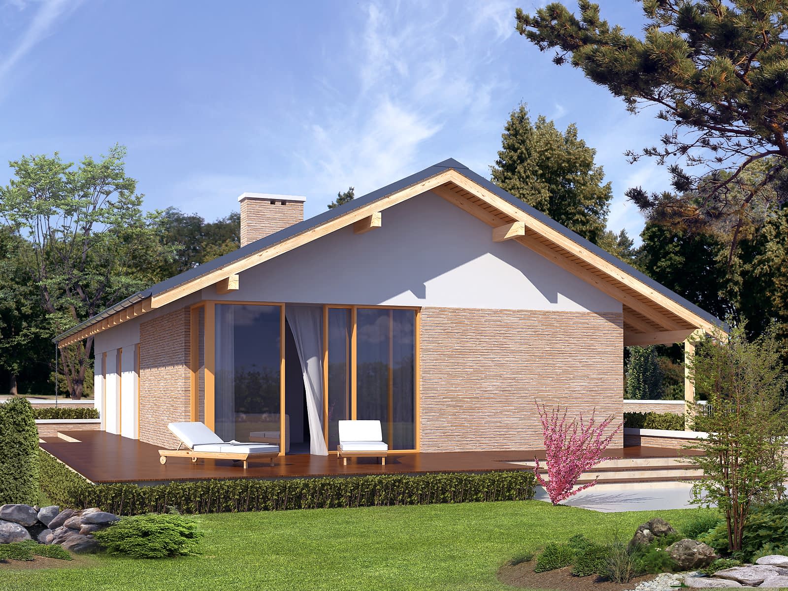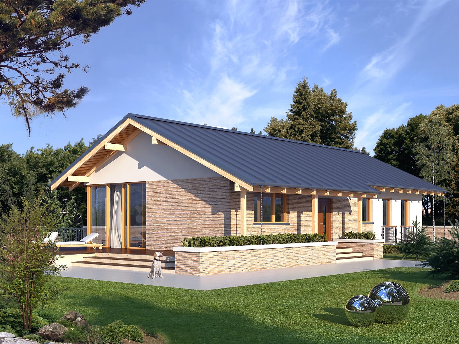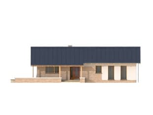 Parterowy dom jednorodzinny o prostej bryle i czystym układzie funkcjonalnym z wyraźnym podziałem na część dzienną i nocną. Salon posiada wysoki sufit oraz duże przeszklenie stanowiące wyjście na taras. W domu znajdują się trzy wygodne sypialnie oraz dwie łazienki i garderoba. Kotłownia z wejściem także z zewnątrz przygotowana pod paliwo stałe.Konstrukcja
