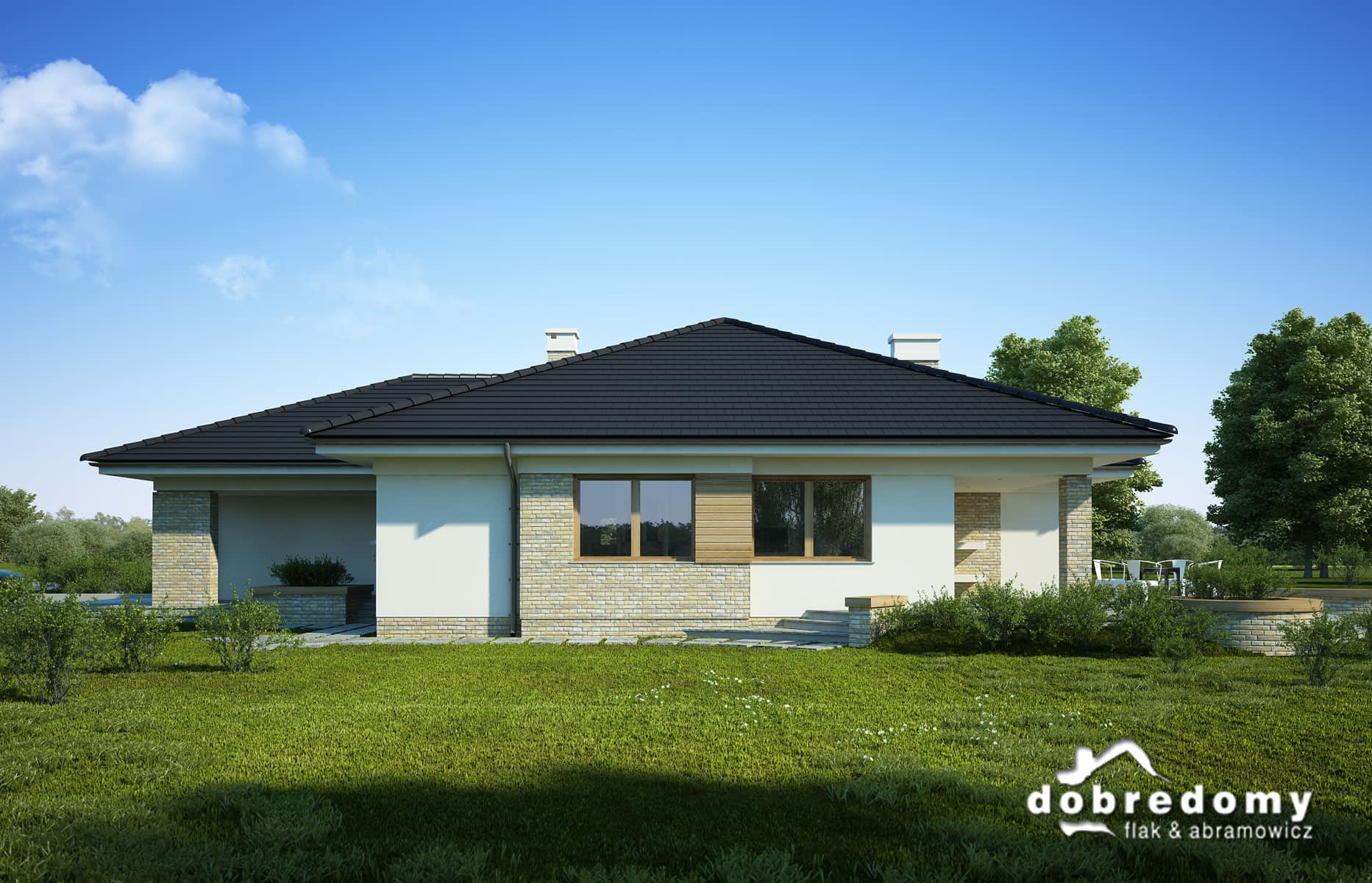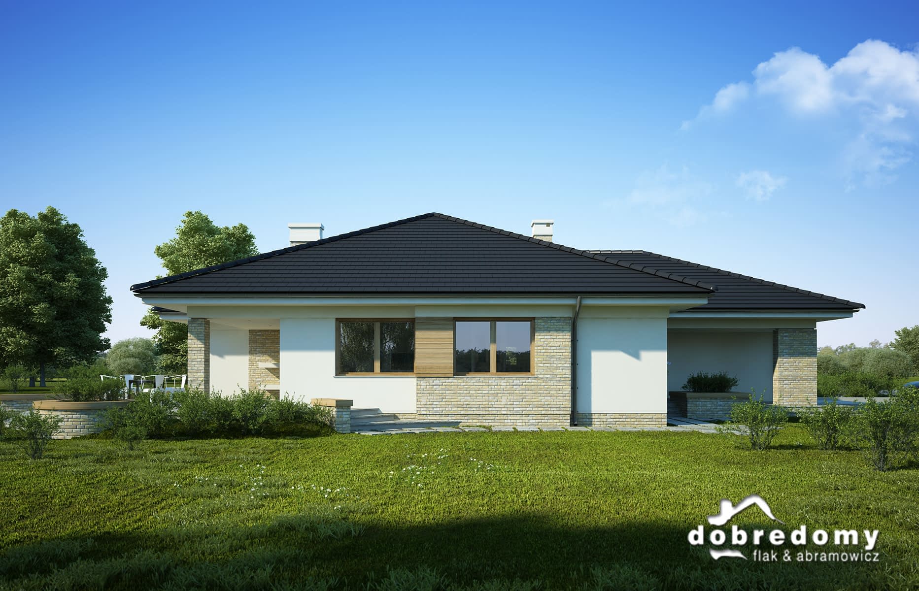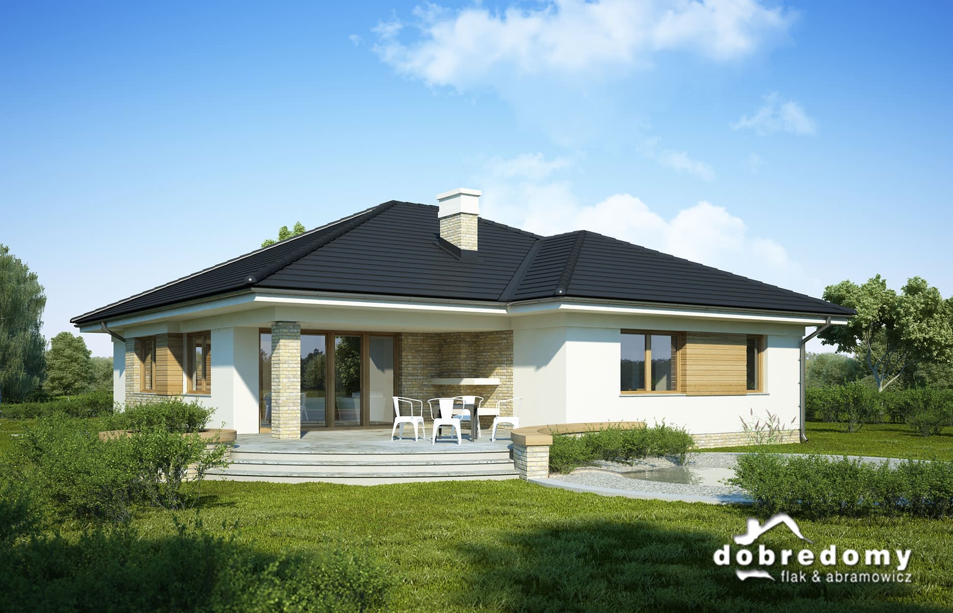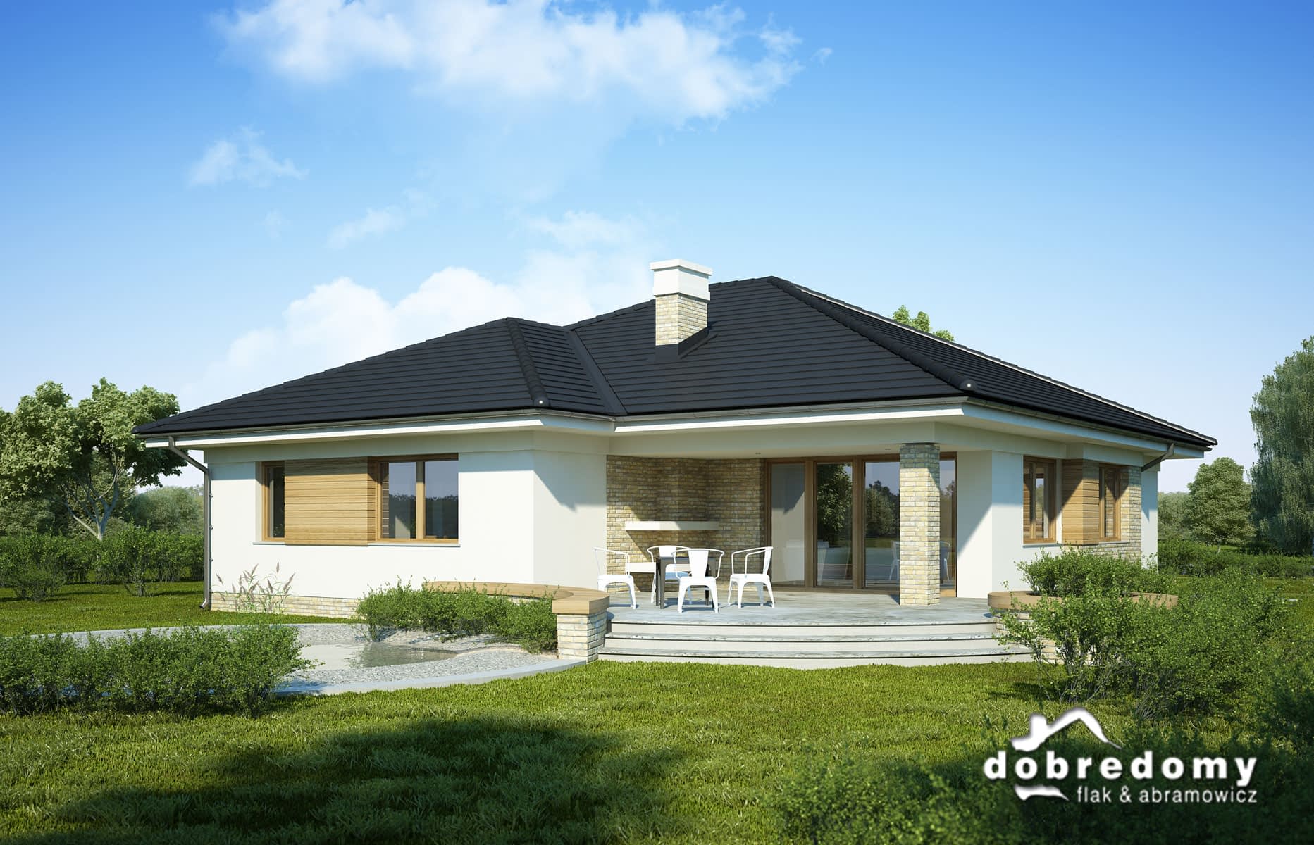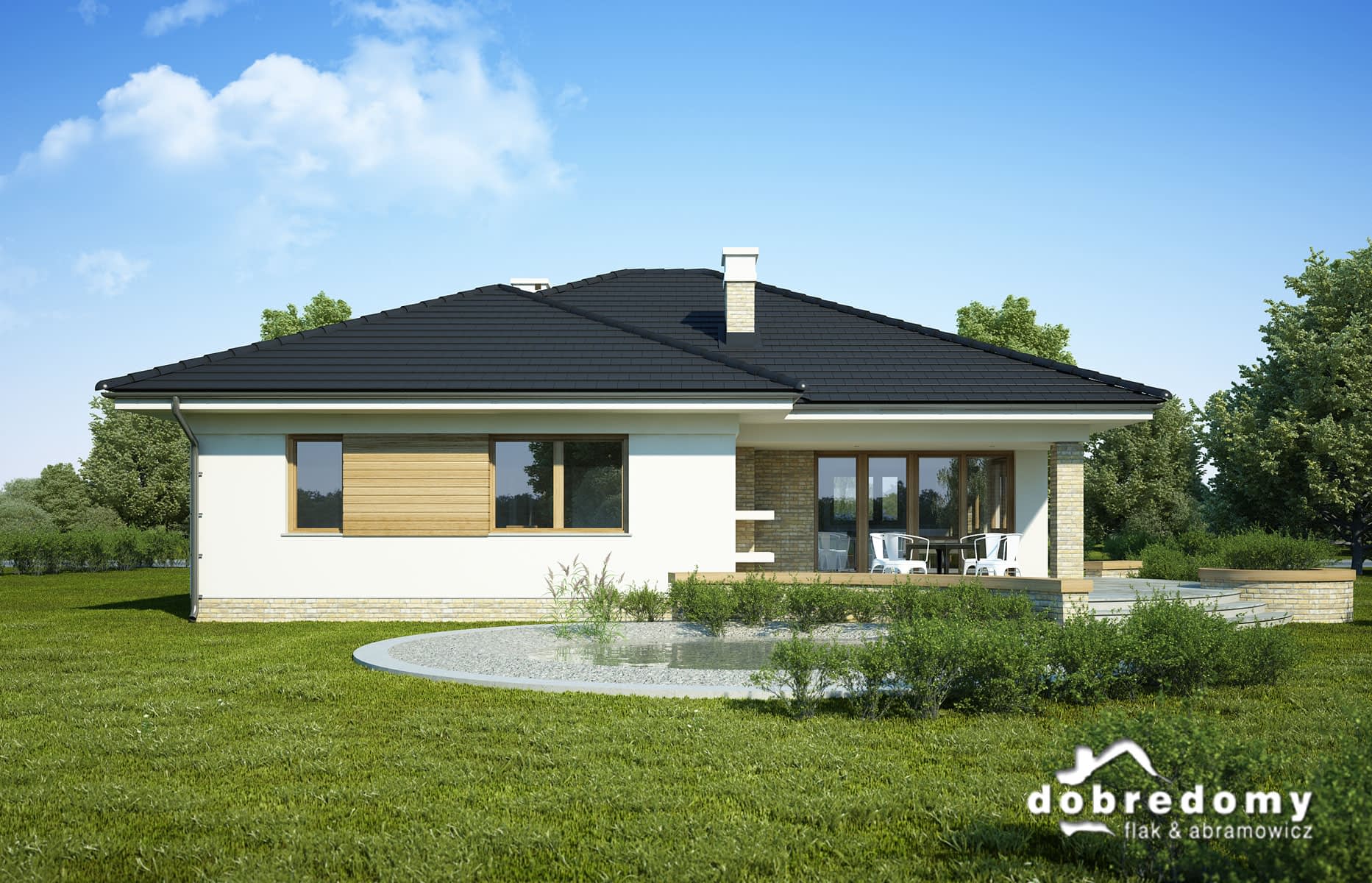Dom parterowy, niepodpiwniczony, przeznaczony dla 4-5 osobowej rodziny. W części dziennej zlokalizowano otwartą kuchnię połączoną z pokojem dziennym poprzez jadalnię. Sypialnie z ogólnodostępną łazienką i garderobą zaprojektowano w odizolowanej części nocnej. Dodatkowo sypialnia rodziców posiada własną garderobę i łazienkę. Dostępna wersja projektu w tradycyjnej stylistyce - Afrodyta.