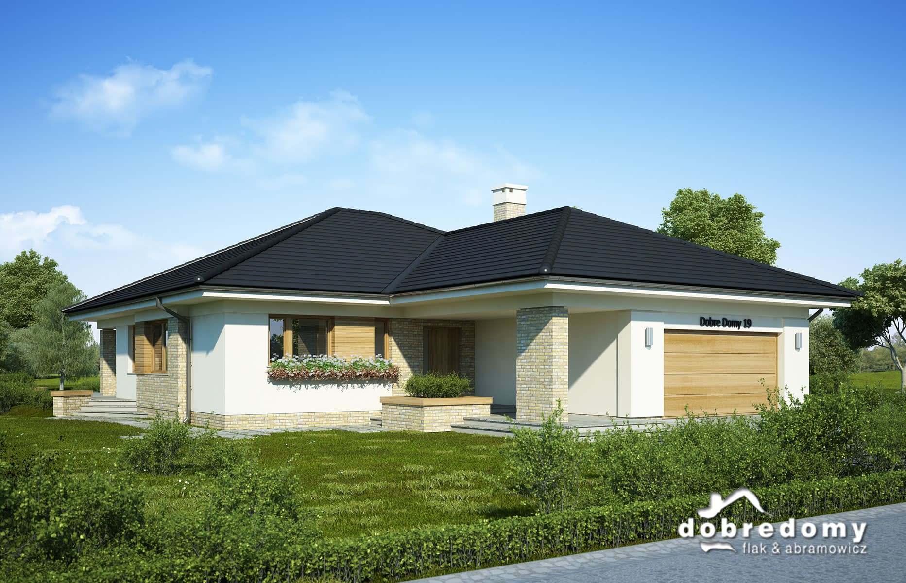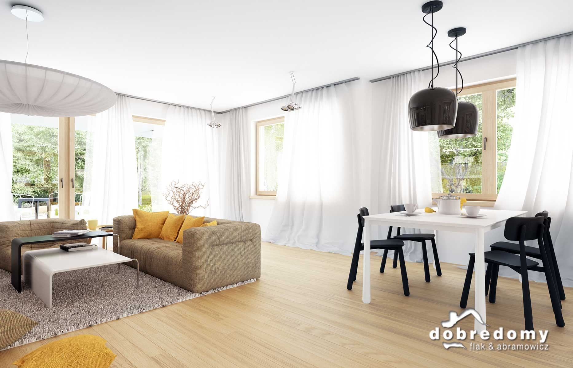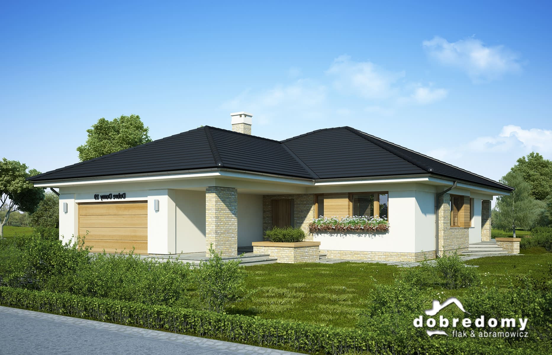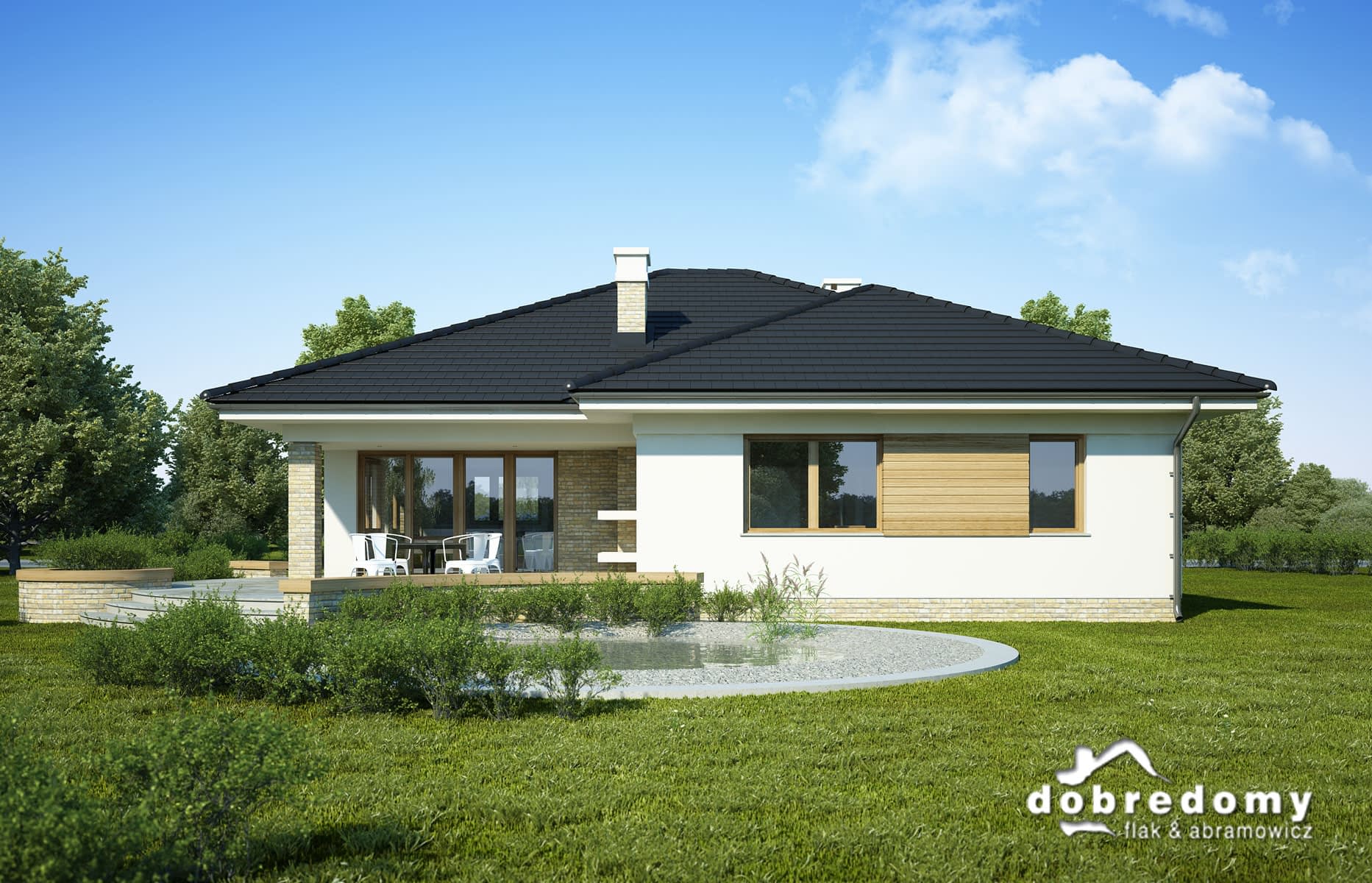 Dom parterowy, niepodpiwniczony, przeznaczony dla 4-5 osobowej rodziny. W części dziennej zlokalizowano otwartą kuchnię połączoną z pokojem dziennym poprzez jadalnię. Sypialnie z ogólnodostępną łazienką i garderobą zaprojektowano w odizolowanej części nocnej. Dodatkowo sypialnia rodziców posiada własną garderobę i łazienkę. Dostępna wersja projektu w tradycyjnej stylistyce - Afrodyta.