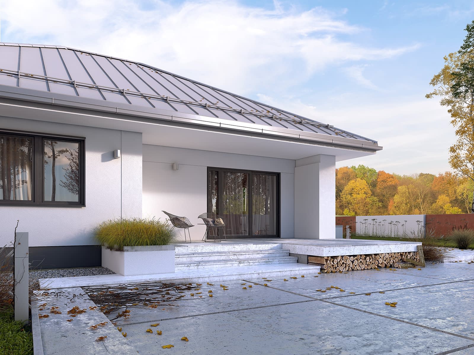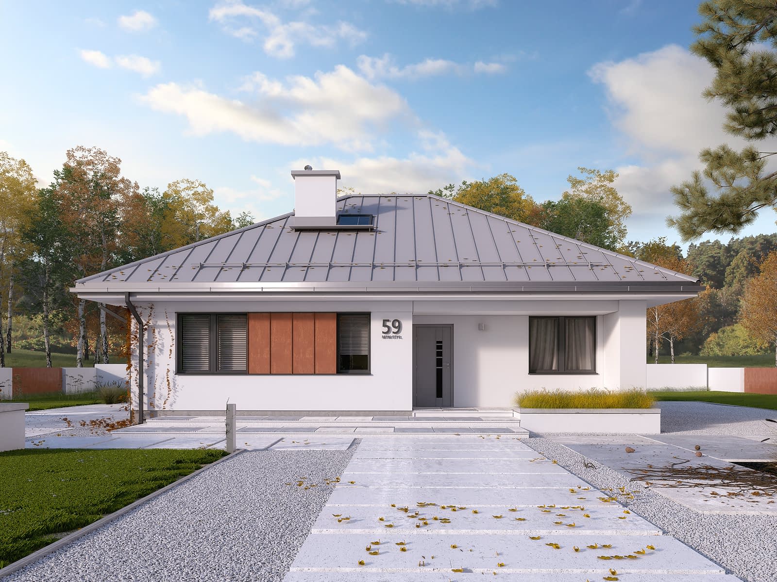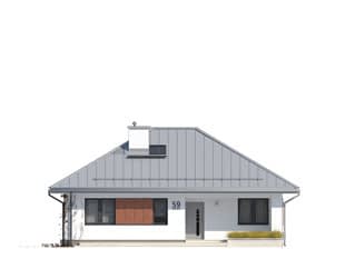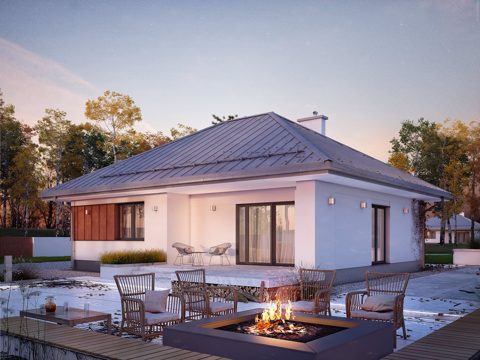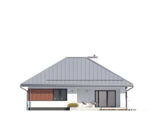 Niewielki, oszczędny dom parterowy spełniający potrzeby 2-3 osobowej rodziny. Program użytkowy podzielono na 2 strefy. Część dzienną tworzy obszerny salon z przylegającą kuchnią i spiżarnią. W części nocnej przewidziano sypialnię , łazienkę oraz dodatkowy pokój mogący pełnić funkcję pokoju dziecka lub gabinetu. W pobliżu wejścia zaprojektowano wydzieloną kotłownię. W jej sąsiedztwie od strony salonu przewidziano również miejsce na kominek. Zaletą projektu jest zadaszony taras dostępny z części dziennej, wydzielona spiżarnia w sąsiedztwie kuchni oraz podcień w strefie wejściowej do domu. Rozwiązania materiałowe nadają budynkowi spójny, nowoczesny charakter. Mak 2 jest projektem energooszczędnym, który idealnie wpisuje się na działki z wjazdem od północy.Konstrukcja