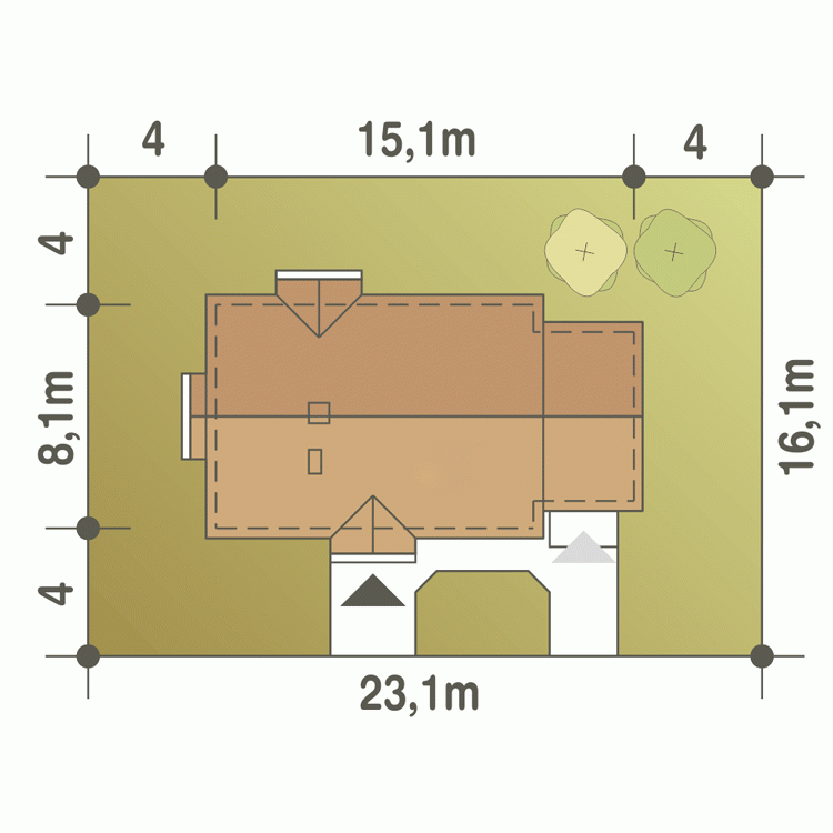 - Minimalne wymiary działki15.9 x 22.8m