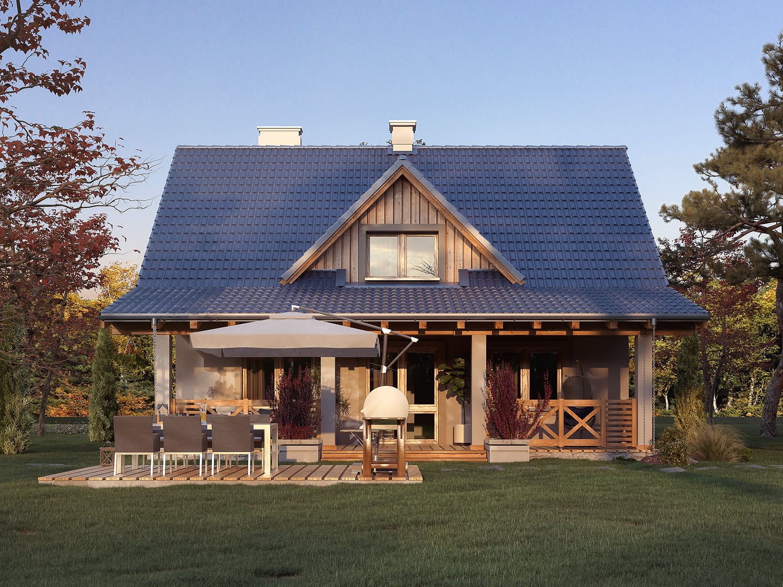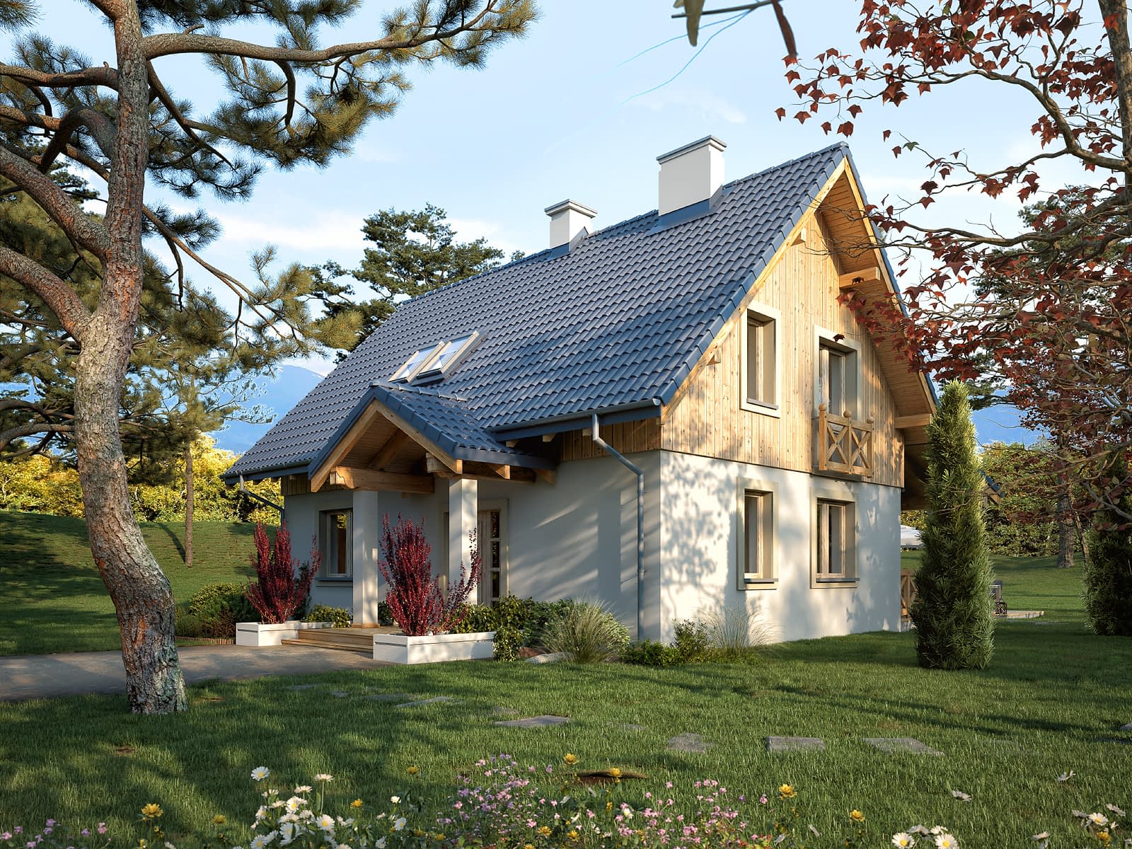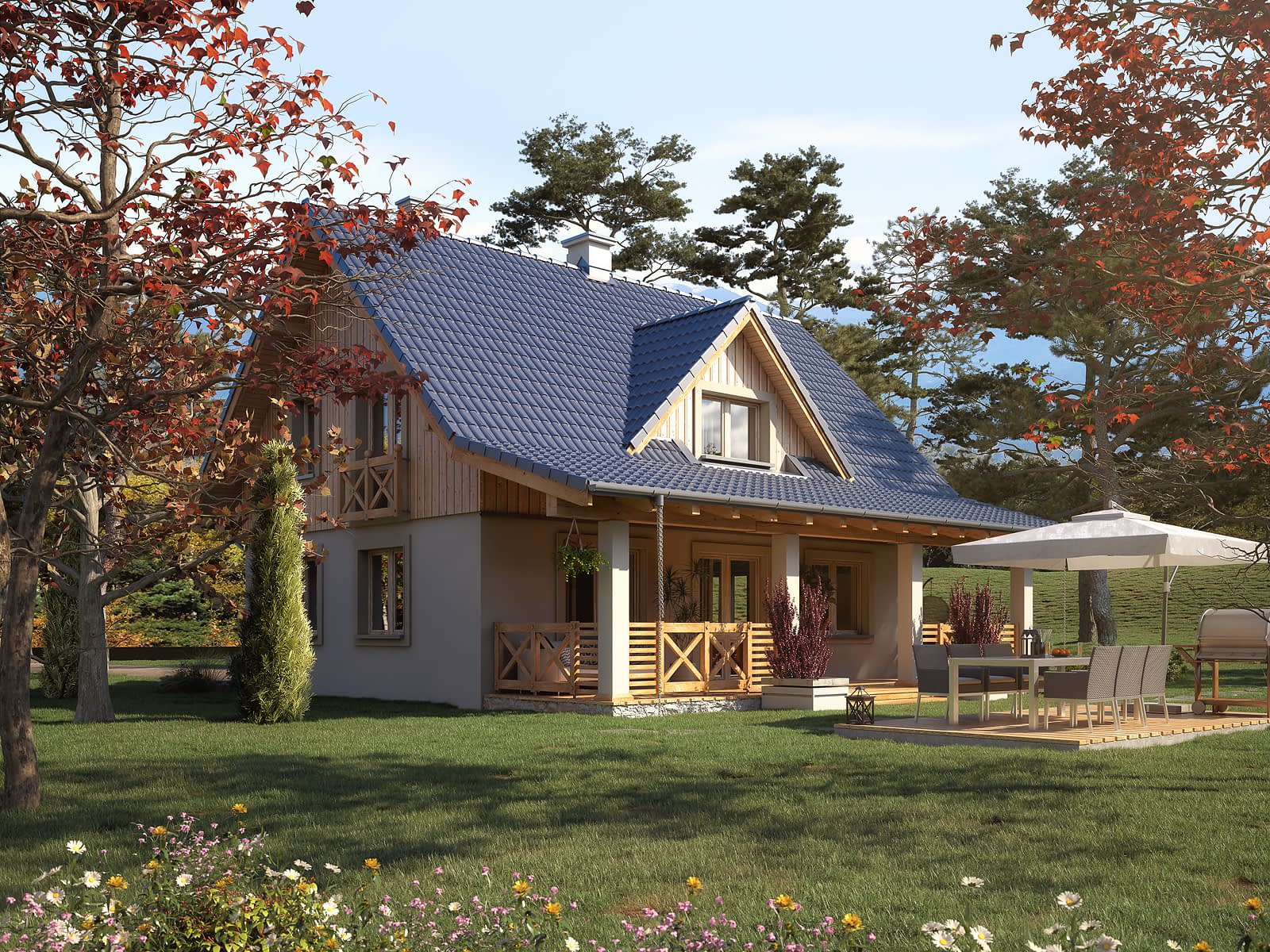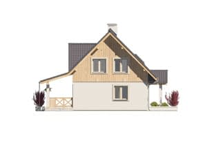 Zgrabny, mały dom mieszkalny przeznaczony dla 3 - 4-osobowej rodziny. W tak niewielkim domu na uwagę zasługuje duży otwarty salon z wygodnym miejscem na duży stół. Duży, zadaszony taras będzie świetnym miejscem popołudniowych rozmów. Na poddaszu zaprojektowano trzy duże sypialnie i przestronną łazienkę.Konstrukcja