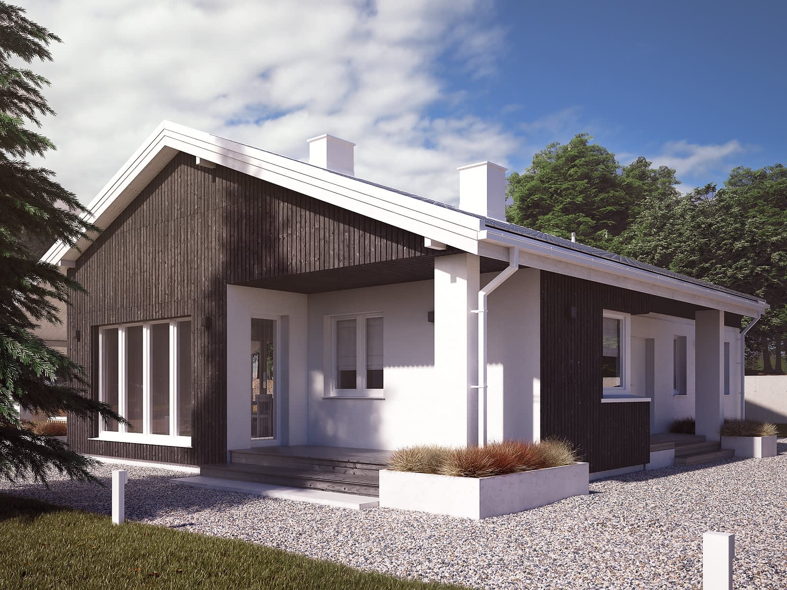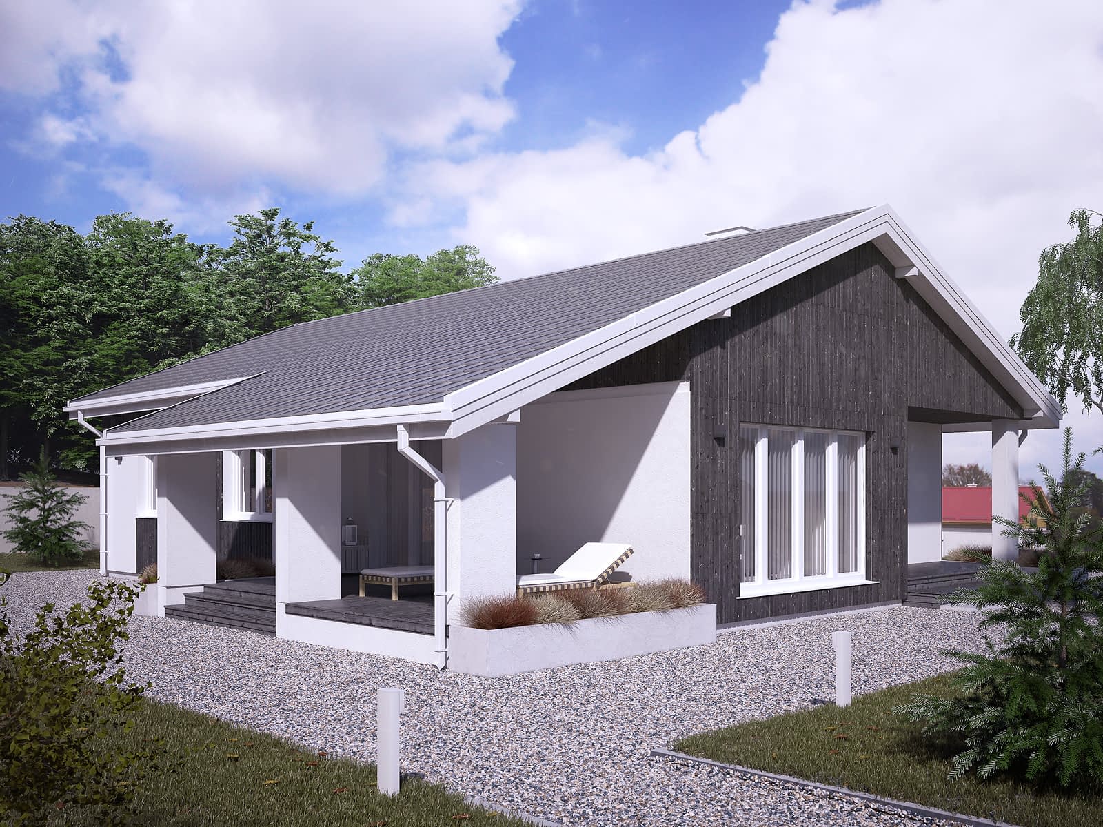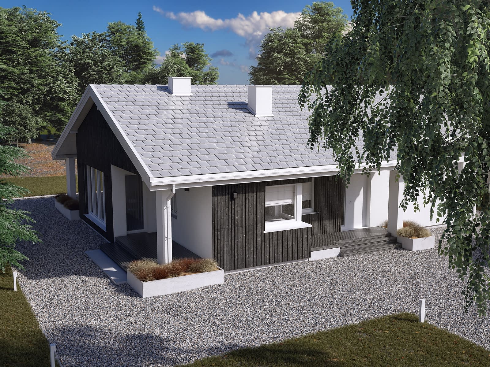 Projekt Malmo jest propozycją parterowego domu mieszkalnego, przeznaczonego dla 3-4 osobowej rodziny. Program funkcjonalny domu składa się z obszernej sypialni rodziców, dwóch mniejszych pokoi dla dzieci, łazienki, kotłowni, wiatrołapu, kuchni ze spiżarnią oraz salonu z kominkiem i przestrzenią na duży stół jadalny. Obszerne przeszklenia umożliwiają dodatkowe doświetlenie części dziennej, nadając jej wnętrzu przestronny, współczesny charakter. Asymetryczna bryła budynku przykryta jest dwuspadowym dachem obejmującym również tarasy dostępne z salonu. Pokrycie dachu szarą płaską dachówką, oraz rozwiązania materiałowe na elewacji dodają projektowi nowoczesnego wyrazu.Konstrukcja