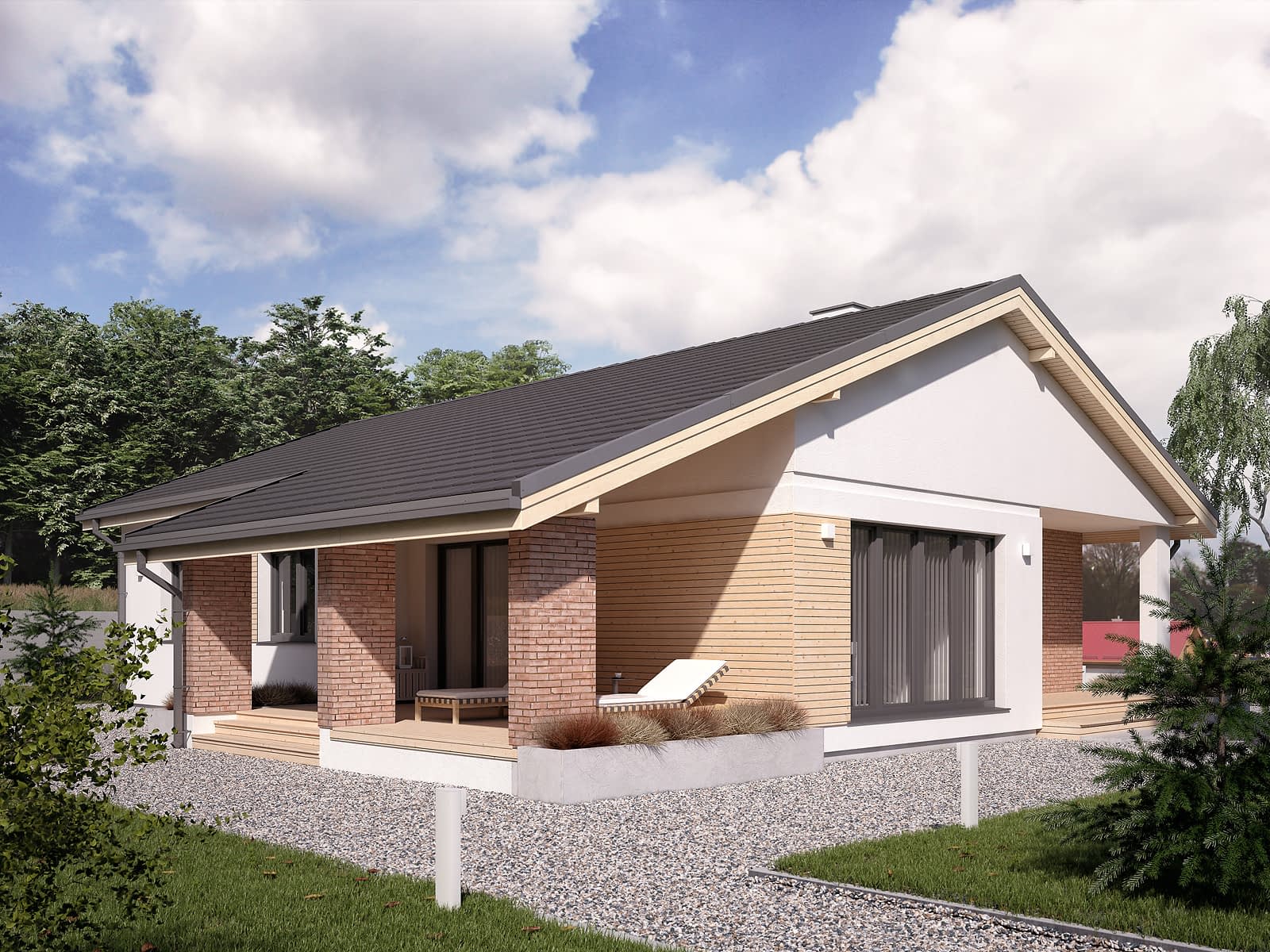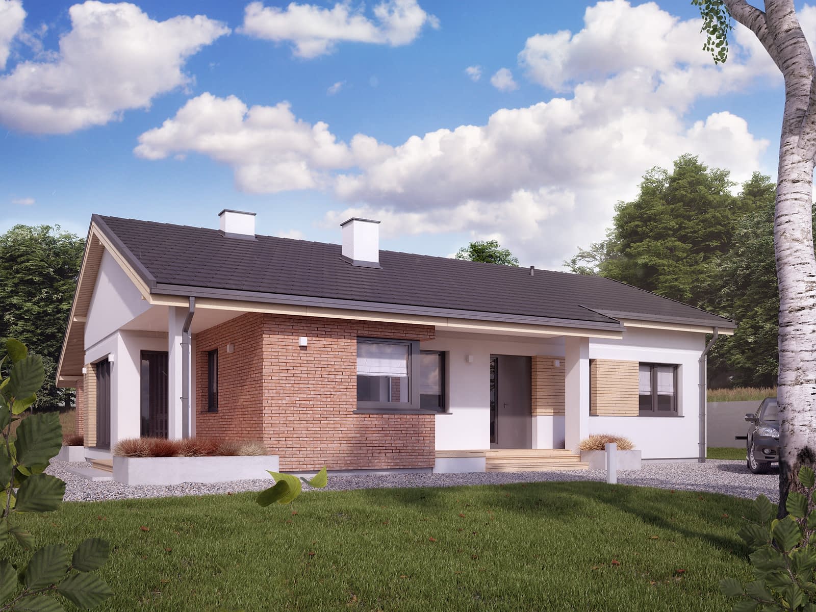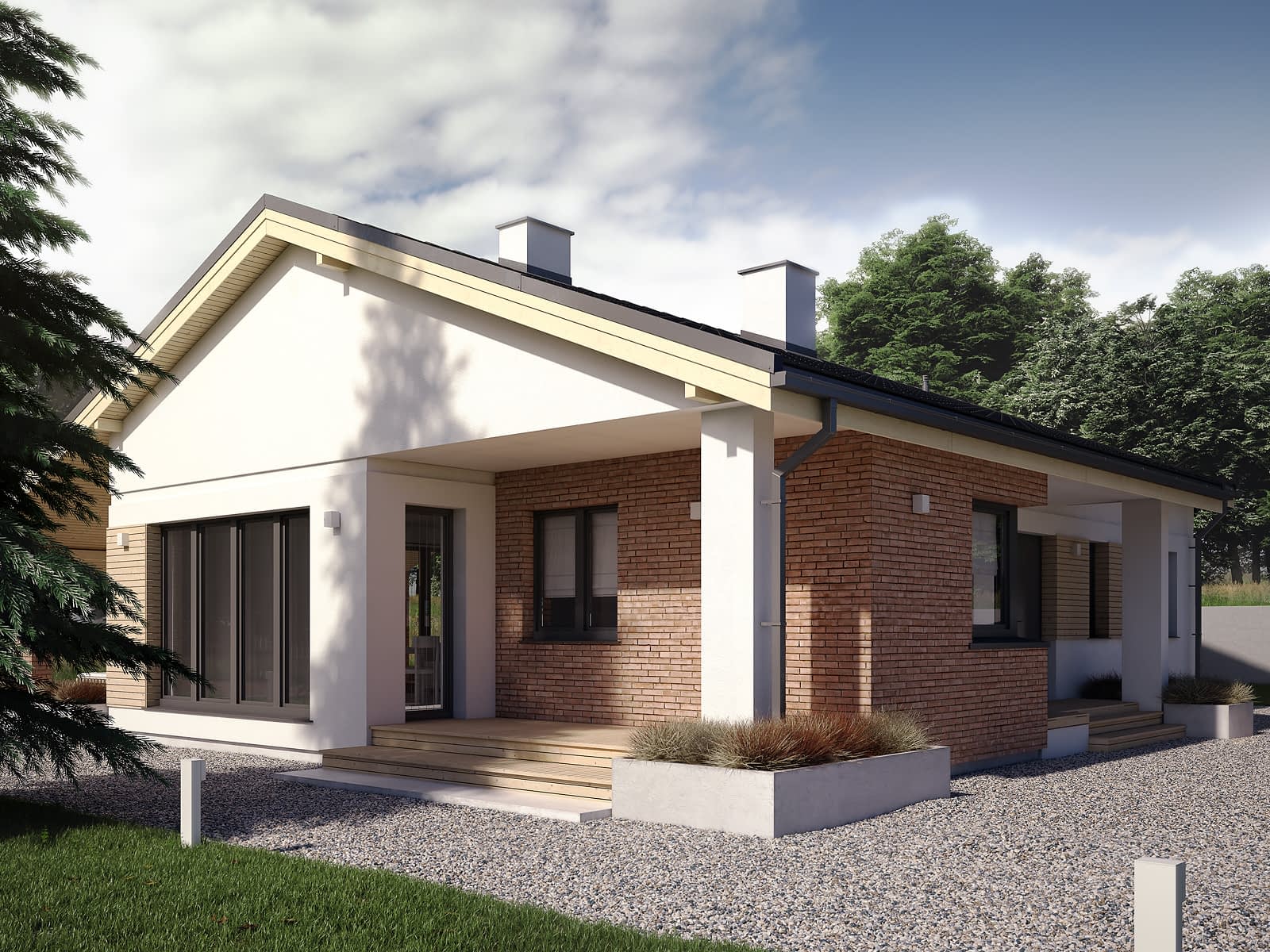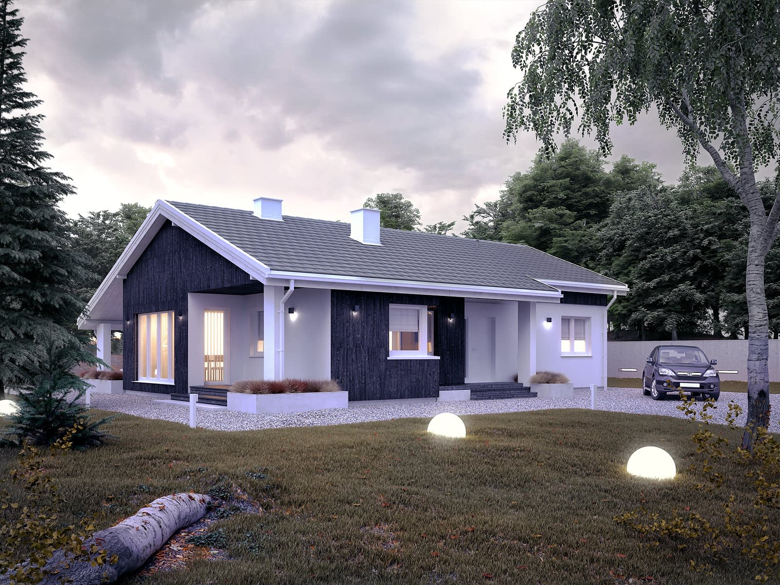 Projekt Malmo jest propozycją parterowego domu mieszkalnego, przeznaczonego dla 3-4 osobowej rodziny. Program funkcjonalny domu składa się z obszernej sypialni rodziców, dwóch mniejszych pokoi dla dzieci, łazienki, kotłowni, wiatrołapu, kuchni ze spiżarnią oraz salonu z kominkiem i przestrzenią na duży stół jadalny. Obszerne przeszklenia umożliwiają dodatkowe doświetlenie części dziennej, nadając jej wnętrzu przestronny, współczesny charakter. Asymetryczna bryła budynku przykryta jest dwuspadowym dachem obejmującym również tarasy dostępne z salonu. Pokrycie dachu szarą płaską dachówką, oraz rozwiązania materiałowe na elewacji dodają projektowi nowoczesnego wyrazu.Konstrukcja