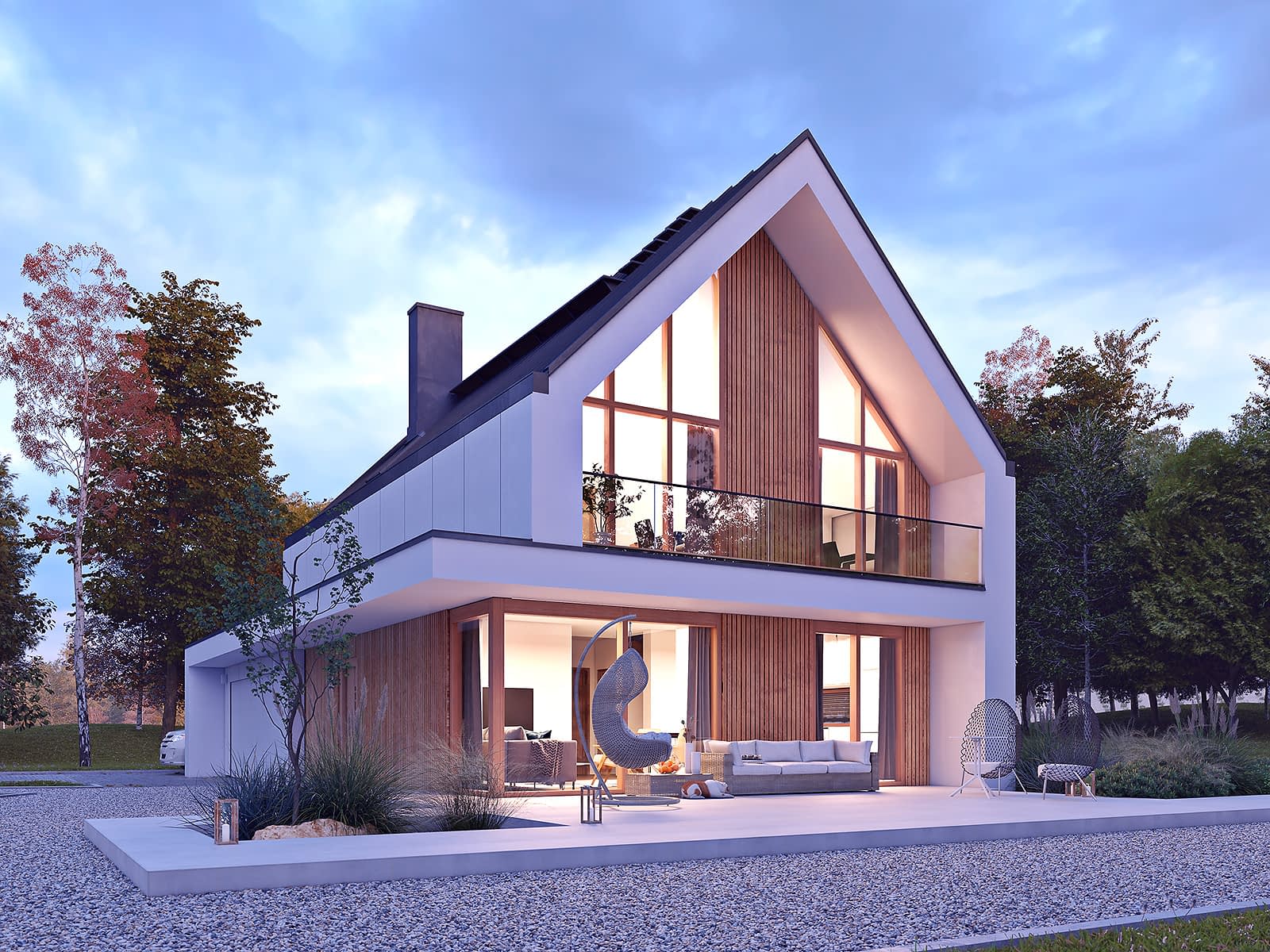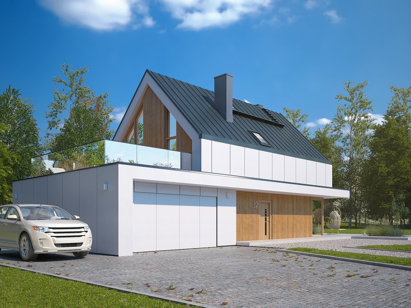 Projekt Malutki 12 to nowoczesny dom, który przyciąga uwagę swoją wyjątkową estetyką i funkcjonalnością. Należy do kolekcji inspirowanej nowoczesną stodołą, lecz wyróżnia się odważnym designem, łączącym minimalistyczną formę z charakterystycznymi detalami elewacyjnymi. Kontrastujące materiały na elewacji dodają bryle wyrazistości i sprawiają, że dom staje się prawdziwą ozdobą otoczenia. W połączeniu z naturalną szalówką budynek zyskuje nietuzinkowy wygląd, który łączy tradycyjne elementy z nowoczesną elegancją.Konstrukcja