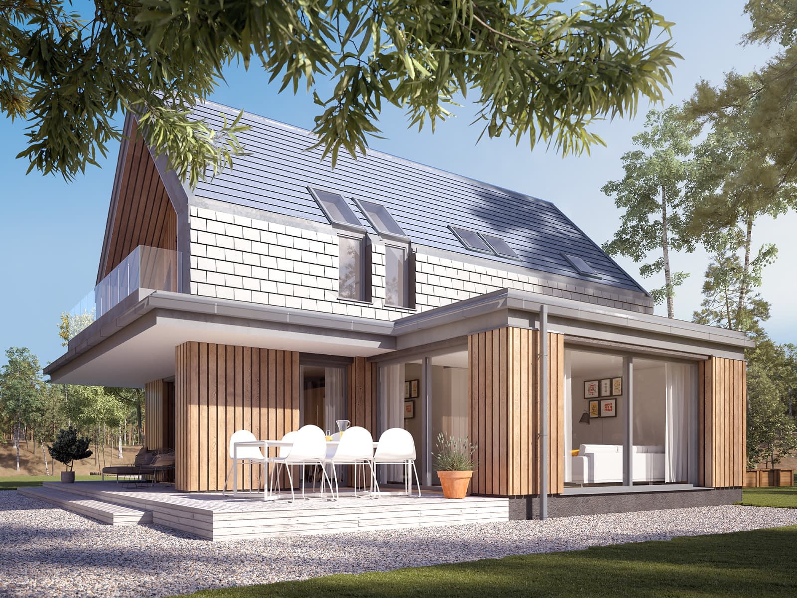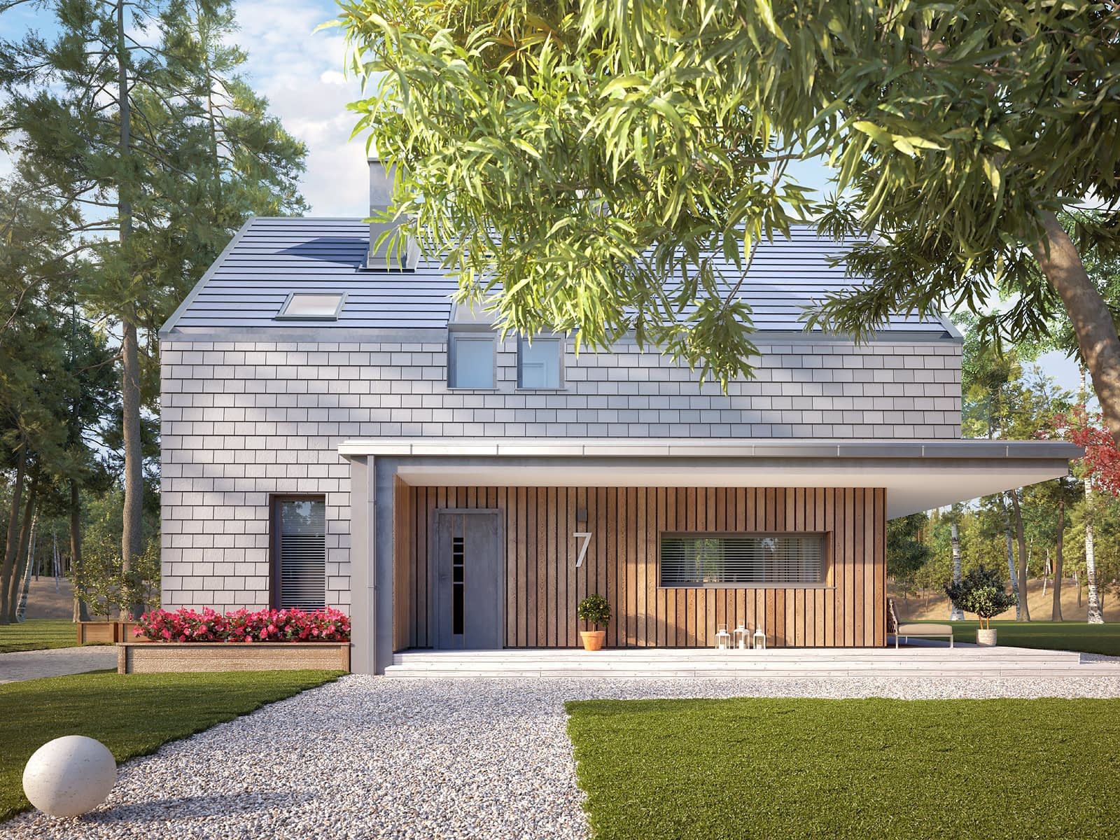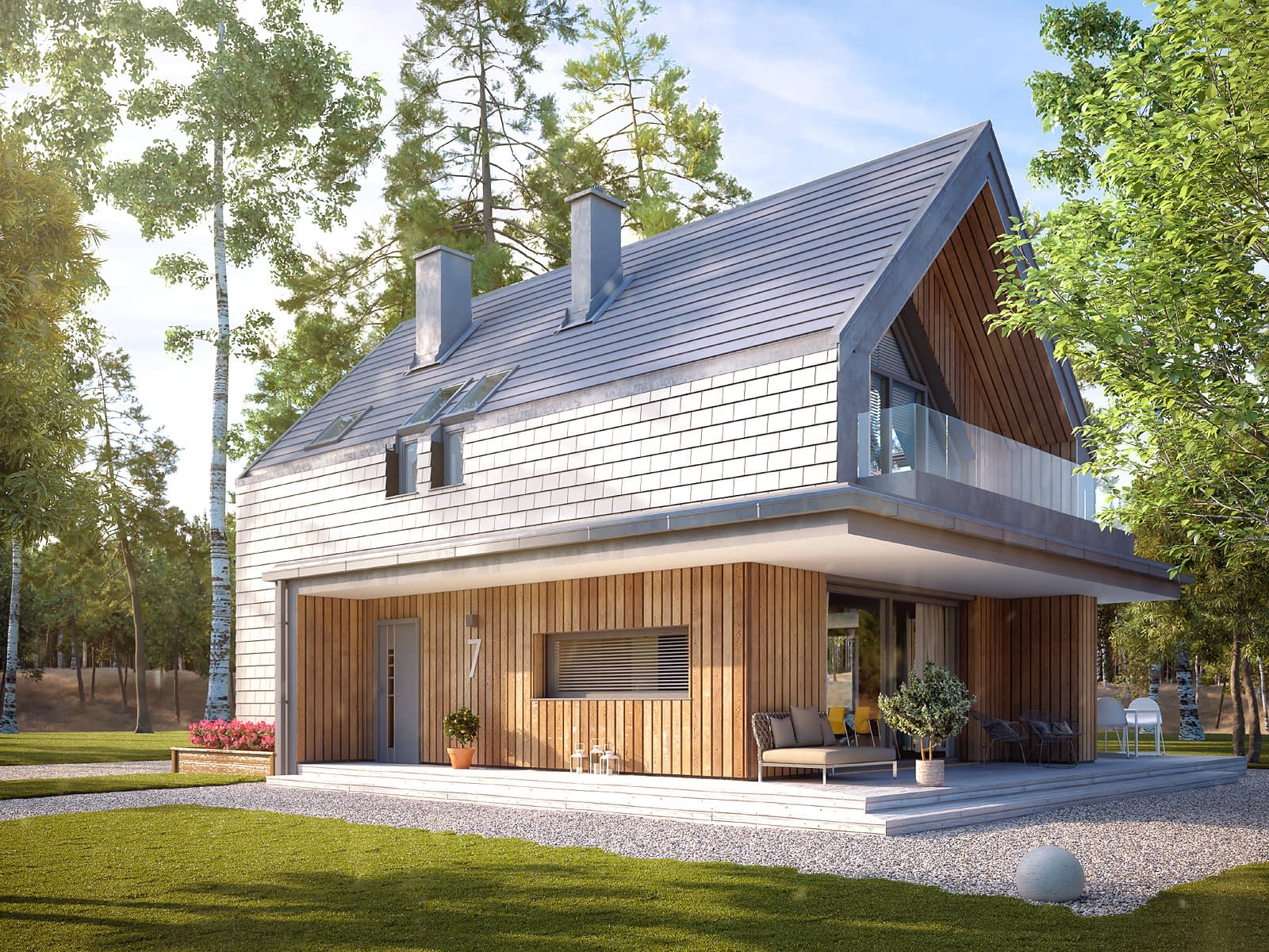 Malutki 7 to projekt domu z poddaszem użytkowym, który podobnie jak pozostałe projekty z tej serii, został zaprojektowany w stylu nowoczesnej stodoły. Nowoczesna bryła budynku została rozbudowana o przestronny salon, zachowując przy tym charakterystyczne dla tego stylu elementy wykończenia. Prosta bryła z dwuspadowym dachem bez okapów została wykończona płaską blachodachówką, które spójnie przechodzi z dachu na elewację. W projekcie zaprojektowano dużą kuchnię z wyspą oraz jadalnię z miejscem na duży stół jadalniany. Obok kuchni znajduje się praktyczna spiżarnia. Salon został zaprojektowany w nowej części domu, zyskując na powierzchni użytkowej. Cechą charakterystyczną części dziennej z salonem i kuchni są liczne panoramiczne przeszklenia, które zwiększają walory estetyczne tego wnętrza. Na parterze zaprojektowano także kotłownię na gaz, dodatkowy pokój oraz łazienkę z prysznicem. Na poddaszu znajduje się część nocna, na którą składają się trzy sypialnie oraz rodzinna łazienka pralnią. Największa sypialnia posiada prywatną garderobę oraz wyjście na balkon.Konstrukcja