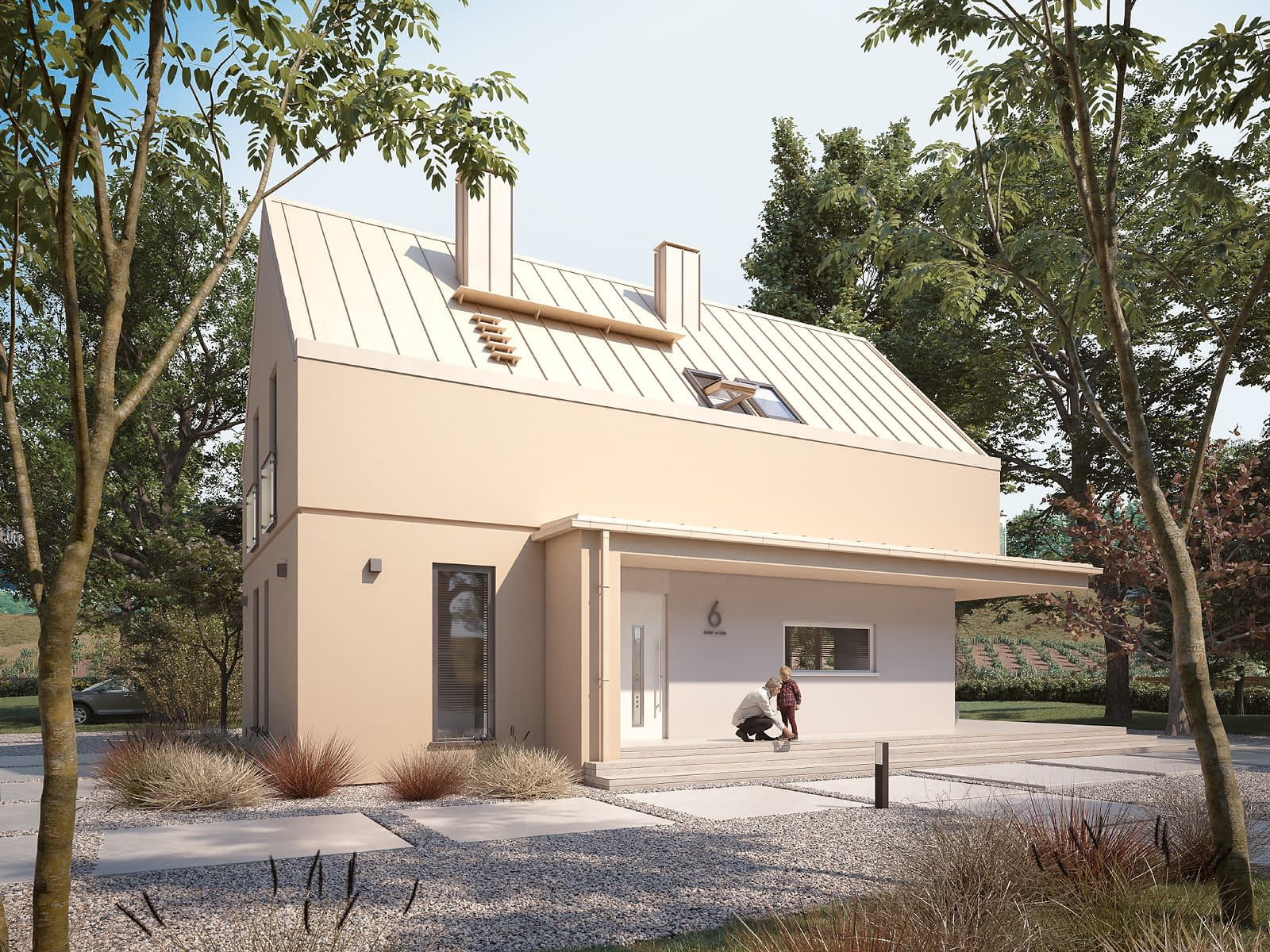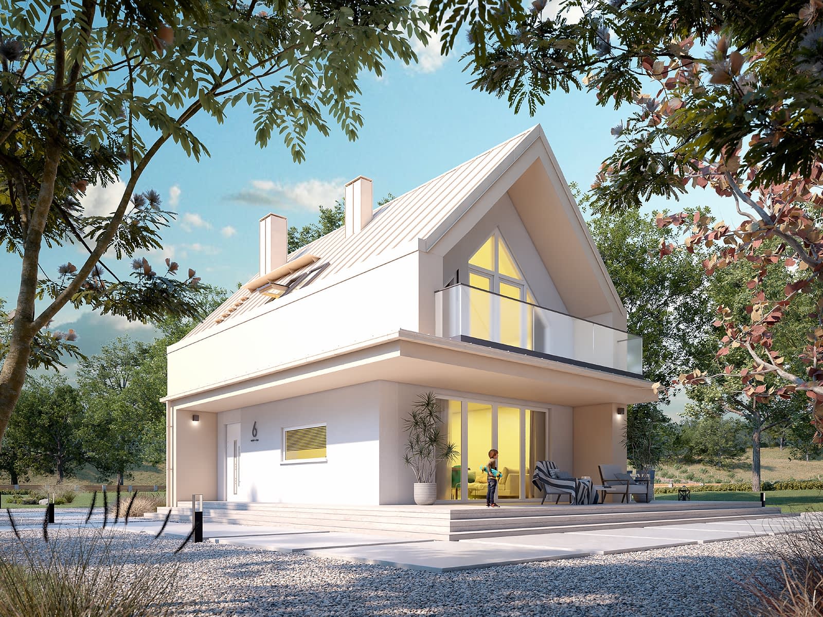 Projekt domu Malutki 8 to projekt domu z użytkowym poddaszem, zaprojektowany w stylu nowoczesnej stodoły. Prosta bryła budynku została przykryta dwuspadowym dachem bez okapów, który przykryto blachą na rąbek w kolorze piaskowym. Elewacja domu została wykończona tynkiem, którego kolorystyka jest spójna z dachem. Oryginalny wygląd budynku, w połączeniu z wysokimi przeszkleniami oraz funkcjonalnym układem wnętrz podkreślają nowoczesny charakter domu. Układ funkcjonalny został podzielony na strefę dzienną na parterze oraz nocną na poddaszu. Strefa dzienna to połączenie salonu z jadalnią oraz kuchnią z przylegającą do niej spiżarnią. Układ parteru uzupełnia sypialnia, łazienka oraz pomieszczenie gospodarcze z wejściem przez przedsionek. Strefa nocna na poddaszu składa się z trzech sypialni oraz łazienki. Główna sypialnia posiada dodatkowo garderobę oraz wyjście na balkon stanowiący jednocześnie zadaszenie tarasu na parterze.Konstrukcja