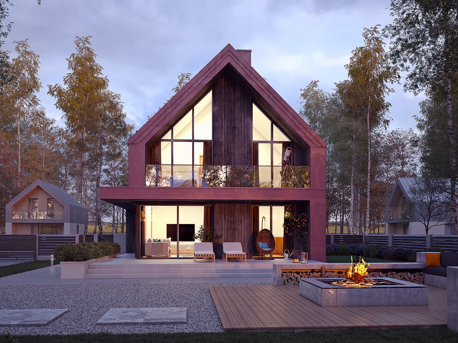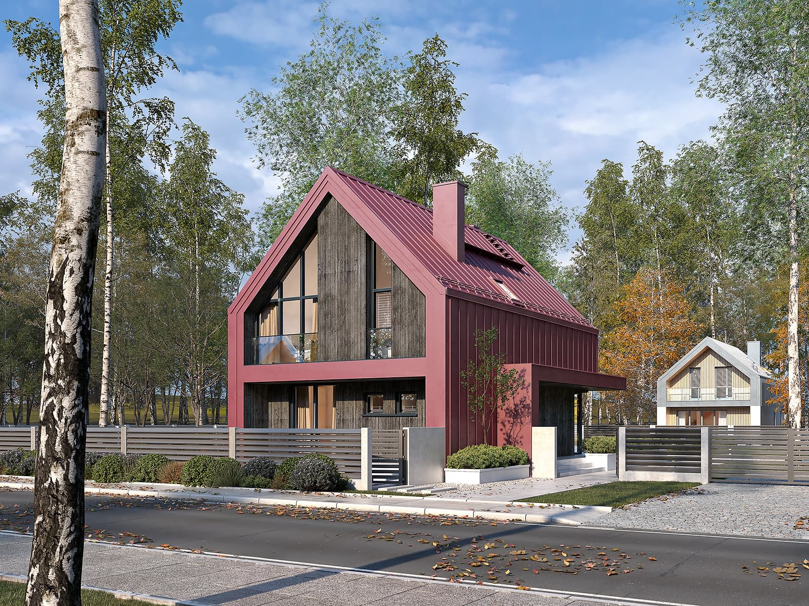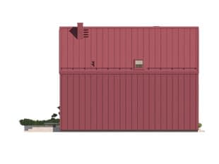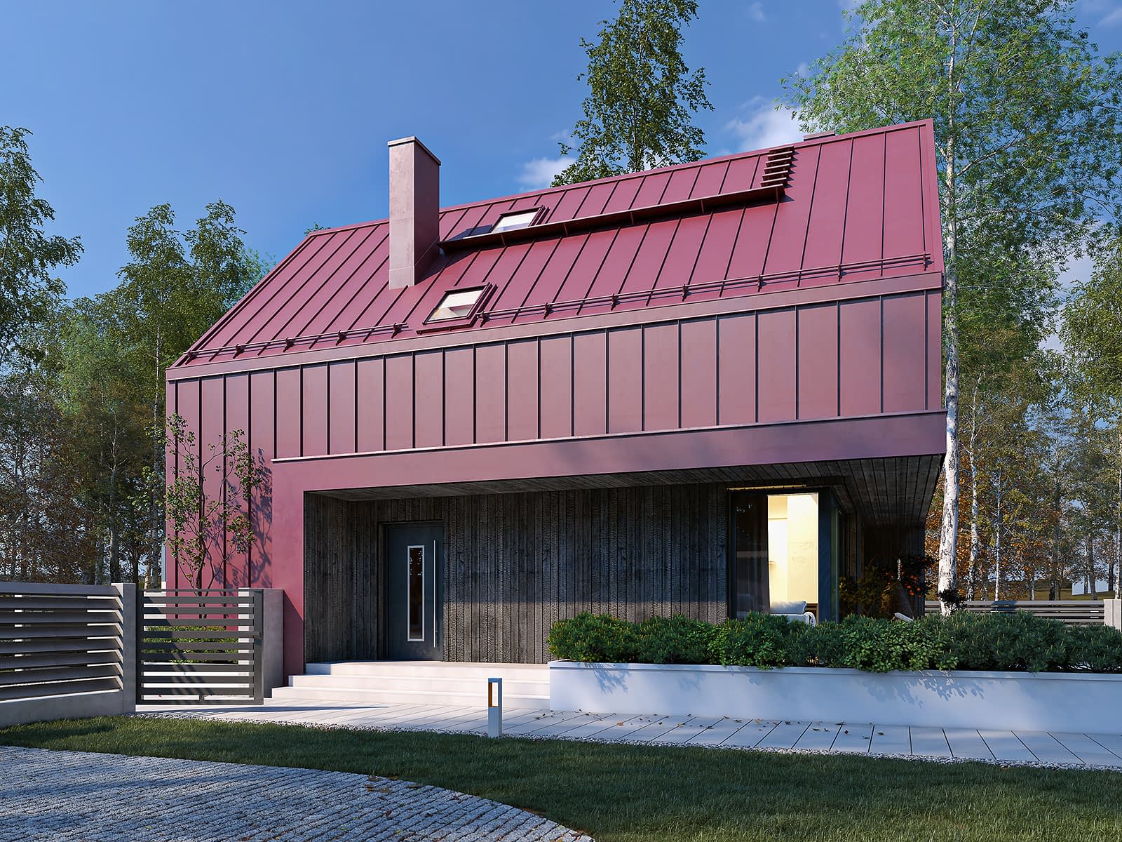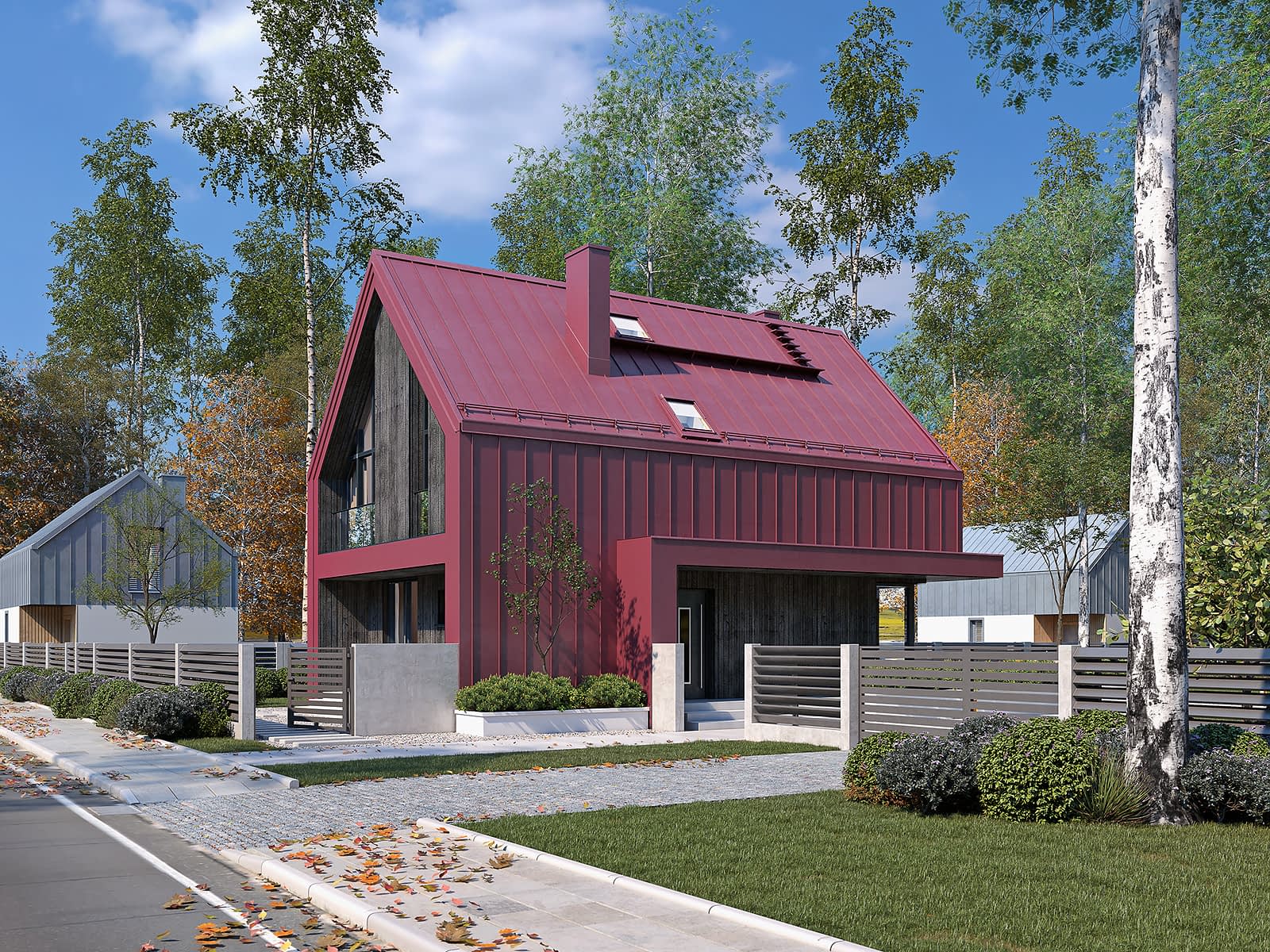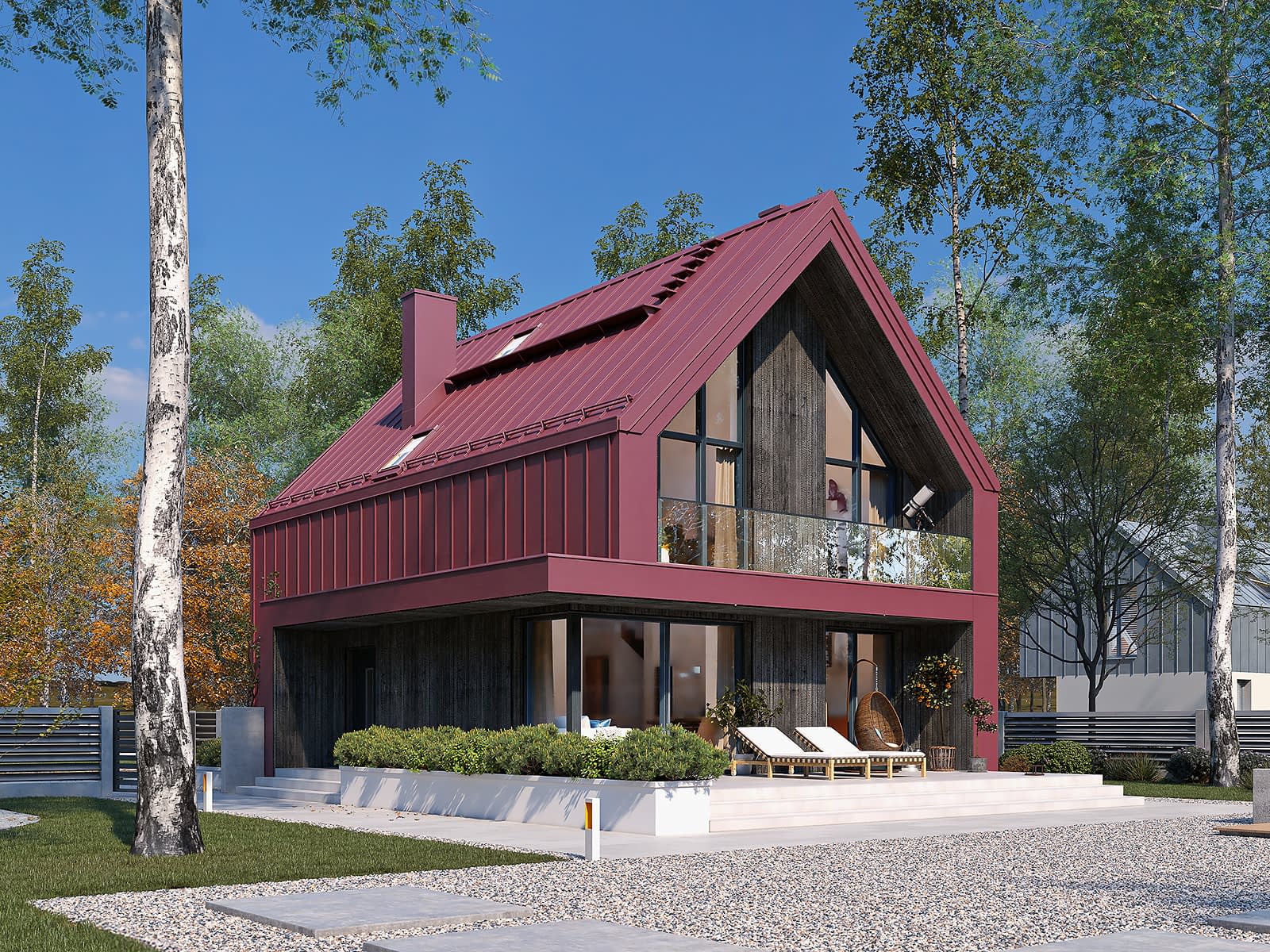 Projekt Malutki 9 to nowoczesny dom, który przyciąga uwagę swoją wyjątkową estetyką i funkcjonalnością. Należy do kolekcji inspirowanej nowoczesną stodołą, lecz wyróżnia się odważnym designem, łączącym minimalistyczną formę z charakterystycznymi detalami elewacyjnymi. Blacha na rąbek stojący w głębokim odcieniu wiśniowym nadaje bryle wyrazistości i sprawia, że dom staje się prawdziwą ozdobą otoczenia. W połączeniu z naturalną opalaną szalówką budynek zyskuje nietuzinkowy wygląd, który łączy tradycyjne elementy z nowoczesną elegancją.Konstrukcja