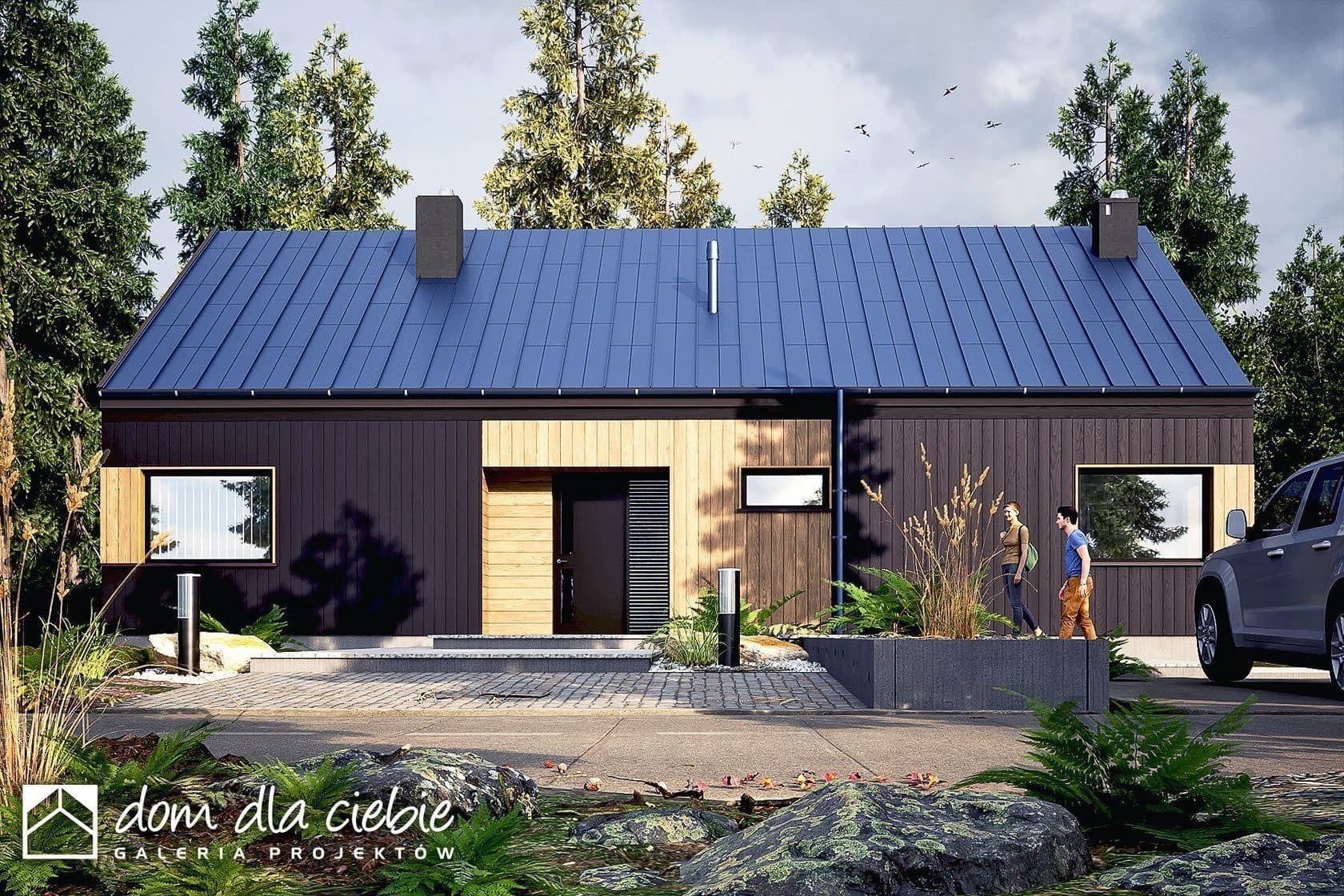 Projekt Mamba to propozycja małego parterowego domu jednorodzinnego w nowoczesnym stylu. Przeznaczony jest dla 4-osobowej rodziny. Dom został opracowany w tradycyjnej technologii murowanej ze stropem oraz klasycznej więźbie dachowej. Prostokątna bryła domu przekryta jest dachem dwuspadowym o kącie nachylenia 35 stopni.Projekt zawiera część wspólną tj. salon z kominkiem, kuchnię ze spiżarnią oraz jadalnię. Korytarz prowadzi do części indywidualnej, gdzie mamy dwie pojedyncze identyczne sypialnie pojedyncze, podwójną sypialnię z indywidualna łazienką oraz miejscami na wbudowane szafy, wspólną łazienkę oraz pomieszczenie techniczne z piecem CO.Mamba to mały, ale wygodny i przemyślany projekt dla współczesnej rodziny - świetna inwestycja na przyszłość.Klimatyczna ciemna elewacja, modna i elegancka będzie się doskonale komponować w zieleni.