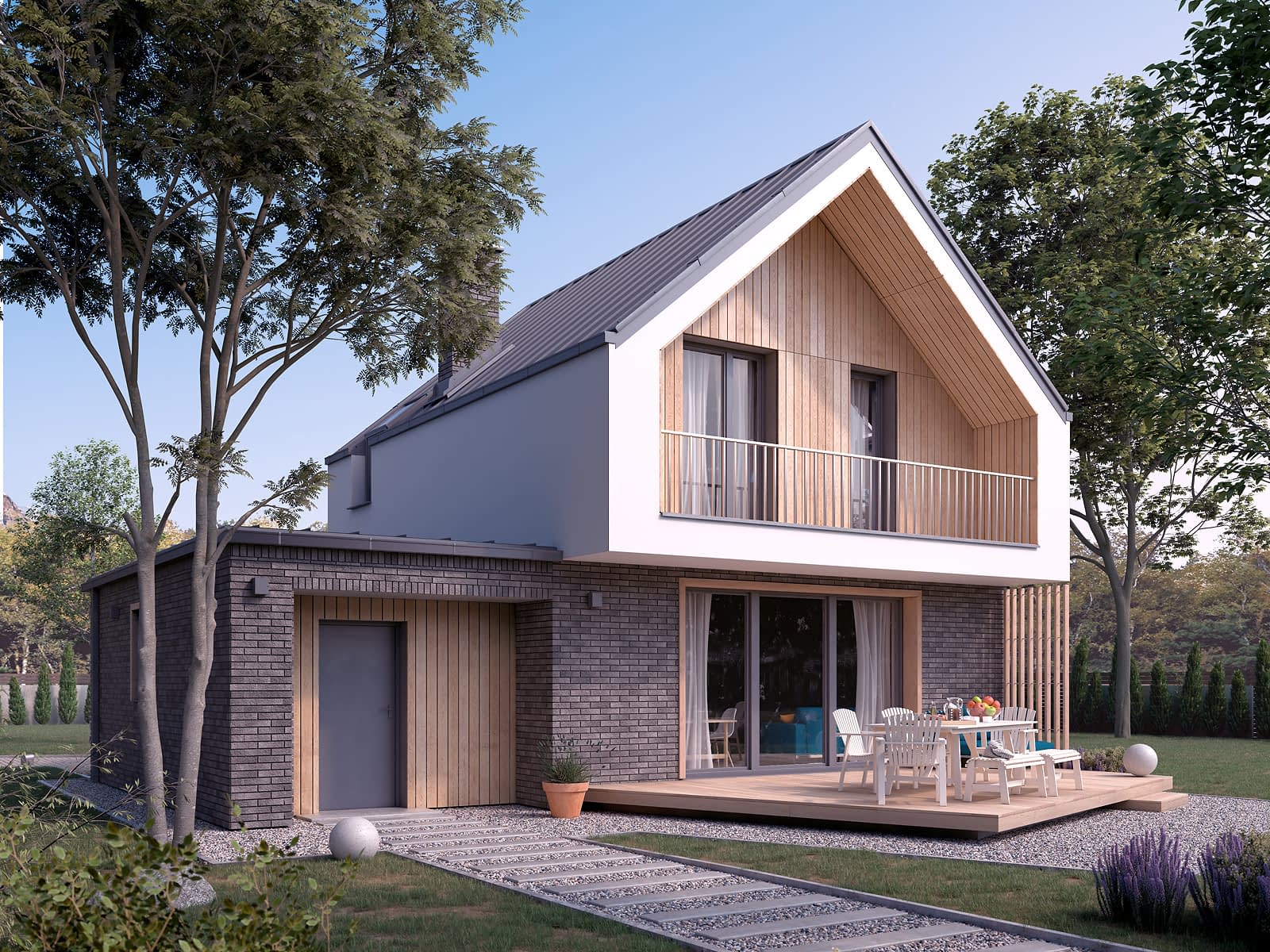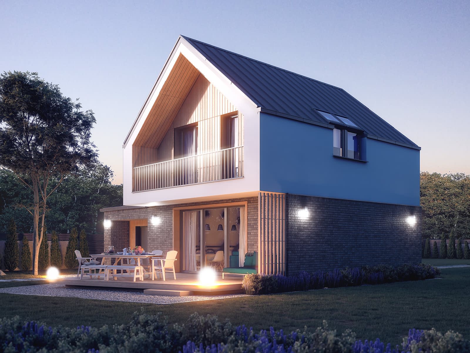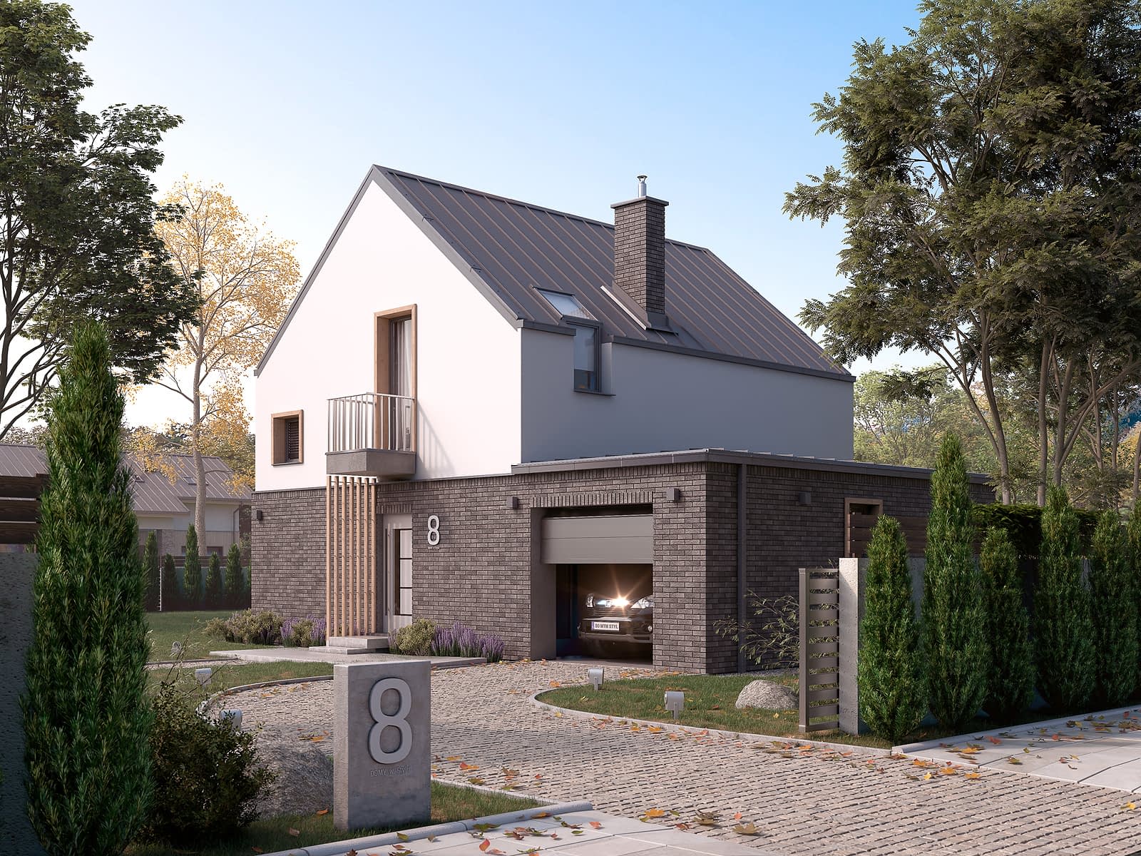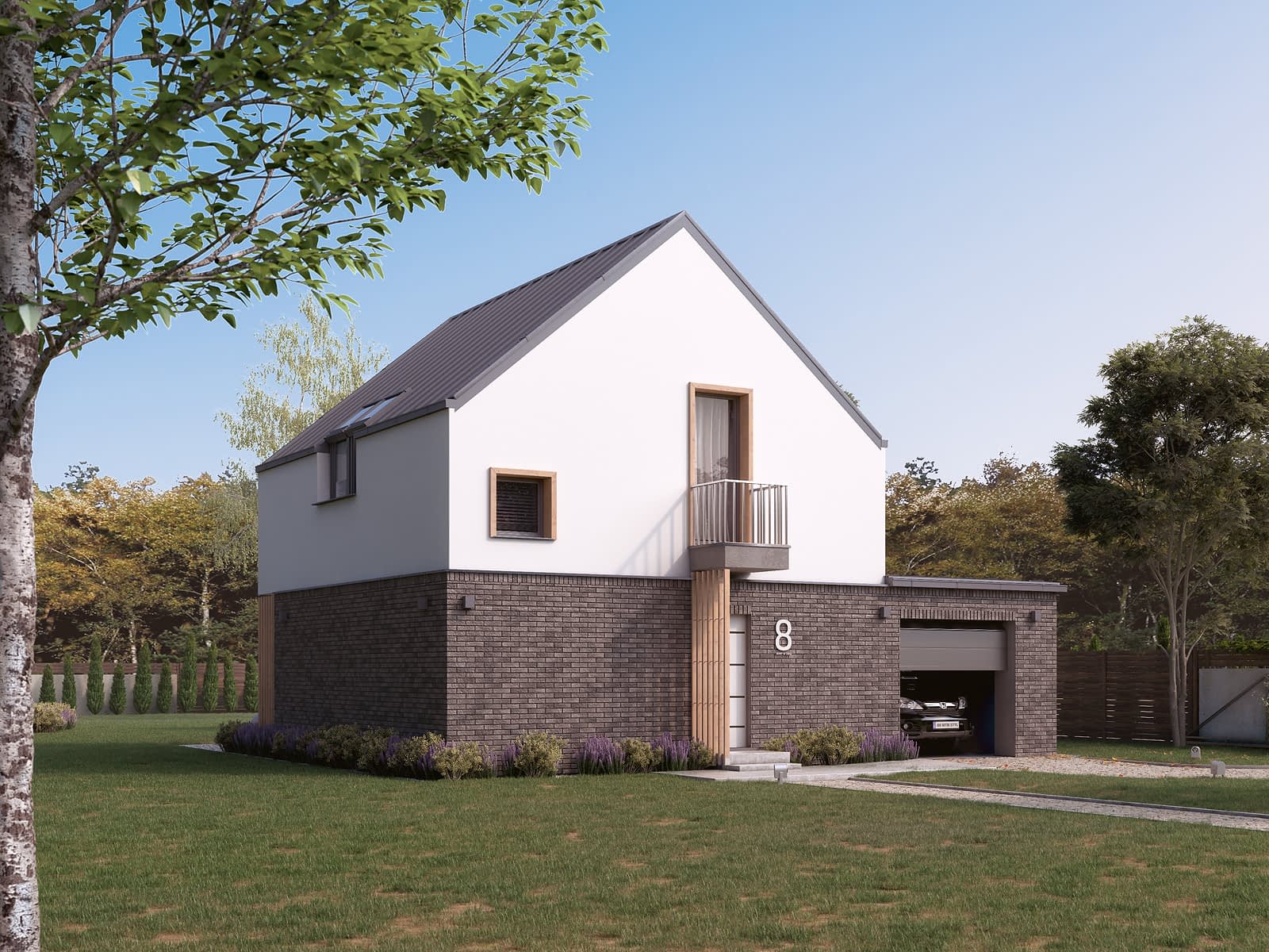 Mandarynka to projekt współczesnego domu dla niewielkiej rodziny. Otwarta przestrzeń parteru inspiruje do stworzenia nowoczesnej strefy dziennej. Poddasze z sypialniami i łazienką przeznaczoną dla domowników pełni rolę strefy prywatnej. Funkcjonalny rozkład pomieszczeń obniża koszty budowy oraz gwarantuje wygodne warunki mieszkalne. Budynek z dwuspadowym dachem o stonowanej estetyce może harmonijnie współgrać zarówno z otoczeniem miejskim, jak i naturalnym.Konstrukcja