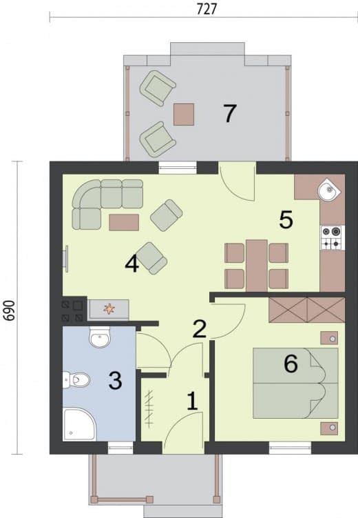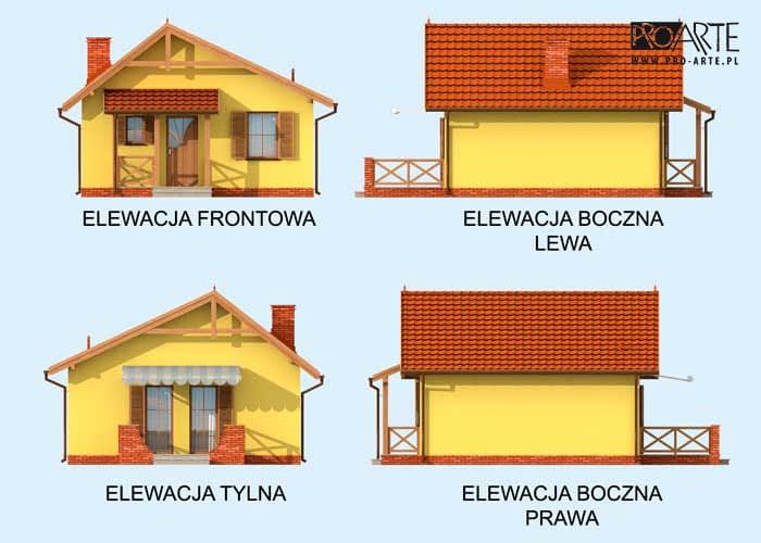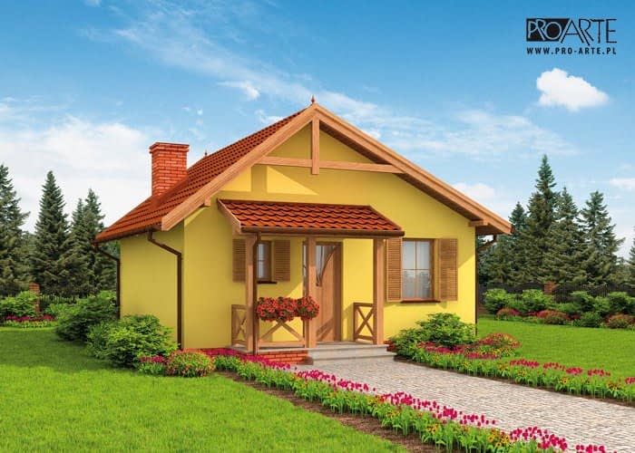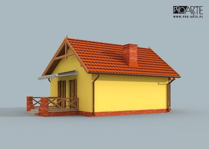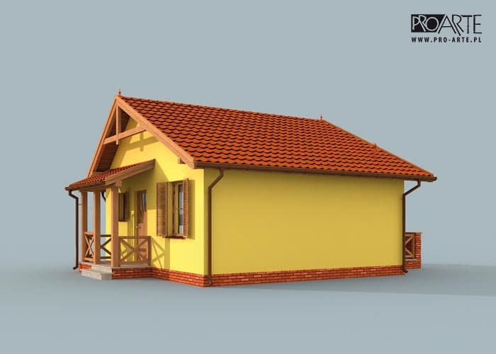 Ten projekt dedykowany jest tym wszystkim, którzy są zdecydowani na inwestycję w dom letniskowy (dostępny także jako całoroczny). Praktyczne i estetyczne rozwiązania takie jak dwuspadowy dach, gustowne zestawienie kolorów elewacji zachęcają potencjalnych inwestorów. Podobnie dachówki i cokolik odpowiadają sobie kolorami, tworząc przemyślaną, zrównoważoną kompozycję. Zadaszone wejście od południa zachęca do odwiedzenia wnętrz. Weranda wiedzie do wiatrołapu, z którego przechodzi się do przedpokoju. Po lewej stronie znajduje się łazienka, natomiast po prawej stronie komunikacji jest dość obszerna sypialnia. Od komunikacji na wprost usytuowany jest pokój dzienny z aneksem kuchennym, w którym znajduje się kominek. Jest to miejsce, które z pewnością w zimowe wieczory będzie skupiać życie wypoczywających w domu ludzi. Letnie dni z pewnością nierozłącznie będą kojarzyć się z czasem spędzonym w wesołej atmosferze przy grillu na tarasie.