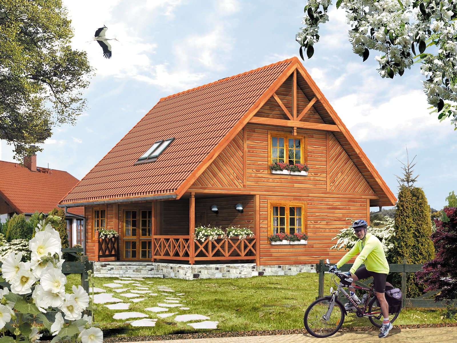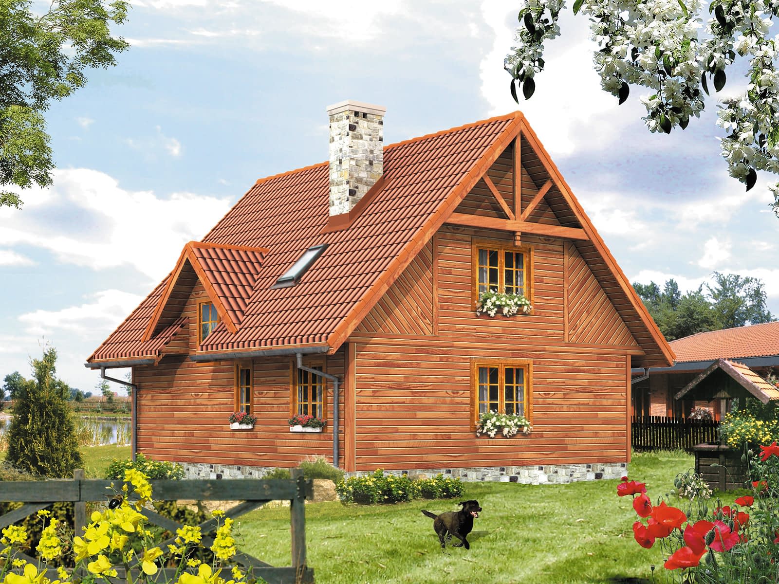 Ściany: drewniane, szkieletowe, Stropy: na belkach drewnianych, Dach: blachodachówka,Rzuty