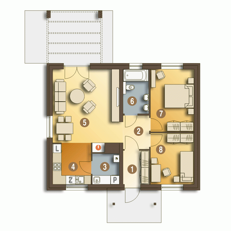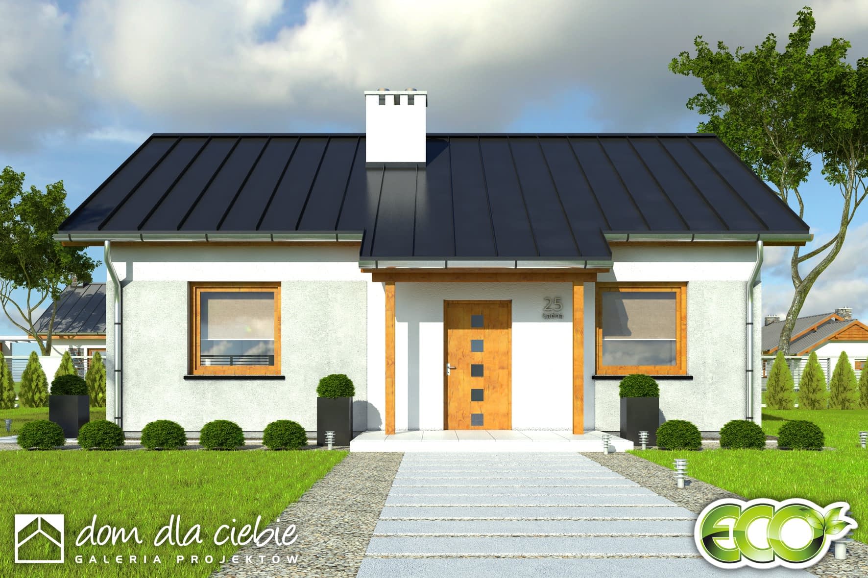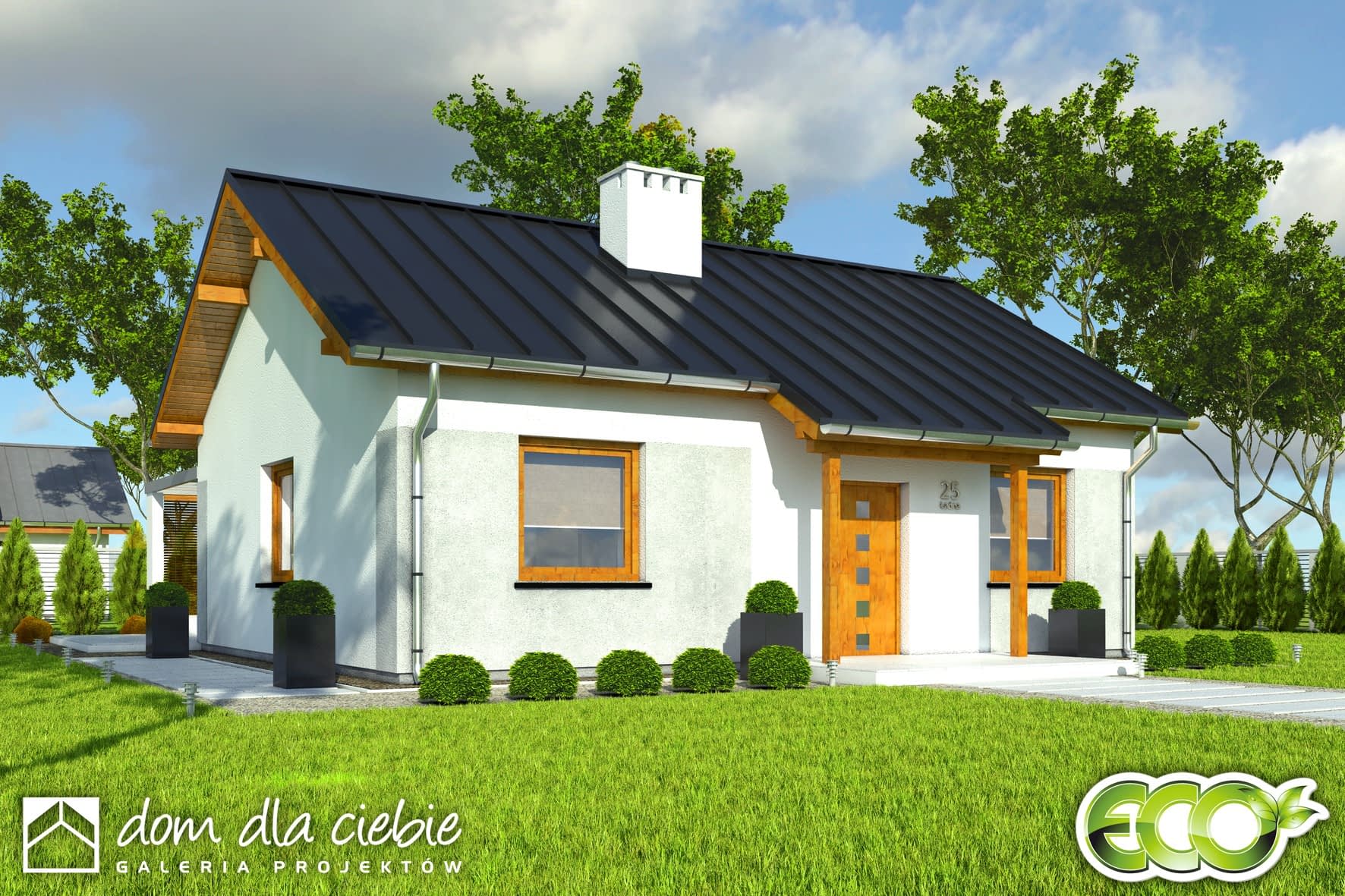 Projekt parterowego domu jednorodzinnego Marcin bez poddasza do adaptacji, zaprojektowany jest z myślą o 3 do 4 osobowej rodzinie. Marcin to projekt domu z serii ECO, domów tanich w budowie i utrzymaniu. Dach zaprojektowano na tradycyjnej więźbie dachowej z niedużym nachyleniem. Przestrzeń poddasza można wykorzystać na cele magazynowe. Dom przy niewielkiej powierzchni przewiduje podział na część ogólnodostępną, w której mamy do dyspozycji salon z kominkiem i miejscem do spożywania posiłków oraz kuchnię i kotłownię z pralnią. W części prywatnej zaprojektowano dwie sypialnie i wygodną łazienkę z oknem skierowanym na ogród. Wygodny wiatrołap z miejscem w którym udało się zmieścić dwie wygodne szafy wnękowe oraz nieduży hol to wygodna część wejściowa domu. Projekt domu Marcin to bardzo dobra propozycja dla osób szukających, przemyślanych rozwiązań architektonicznych, zapewniających nieduże koszty budowy. Prosta bryła budynku i dwuspadowy dach to parametry, które decydują o niskim koszcie budowy tego domu.