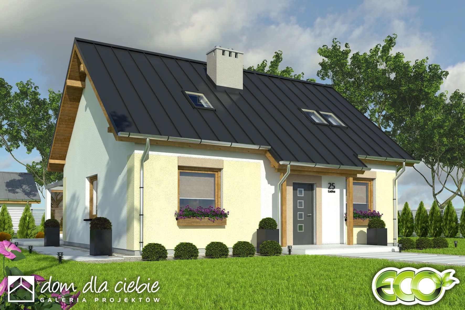 Marcin II to inna wersja projektu Marcin. W tej wersji mamy powiększony kąt nachylenia dachu do 40stopni i zaprojektowane poddasze użytkowe z dachem na ściance kolankowej wysokości 25cm. Marcin II to dom z serii ECO, czyli tani w budowie i utrzymaniu, przeznaczony jest również dla 3 do 4 osobowej. Marcin II posiada zaprojektowane poddasze z dwoma sypialniami i łazienką. Na poddasze prowadzą zabiegowe schody w narożniku salonu. Projekt przy 100m2 powierzchni użytkowej, przewiduje zachowanie podziału podział na część ogólnodostępną, w której mamy salon z miejscem do spożywania posiłków, kominkiem, kuchnią i pomieszczeniem gospodarczym z piecem na paliwo gazowe. W części prywatnej mamy przewidziane dwie sypialnie i wspólną łazienkę. W strefie wejściowej mamy natomiast wiatrołap z szafami wnękowymi oraz wygodny hol. Projekt domu Marcin II dzięki prostej bryle i prostemu zadaszeniu, gwarantuje niskie koszty budowy tego domu. Projekt posiada kompletnie zaprojektowaną funkcję oraz standard domu energooszczędnego, dlatego praktycznie nie wymaga wprowadzania zmian na etapie adaptacji w tym zakresie.