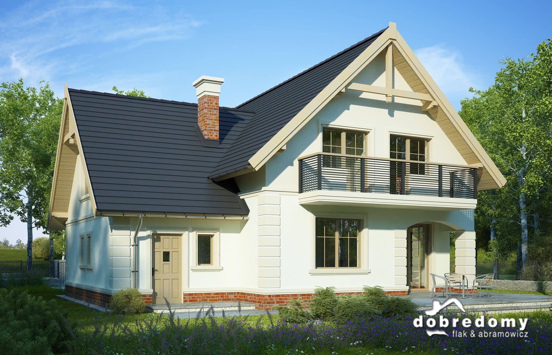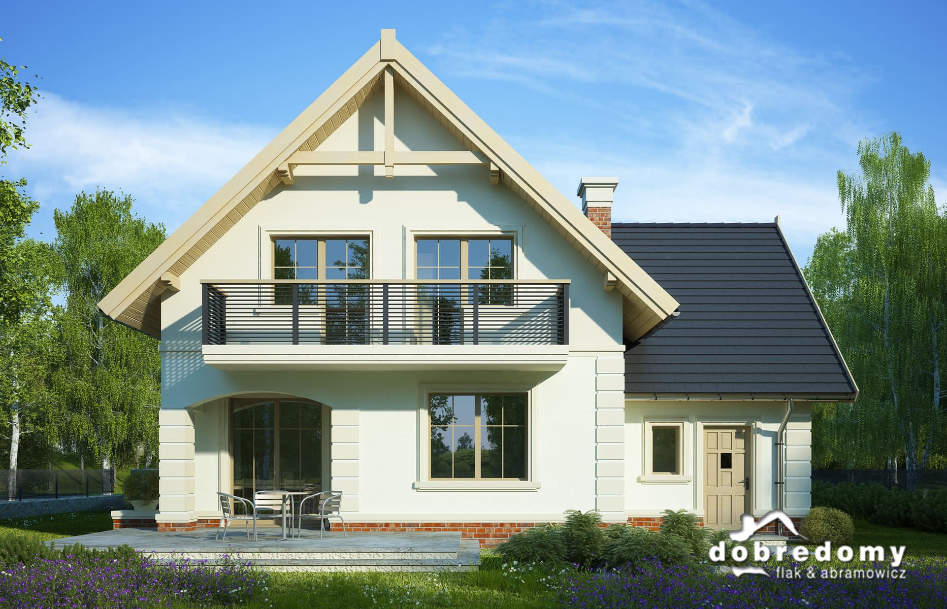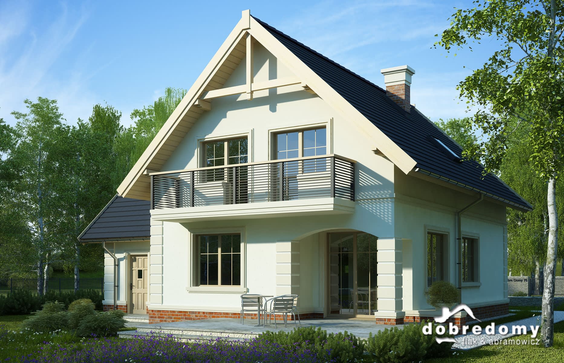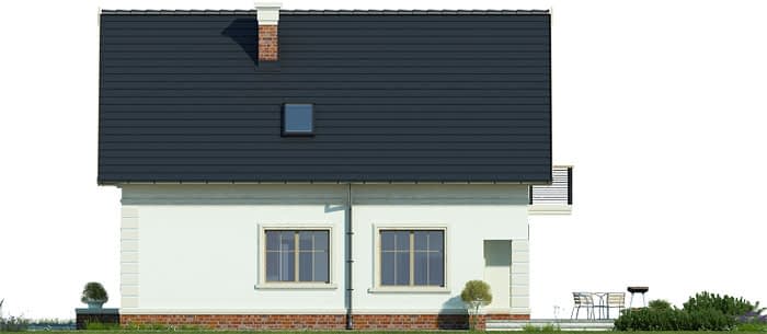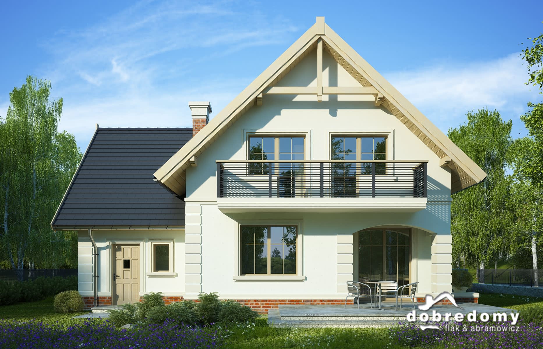 Dom z poddaszem użytkowym, przeznaczony dla 4-6-osobowej rodziny. Na parterze zaplanowano wyraźnie oddzieloną kuchnią, pokój dzienny połączony z jadalnią, łazienkę oraz dodatkowy pokój. Z wiatrołapu jest przejście do jednostanowiskowego garażu, a dalej do pomieszczenia gospodarczego. Poddasze to strefa nocna - z trzema pokojami i przestronną łazienką. Z dwóch sypialni jest wyjście na wspólny balkon. Projekt można wykorzystać do zabudowy bliźniaczej.