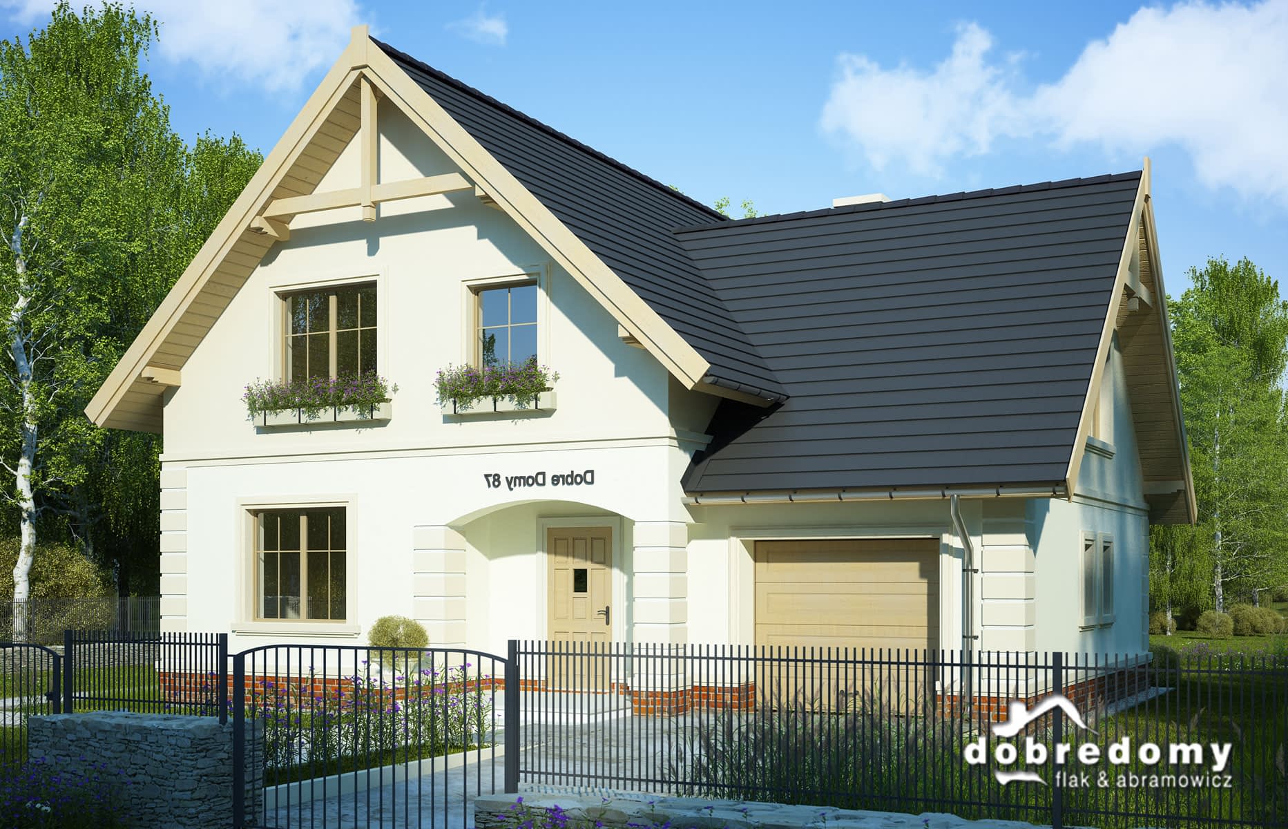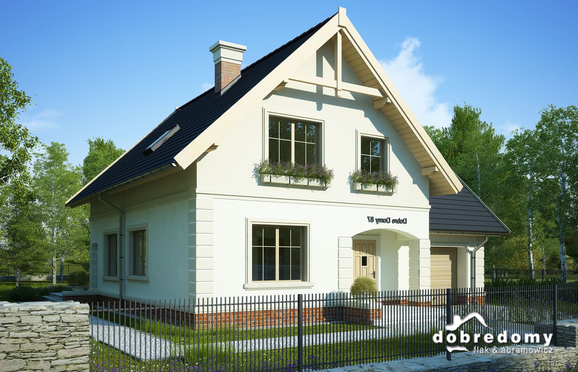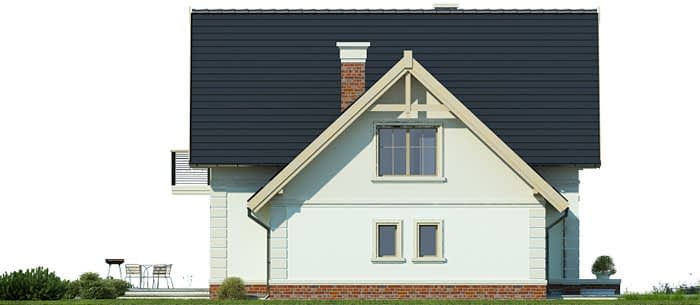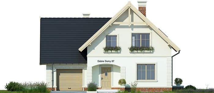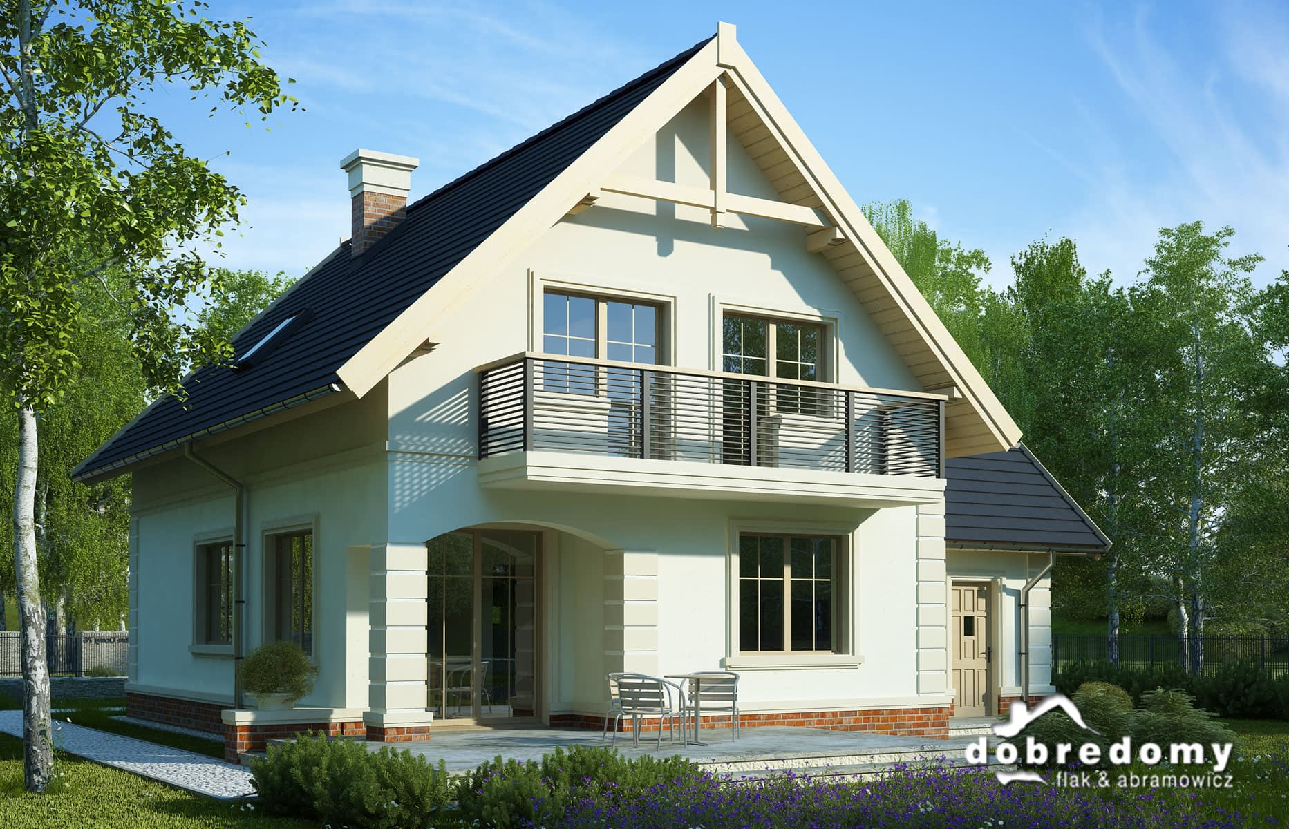 Dom z poddaszem użytkowym, przeznaczony dla 4-6-osobowej rodziny. Na parterze zaplanowano wyraźnie oddzieloną kuchnią, pokój dzienny połączony z jadalnią, łazienkę oraz dodatkowy pokój. Z wiatrołapu jest przejście do jednostanowiskowego garażu, a dalej do pomieszczenia gospodarczego. Poddasze to strefa nocna - z trzema pokojami i przestronną łazienką. Z dwóch sypialni jest wyjście na wspólny balkon. Projekt można wykorzystać do zabudowy bliźniaczej.