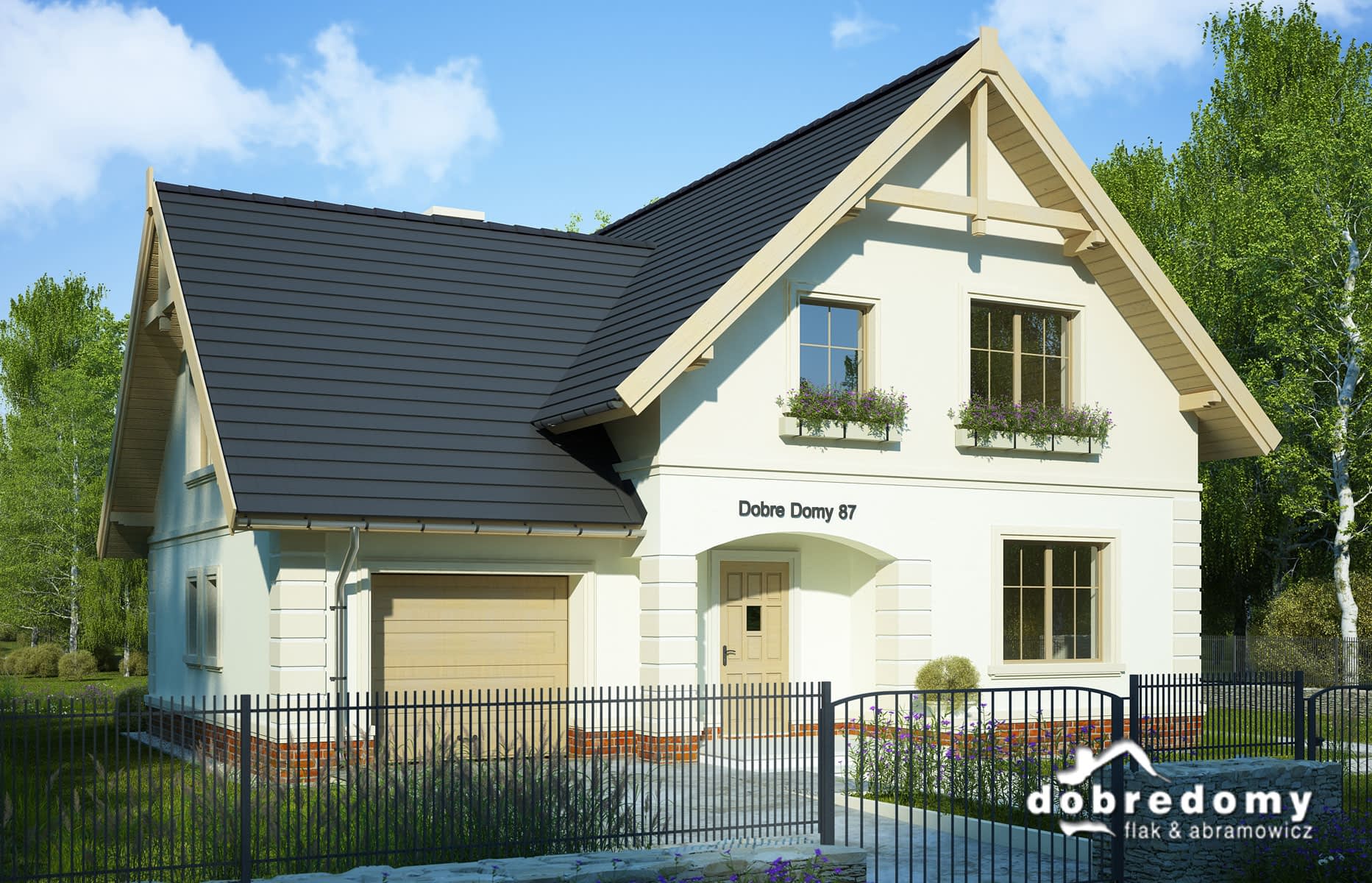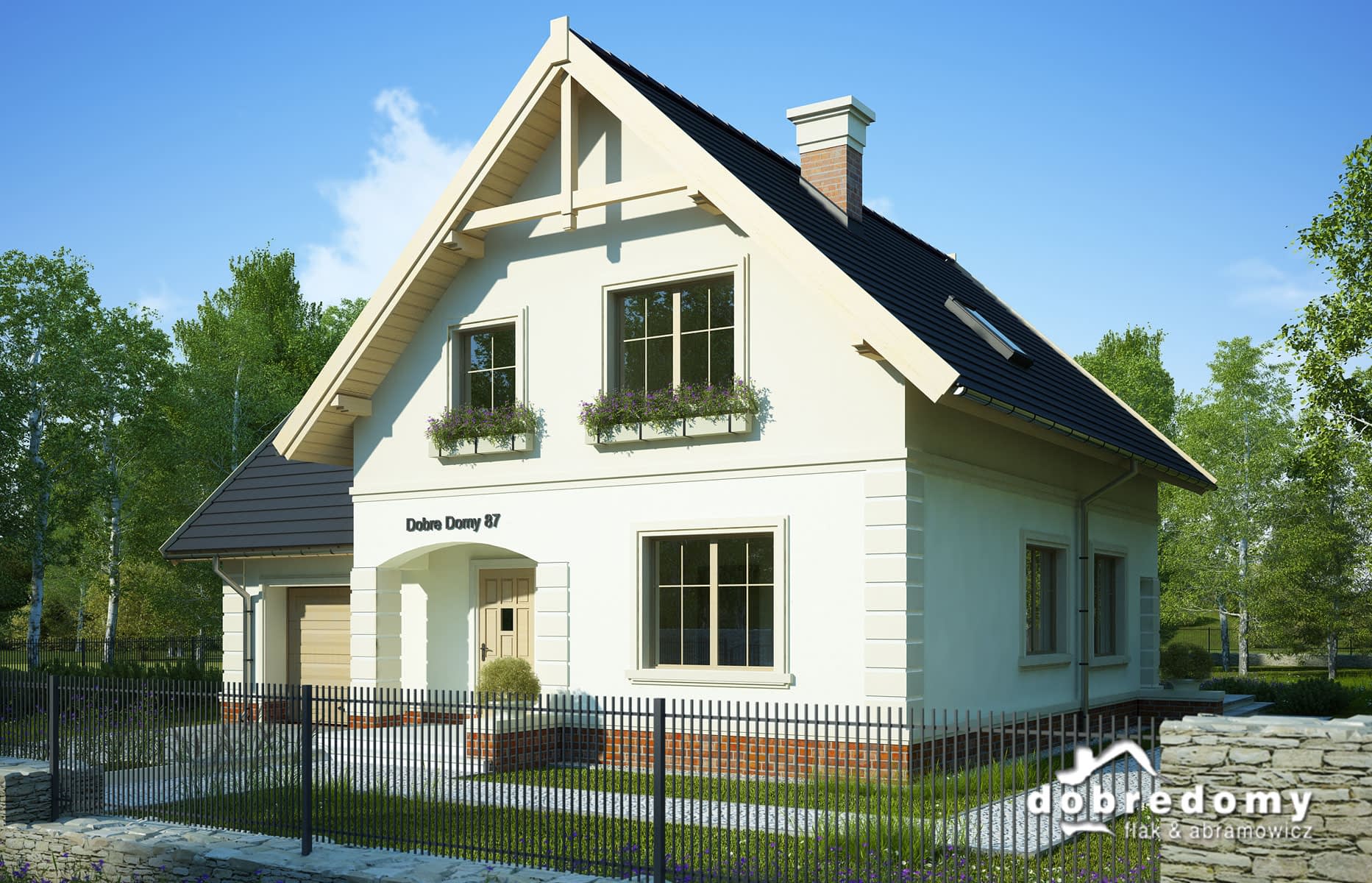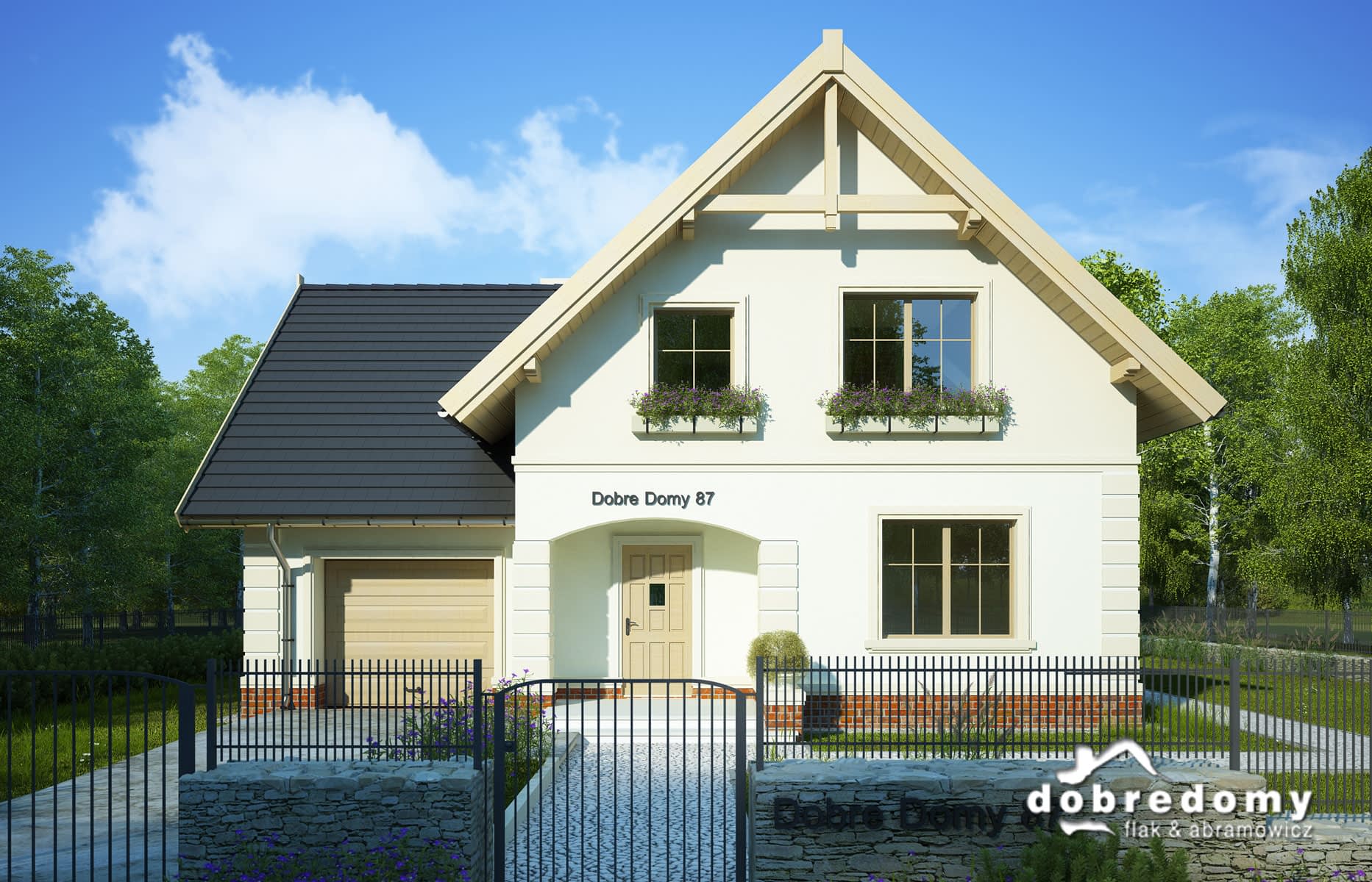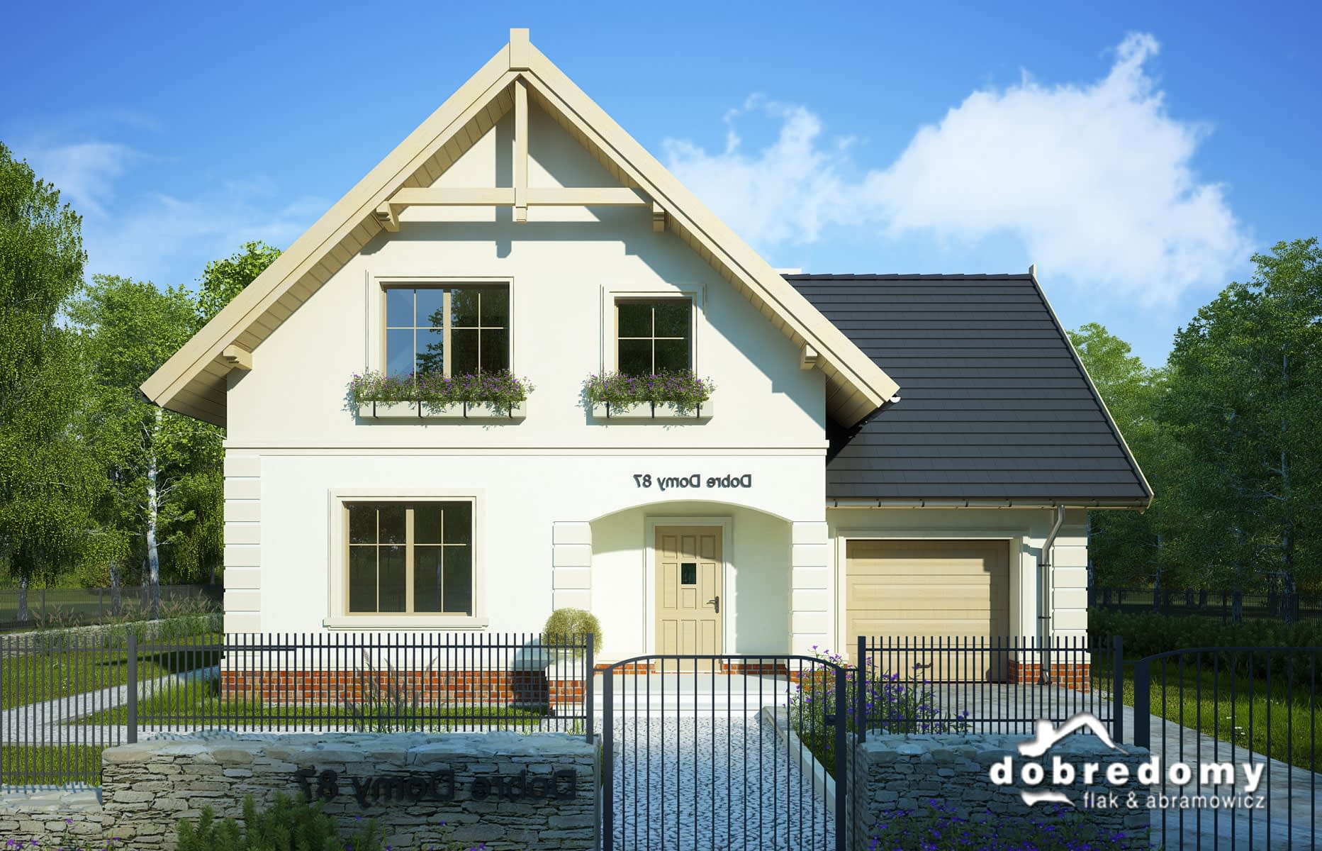 Dom z poddaszem użytkowym, przeznaczony dla 4-6-osobowej rodziny. Na parterze zaplanowano wyraźnie oddzieloną kuchnią, pokój dzienny połączony z jadalnią, łazienkę oraz dodatkowy pokój. Z wiatrołapu jest przejście do jednostanowiskowego garażu, a dalej do pomieszczenia gospodarczego. Poddasze to strefa nocna - z trzema pokojami i przestronną łazienką. Z dwóch sypialni jest wyjście na wspólny balkon. Projekt można wykorzystać do zabudowy bliźniaczej.