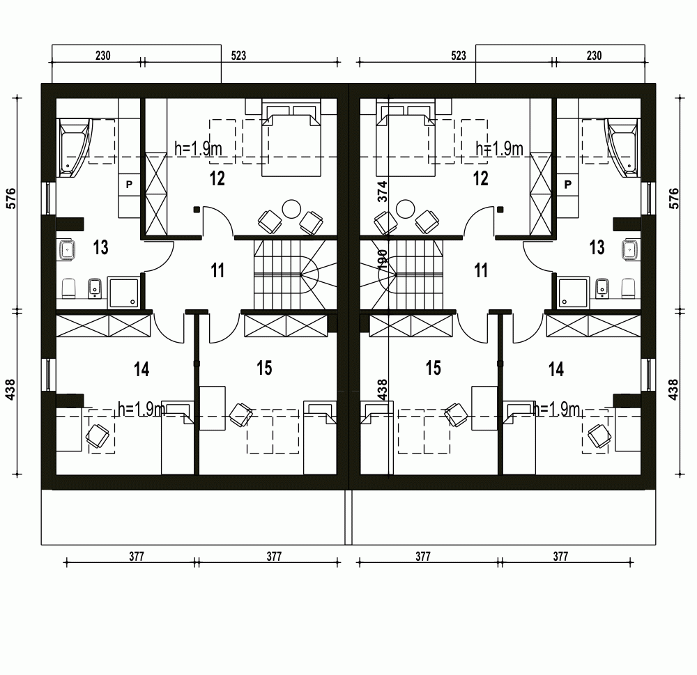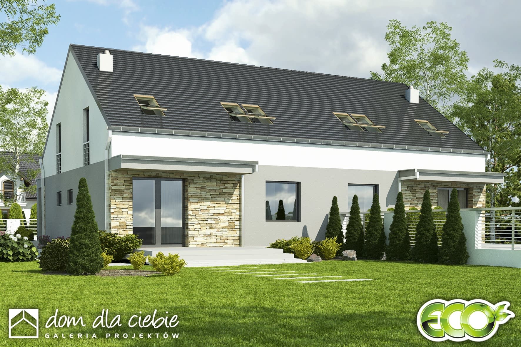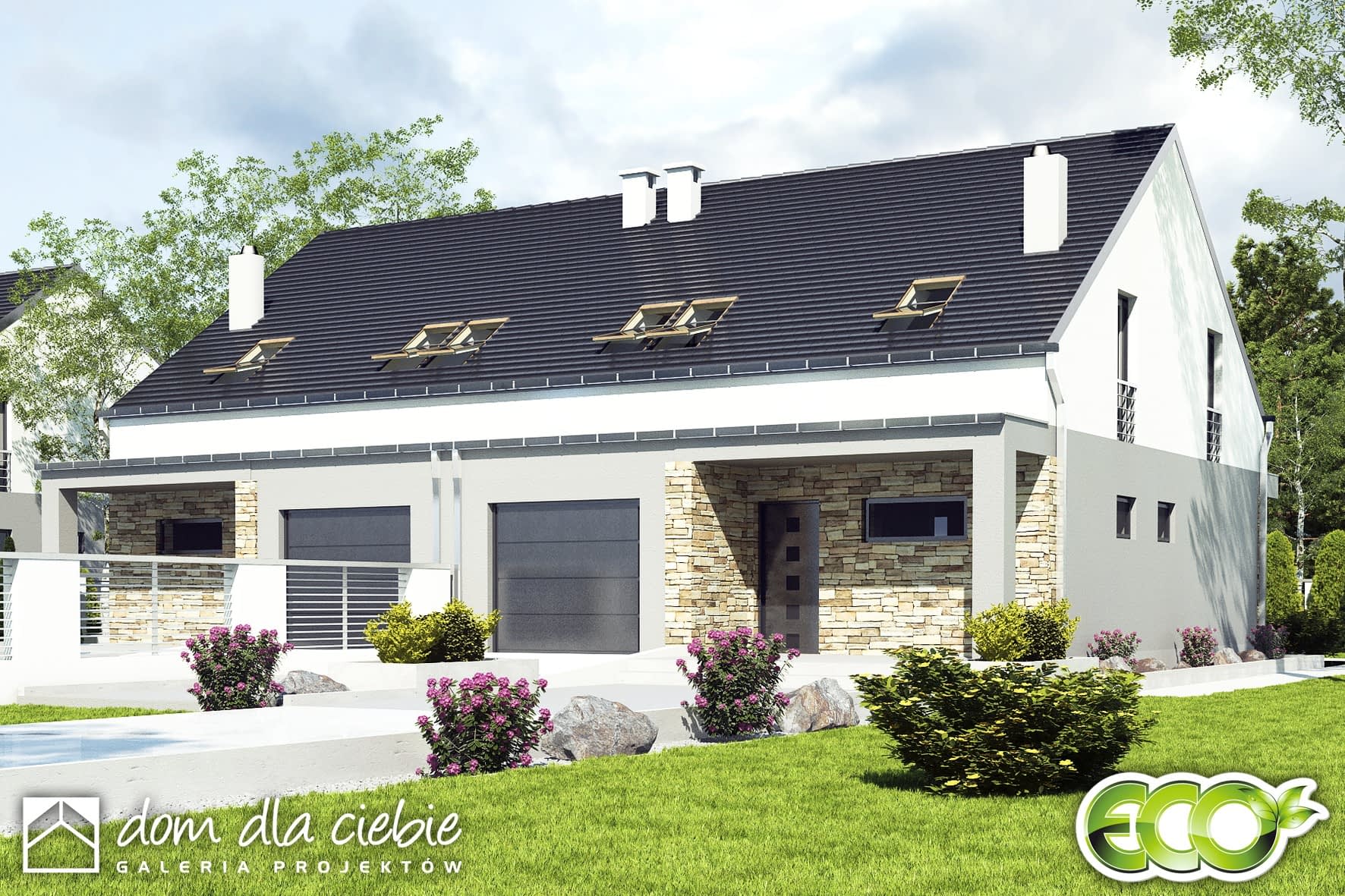 (Uwaga: projekty typu bliźniak oferujemy jako domy dwulokalowe, projekt można zamówić również w zabudowie bliźniaczej)Opis dotyczy jednego segmentu:Propozycja Mazurek II to niewielki, komfortowy dom z garażem na jedno auto. Projekt poprzez prostą konstrukcję i zwartą bryłę stawia na ekonomię zarówno podczas budowy jak i w eksploatacji. Mazurek II dedykowany jest dla 4-5 osobowej rodziny. Parter budynku to salon połączony z kuchnią i jadalnią, pokój mogący pełnić rolę gabinetu lub pokoju gościnnego, nieduża łazienka, pomieszczenie techniczne z piecem. Pod schodami prowadzącymi na piętro wygospodarowano miejsce na spiżarnię albo garderobę. Piętro to 3 sypialnie, łazienka z miejscem na pralkę. Projekt przewidziany jest do zabudowy wolnostojącej, bliźniaczej oraz szeregowej.