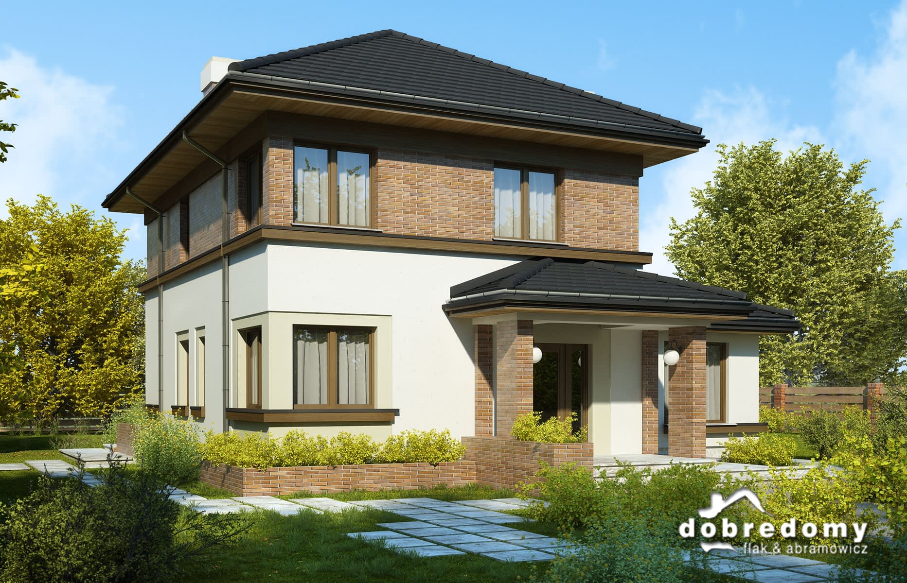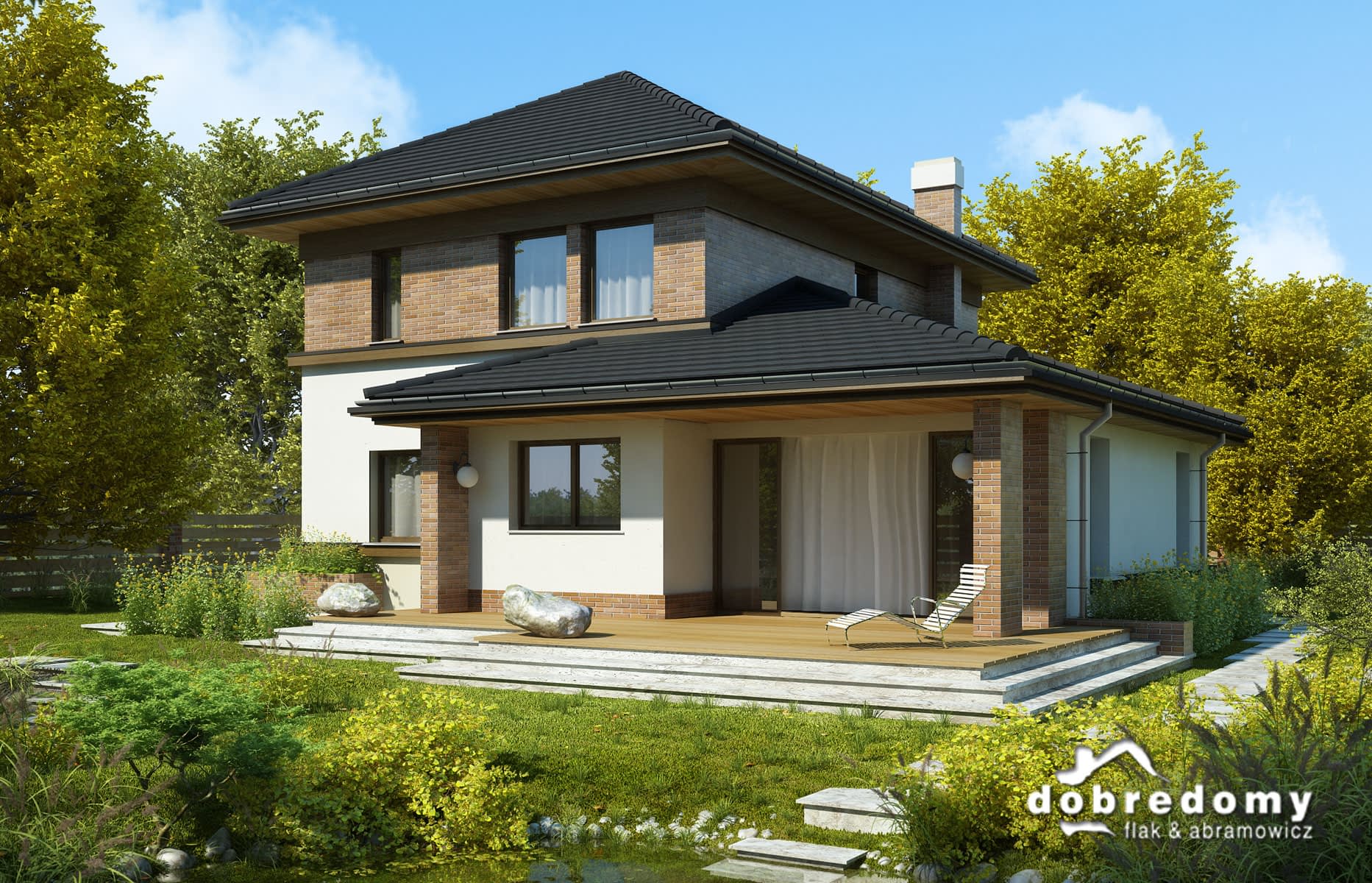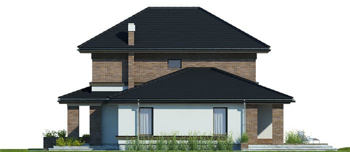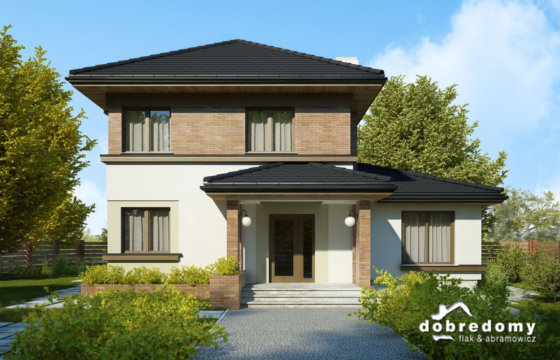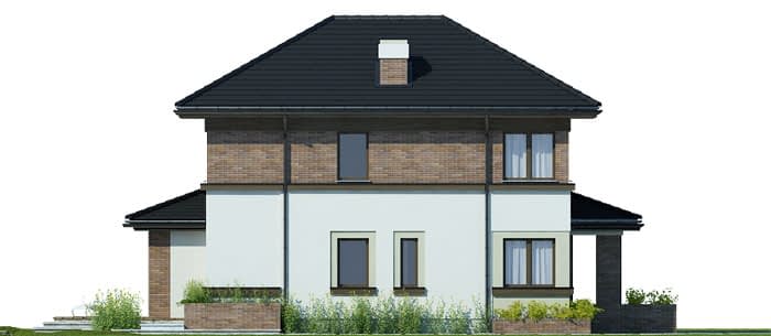 Elewacje pokryte tynkiem strukturalnym w systemie ociepleń Termo Organika oraz okładziną klinkierową. Pokrycie dachu - dachówka ceramiczna lub cementowa - CREATON.