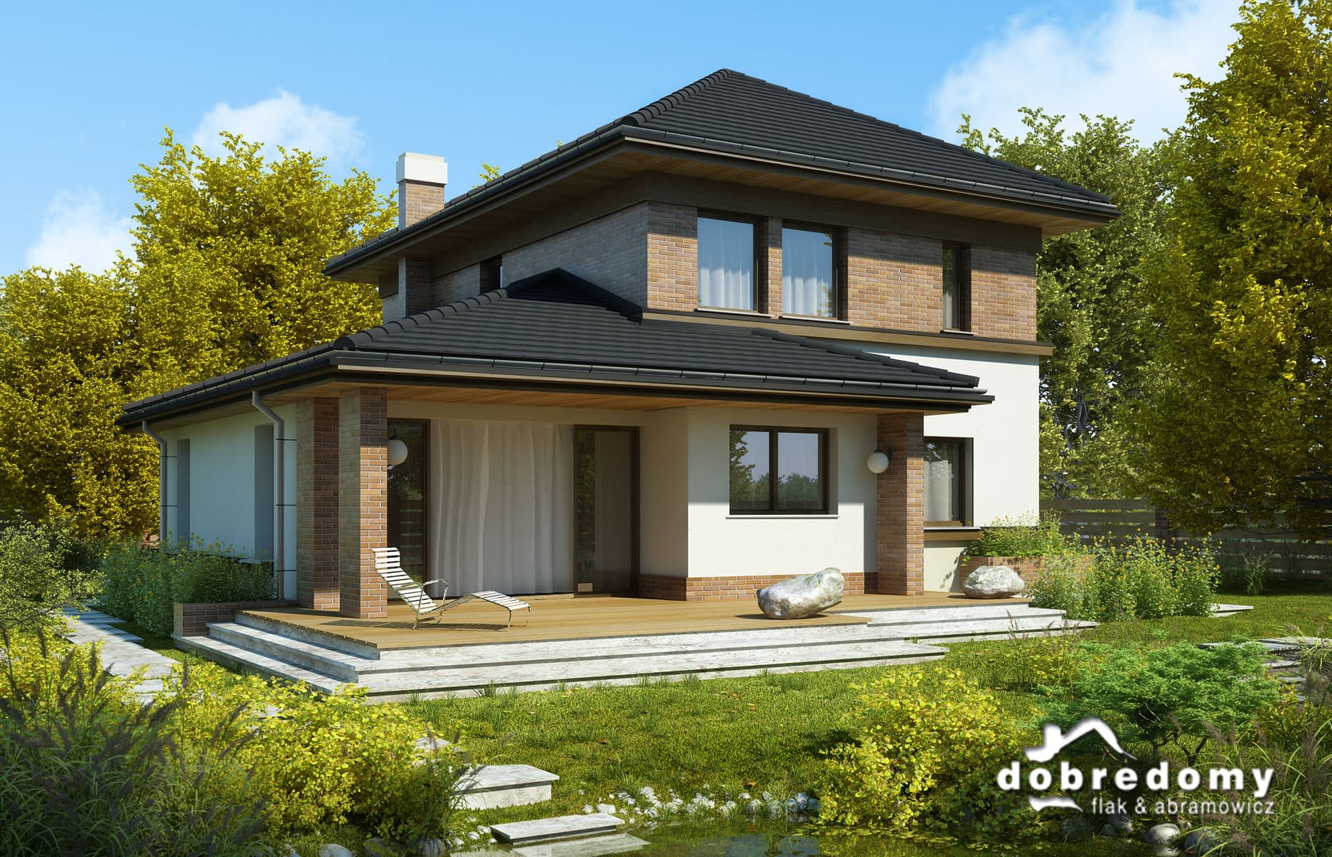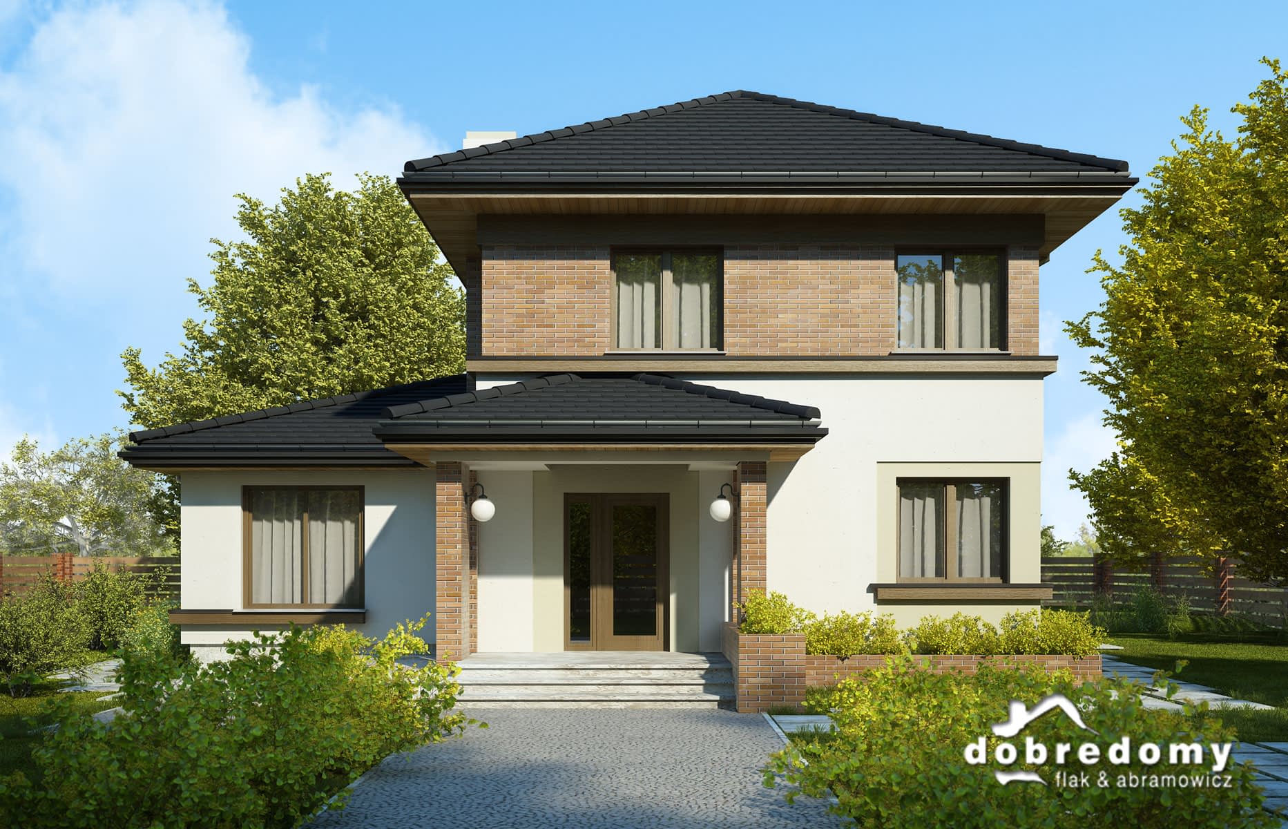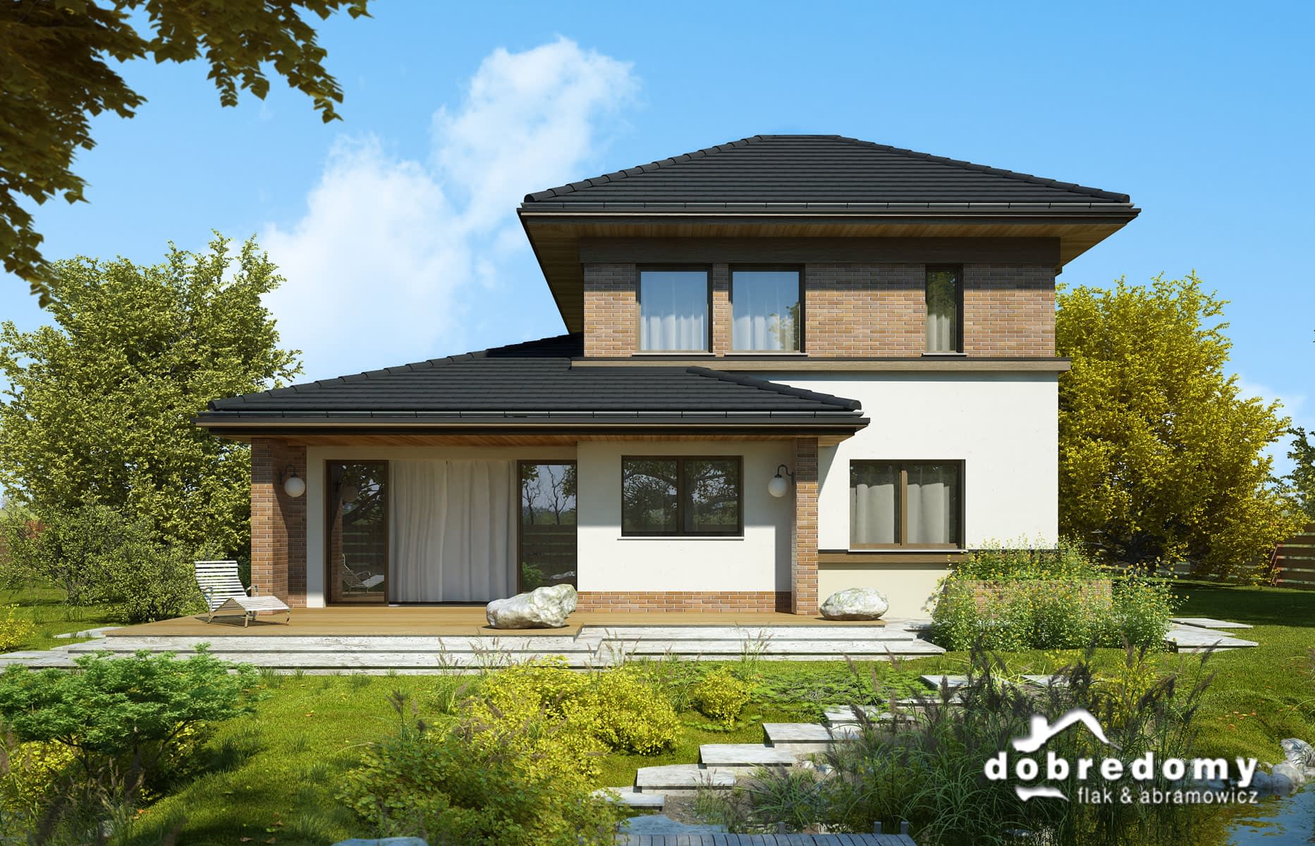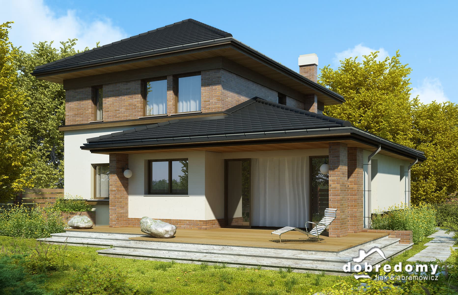 Elewacje pokryte tynkiem strukturalnym w systemie ociepleń Termo Organika oraz okładziną klinkierową. Pokrycie dachu - dachówka ceramiczna lub cementowa - CREATON.