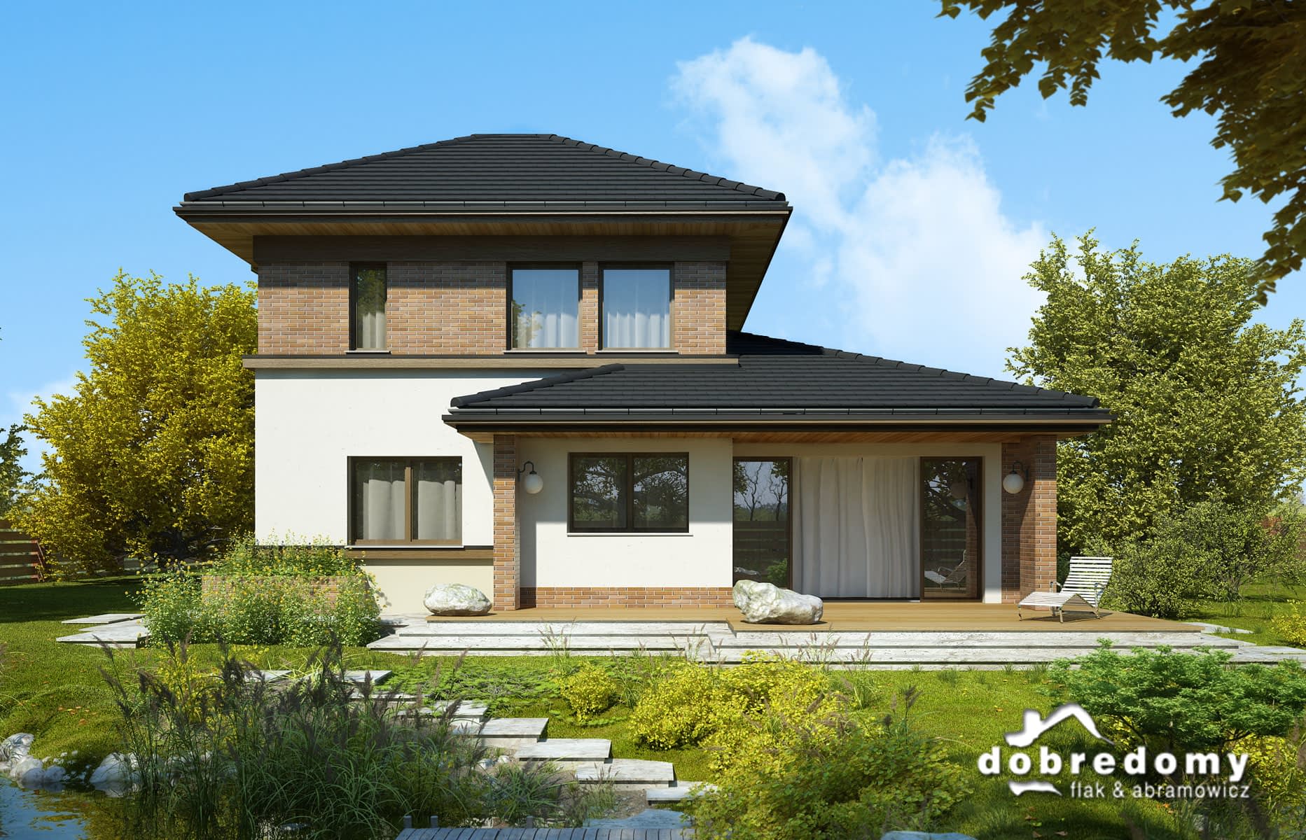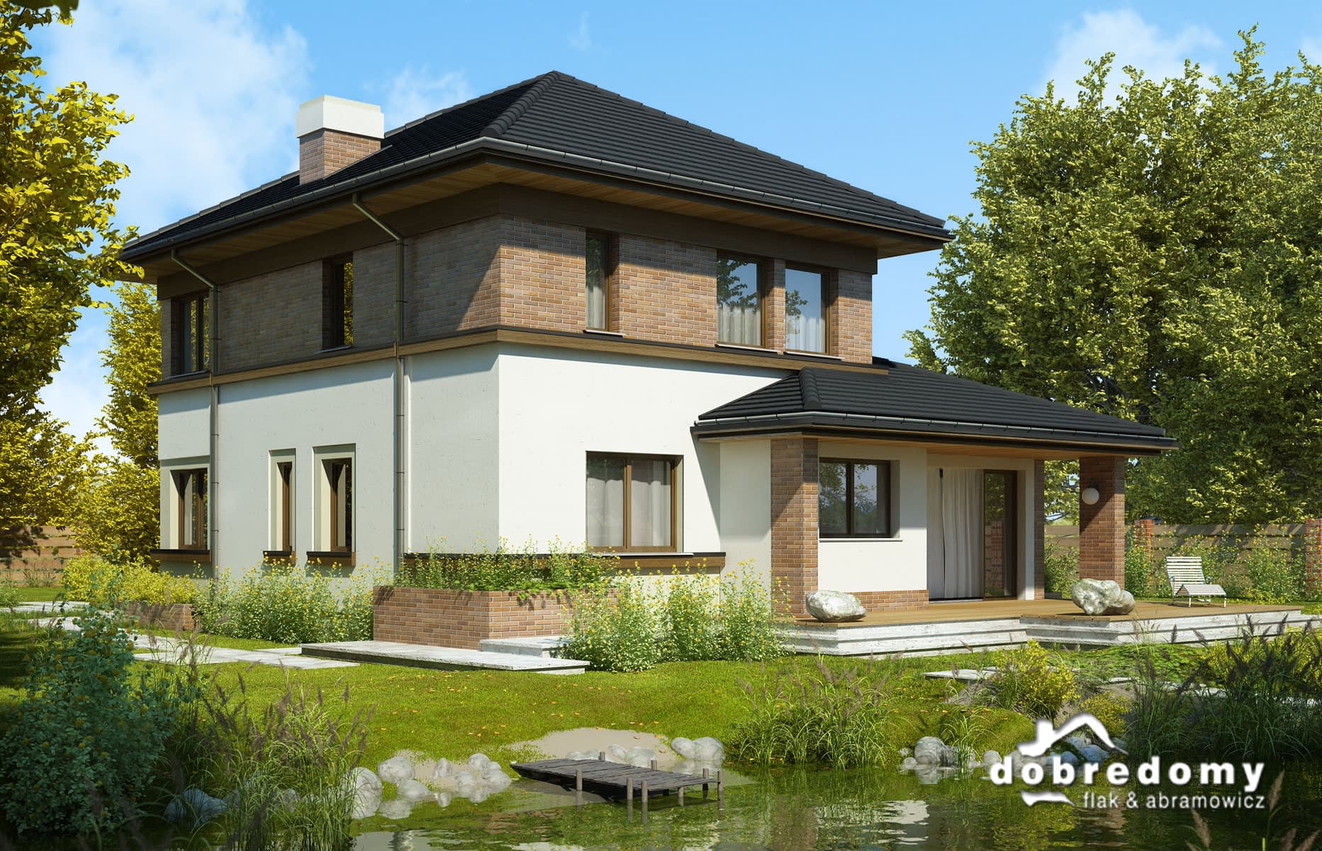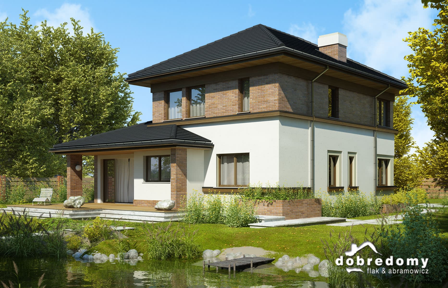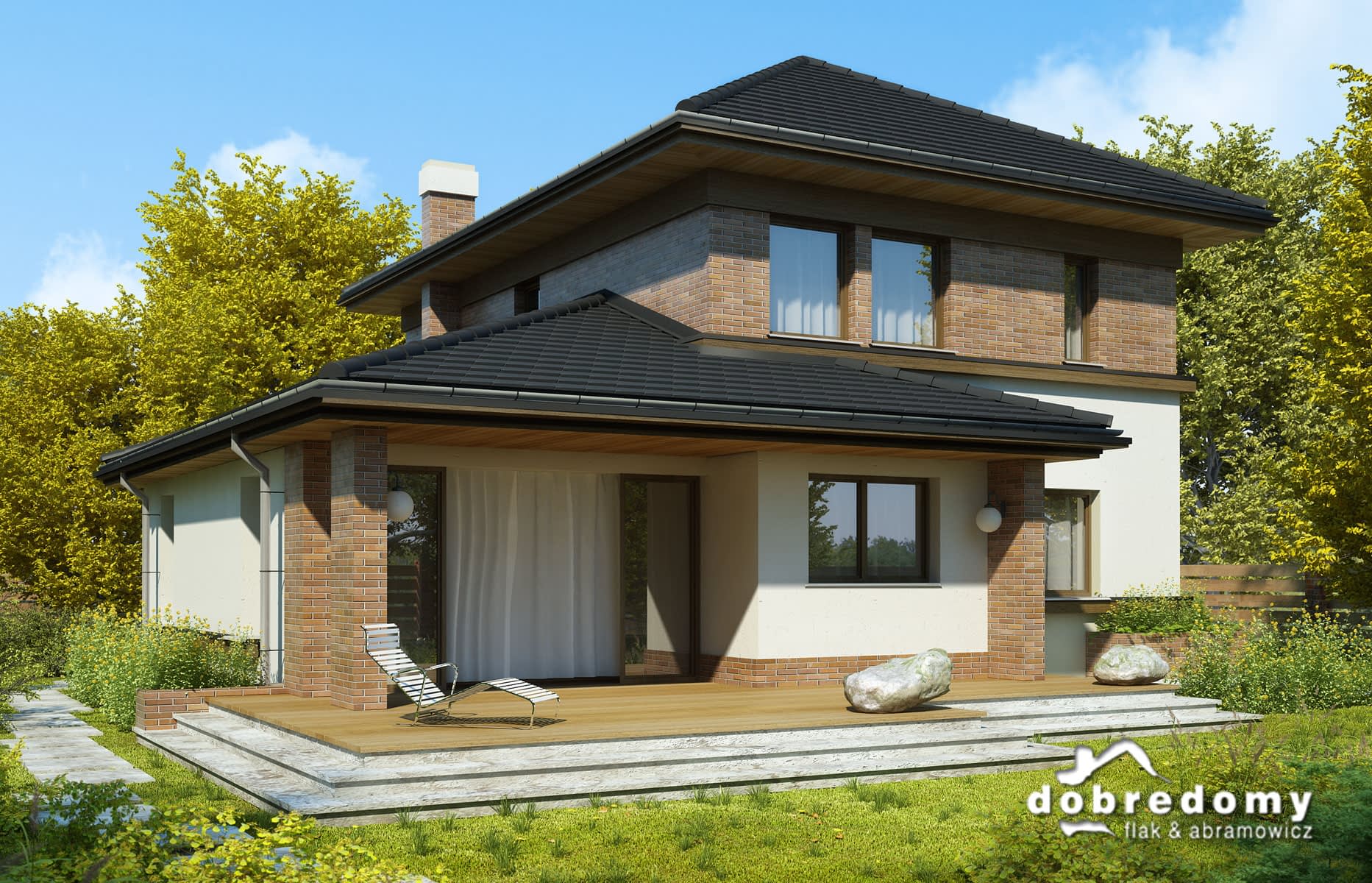 Elewacje pokryte tynkiem strukturalnym w systemie ociepleń Termo Organika oraz okładziną klinkierową. Pokrycie dachu - dachówka ceramiczna lub cementowa - CREATON.