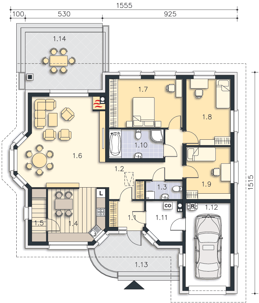 Parterowy dom energooszczędny z wkomponowanym w bryłę garażem na jedno stanowisko. Wnętrze rozplanowano z myślą o wygodzie mieszkańców, którzy mają do dyspozycji doskonale doświetlony salon z dekoracyjnym wykuszem, z którego można wyjść na taras. Jest też duża kuchnia, pojemna spiżarnia, trzy ustawne sypialnie, łazienka, wc i pomieszczenie gospodarcze, w którym przewidziano kocioł gazowy oraz wiatrołap z miejscem na podręczną szafę na ubrania. Uwagę zwraca częściowo zadaszone wejście do domu, dzięki czemu jest ono chronione przed deszczem i śniegiem.
