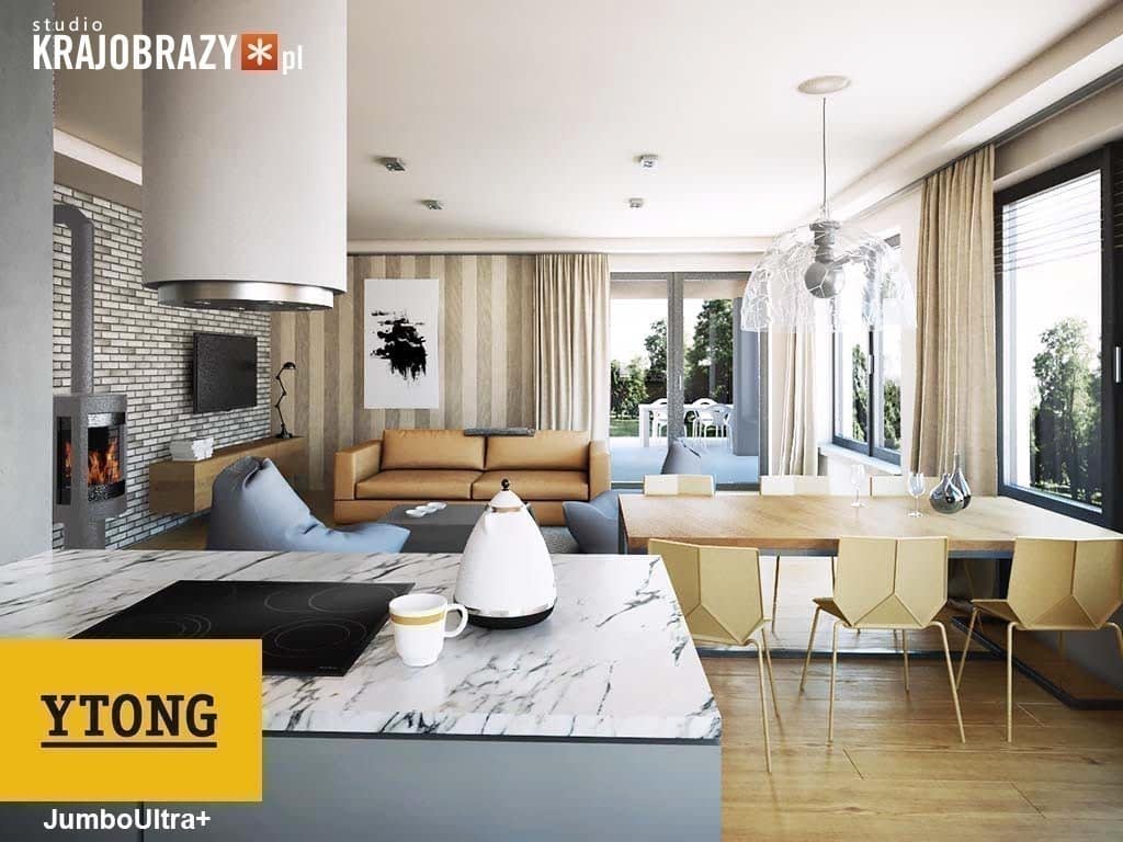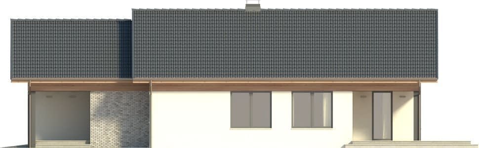 Mestre w wersji Ytong to parterowy dom z garażem dwustanowiskowym, o wydłużonym wgłąb działki rzucie. Główne okna w części dziennej umieszczone są w bocznej elewacji, dzięki czemu można go z powodzeniem ustawić na działce nawet z dojazdem od południa. Zarówno od frontu nad wejściem, jak i od ogrodu nad tarasem zaprojektowane są nadwieszenia wsparte na słupach, dzięki czemu obie te strefy zyskały bardzo praktyczne zadaszenia. Wnętrze domu jest podzielone na trzy strefy: frontową z podwójnym garażem, kotłownią i garderobą przy wiatrołapie, jednoprzestrzenną dzienną z kuchnią z wyspą oraz nocną odzieloną korytarzem i zawierającą trzy sypialnie oraz dwie łazienki. Gotowy projekt tego domu można zakupić w wersji standard lub lustro.Rzuty