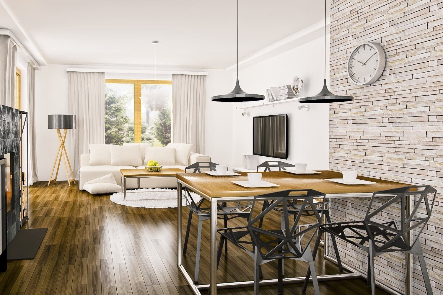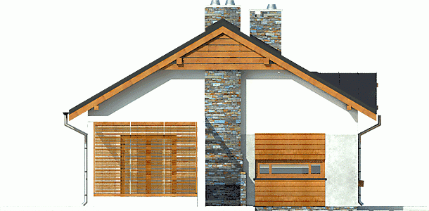 Projekt niewielkiego, nowoczesnego domu jednorodzinnego, parterowego dla 3 do 4 osób. Prosta forma budynku z dwuspadowym dachem zapewnia utrzymanie niskich kosztów budowy. Nieduża powierzchnia domu daje możliwość podziału powierzchni, na część ogólną, w której zaprojektowano salon z kominkiem, kuchnią ze spiżarnią i wydzieloną toaletą oraz cześć prywatną z dwoma pokojami i łazienką. W projekcie przewidziano kotłownię na piec na paliwo stałe, co pozwoli zaoszczędzić na kosztach ogrzewania domu.