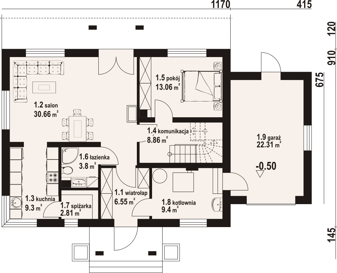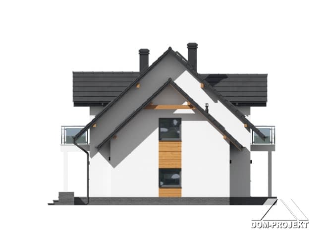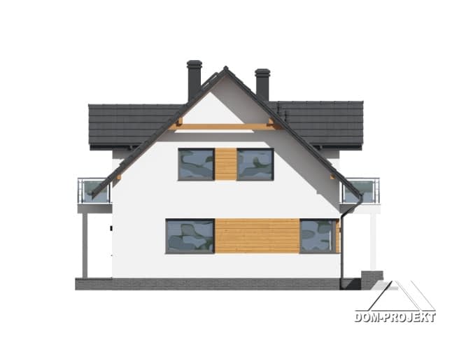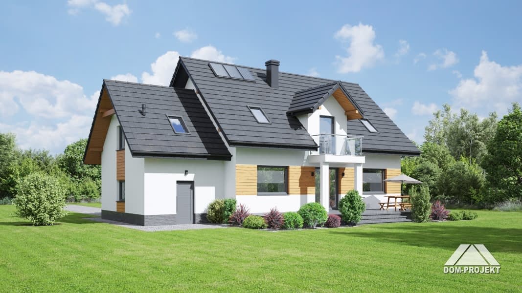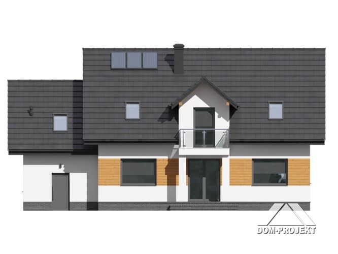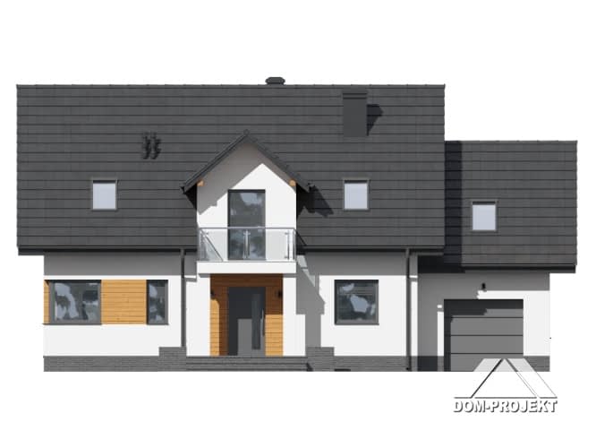 Przyjemny dom o prostej bryle i dobrych proporcjach architektonicznych. Na parterze salon z kominkiem posiadający bezpośrednie połączenie z kuchnią. Z kuchni dostępna spiżarka. Dodatkowy pokój na parterze może pełnić funkcję sypialni lub gabinetu. Ponadto na parterze zaprojektowano łazienkę i kotłownię, oraz dostępny z niej jednostanowiskowy garaż. Na poddaszu znajdziemy aż pięć przestronnych sypialni, dużą garderobę i łazienkę.Rzuty