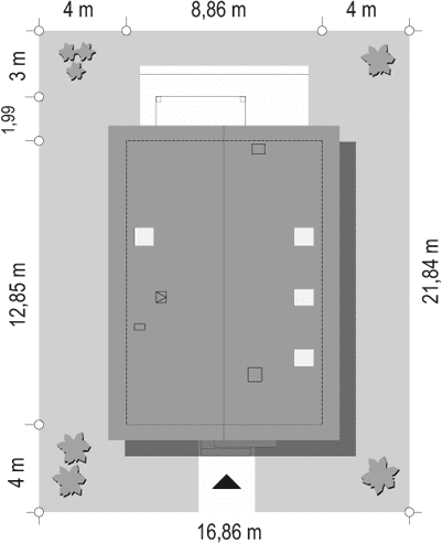 - Minimalne wymiary działki21.84 x 16.86m