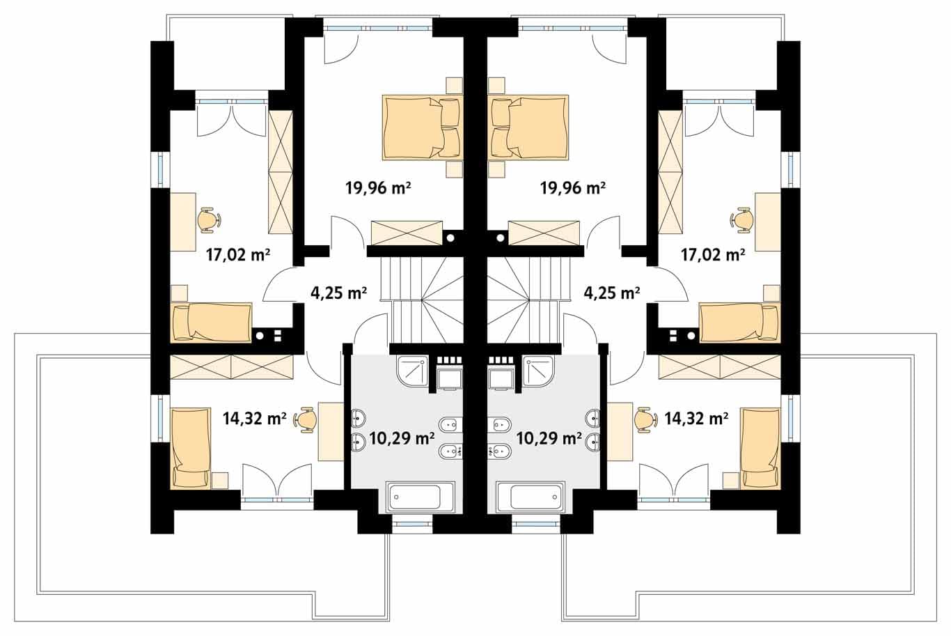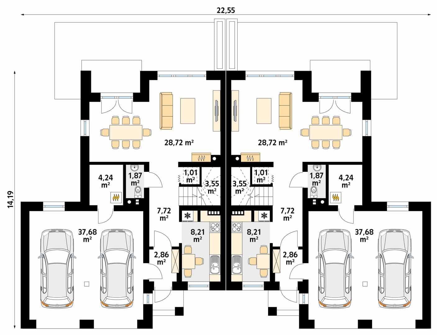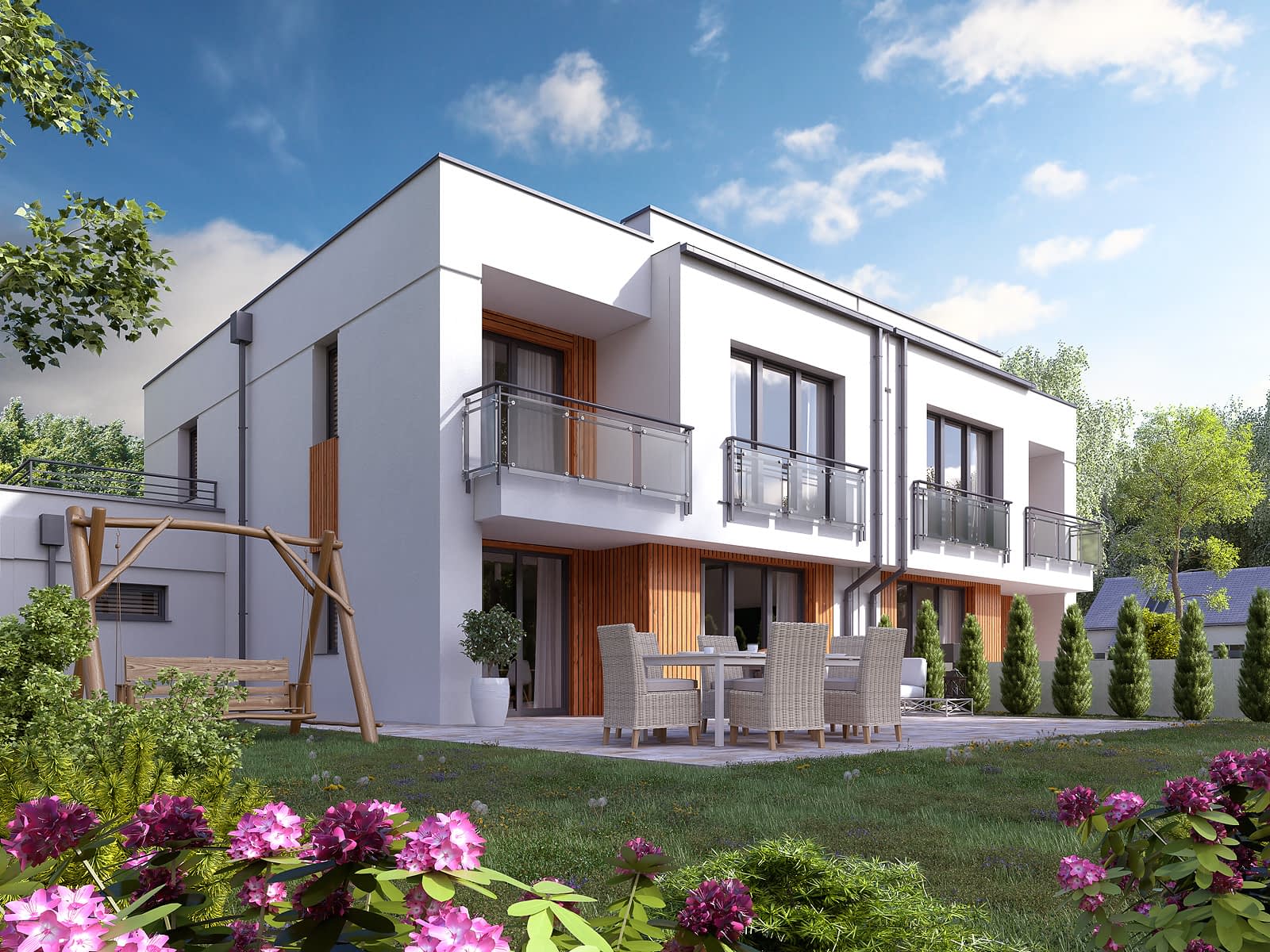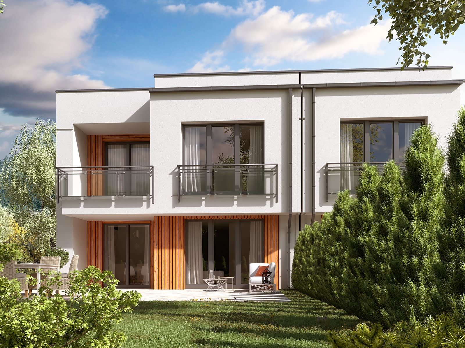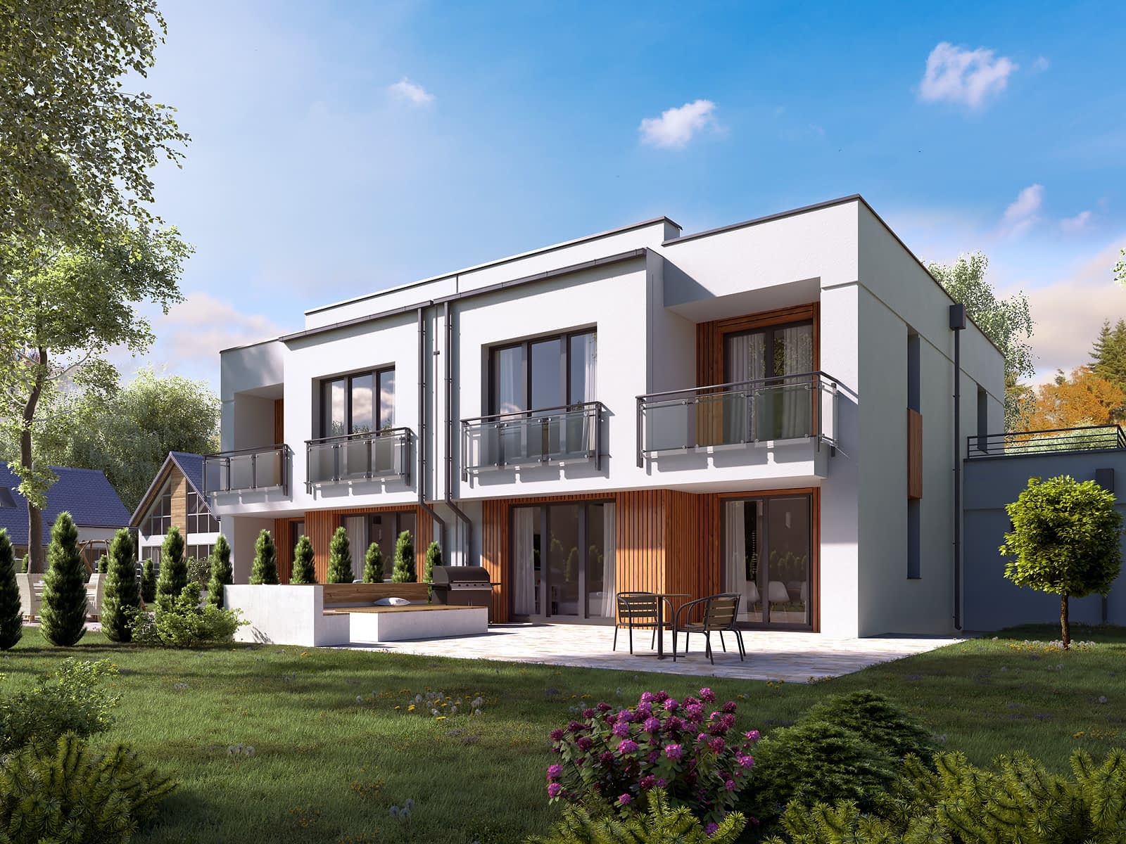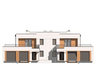 Miętowy to projekt piętrowego domu jednorodzinnego w zabudowie bliźniaczej przeznaczonego dla 4 osobowej rodziny. Projekt charakteryzuje się nowoczesnym designem z płaskim dachem i rozległymi tarasami. Układ funkcjonalny domu został podzielony na dwie strefy. Na parterze zaprojektowano strefę dzienną z salonem, jadalnią i kuchnią. Program funkcjonalny parteru uzupełnia łazienka, pomieszczenie gospodarcze pod schodami oraz kotłownia gazowa z wejściem przez garaż. Na piętrze znajdują się 3 pokoje oraz rodzinna łazienka. W bryle budynku zaprojektowano także dwustanowiskowy garaż, nad którym znajduje się duży taras. Elewacja budynku została wykończona białym tynkiem, bez dodatkowych zdobień, nadając budynkowi minimalistycznego, modernistycznego charakteru.Konstrukcja