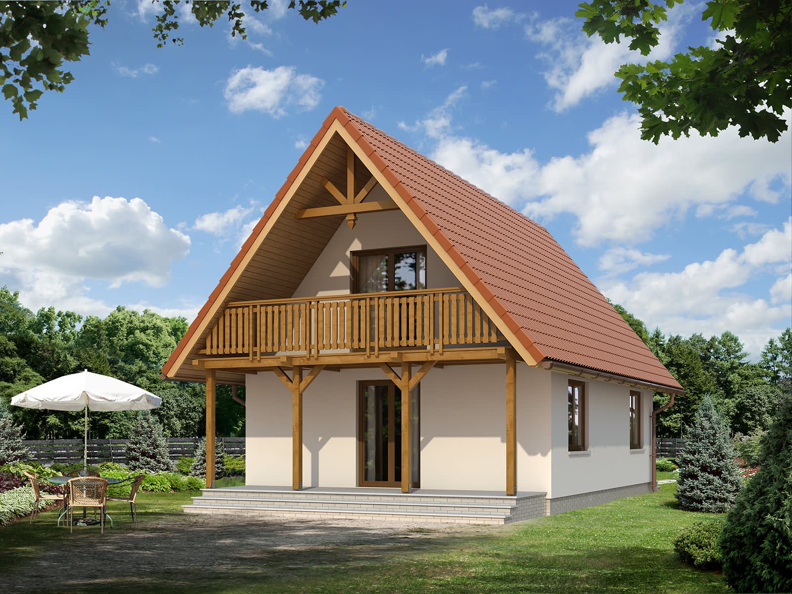 Jeden z najmniejszych domków jednorodzinnych z tarasami przy ścianach szczytowych. Budynek o prostej konstrukcji, łatwy w budowie. Funkcjonalny układ wnętrza. Możliwość ogrzewania kominkiem.Konstrukcja
